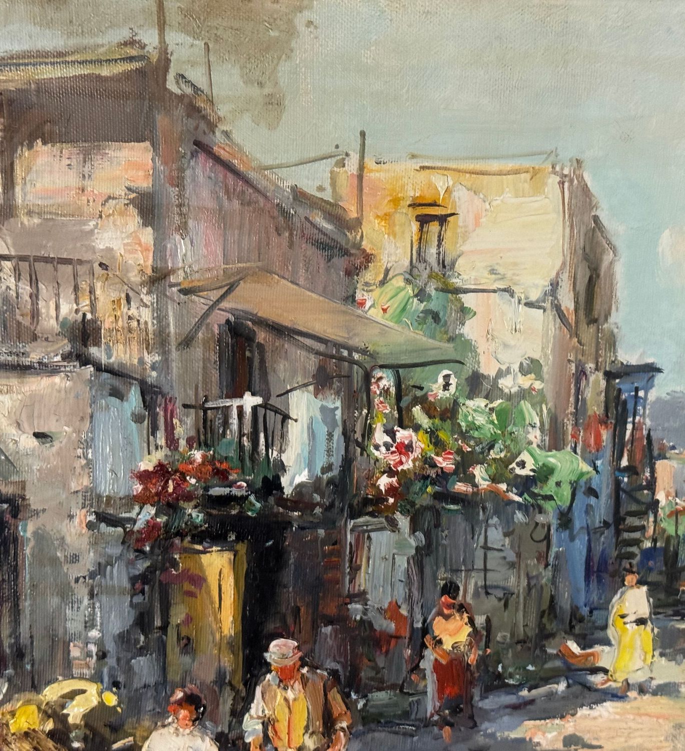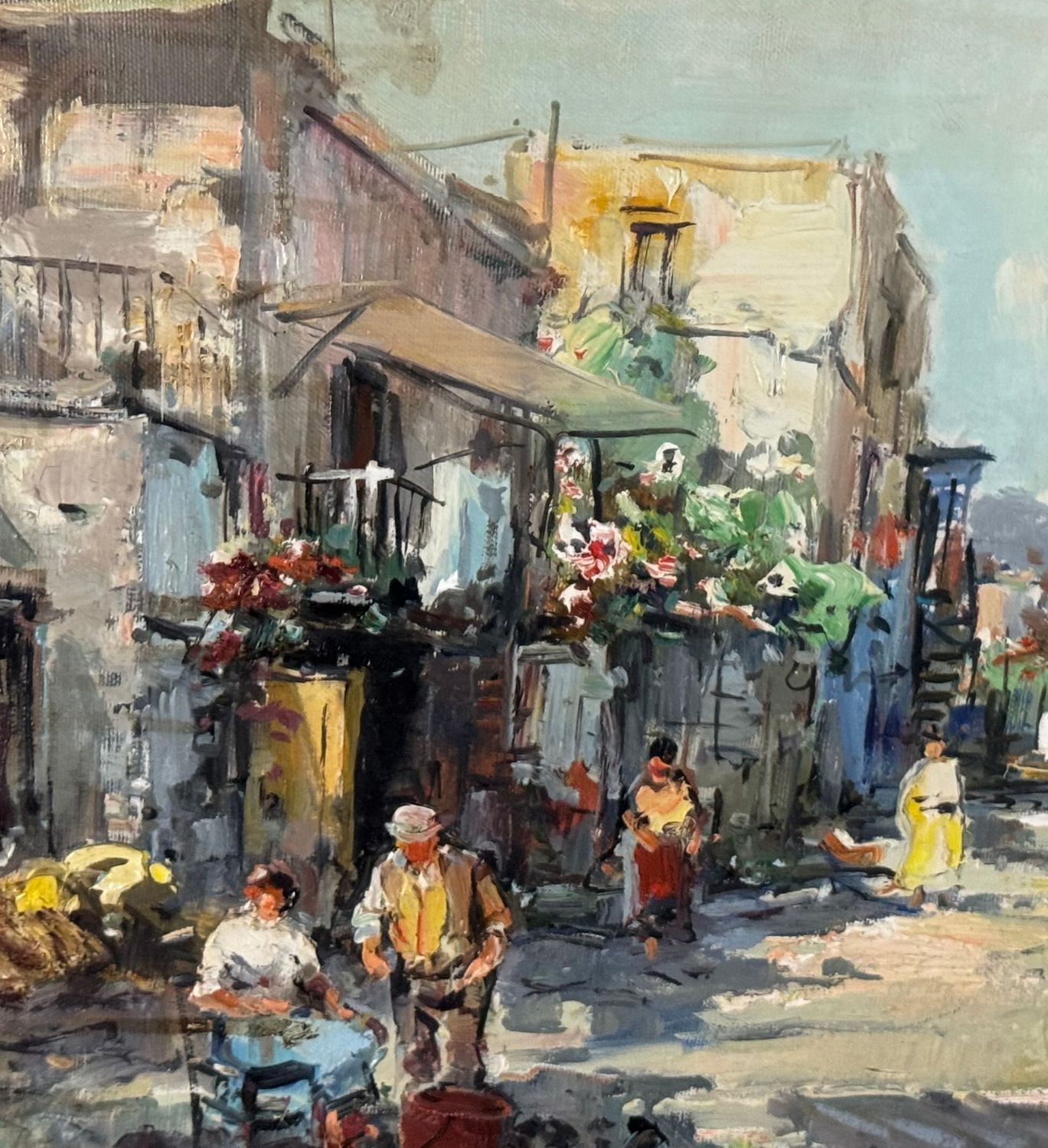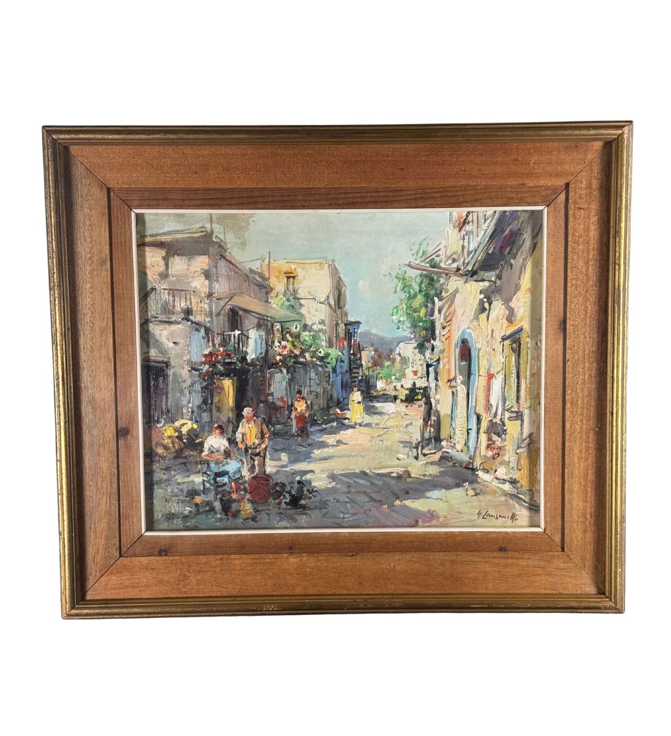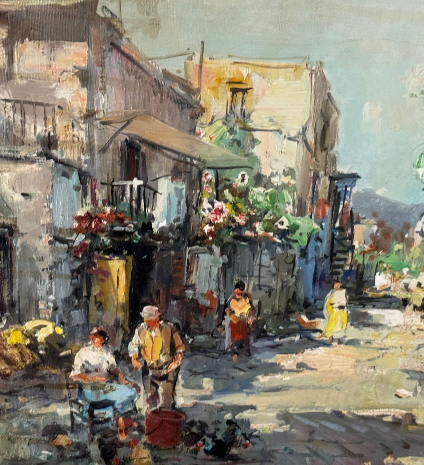 Dipinto olio su tela, periodo XX secolo scuola Italiana raffigurante Strada di periferia con personaggi. Dimensioni compreso cornice: 68x58 cm. Dimensioni interno cornice: 50x40 cm. Firmato in basso a destra Nicola Canzanella. Opera in buone condizioni.