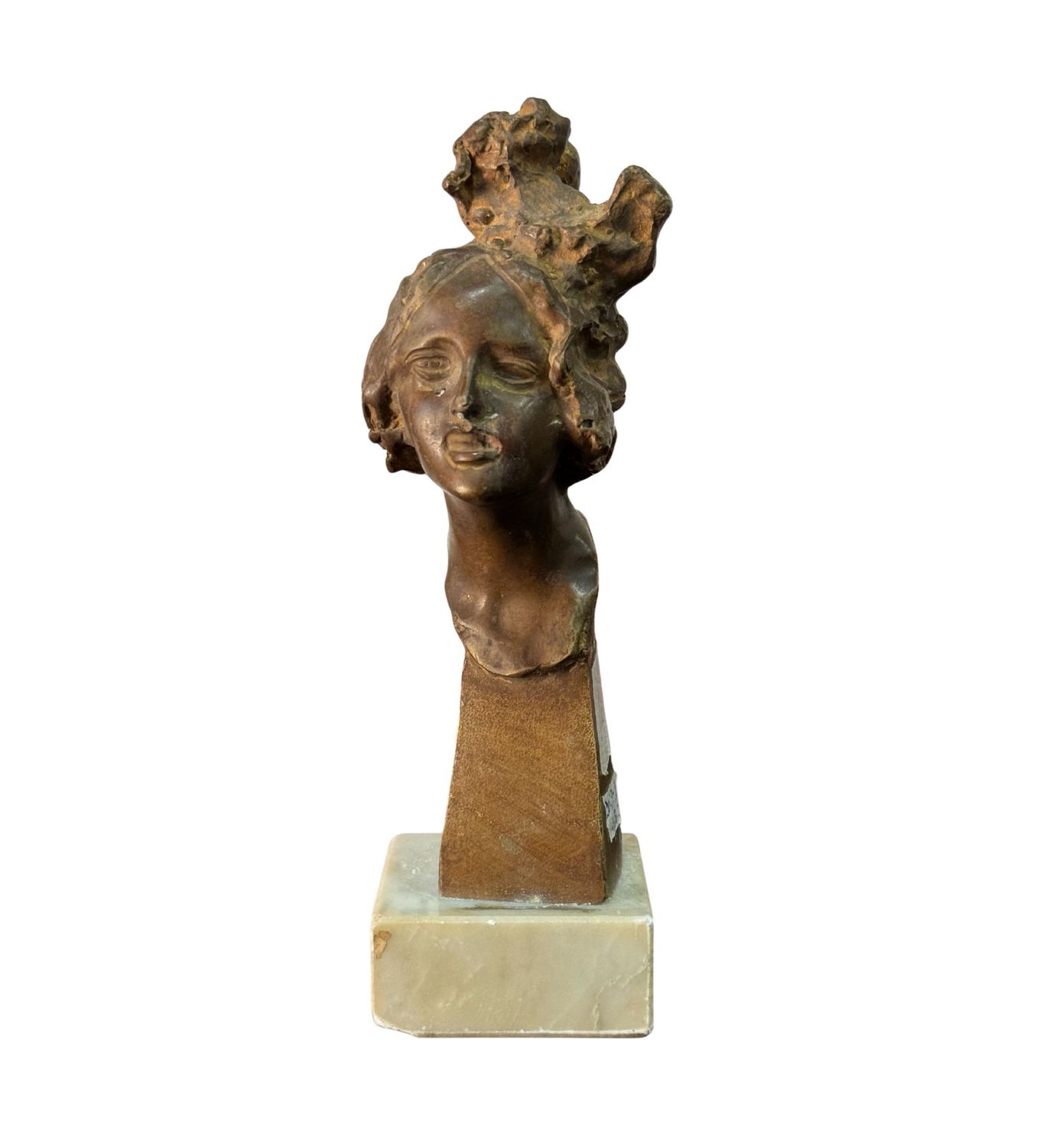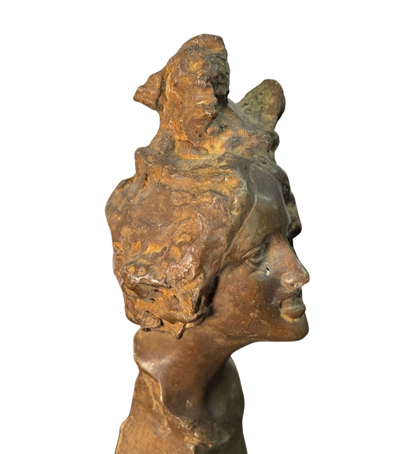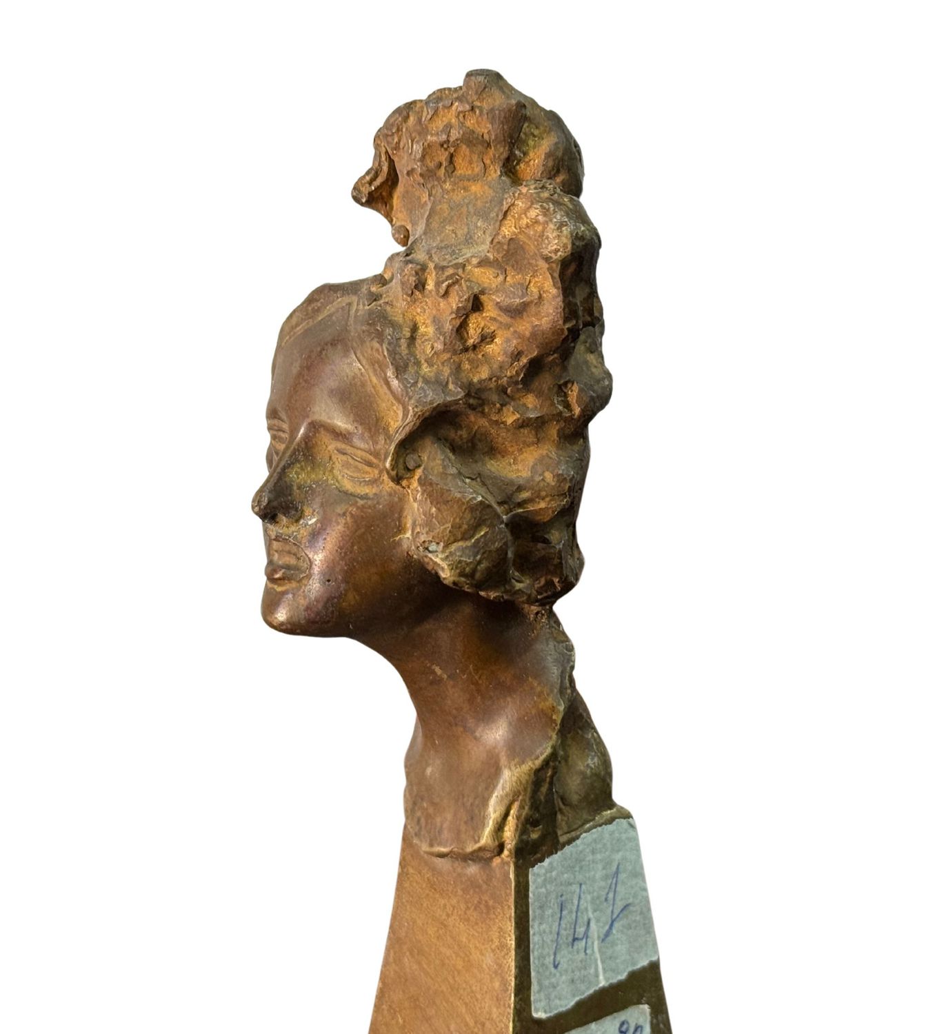 Scultura in bronzo a cera persa, periodo XX secolo, raffigurante Busto femminile. Dimensioni: 20x6x6 cm. Firma laterale a sinistra Renda. Opera in buone condizioni.