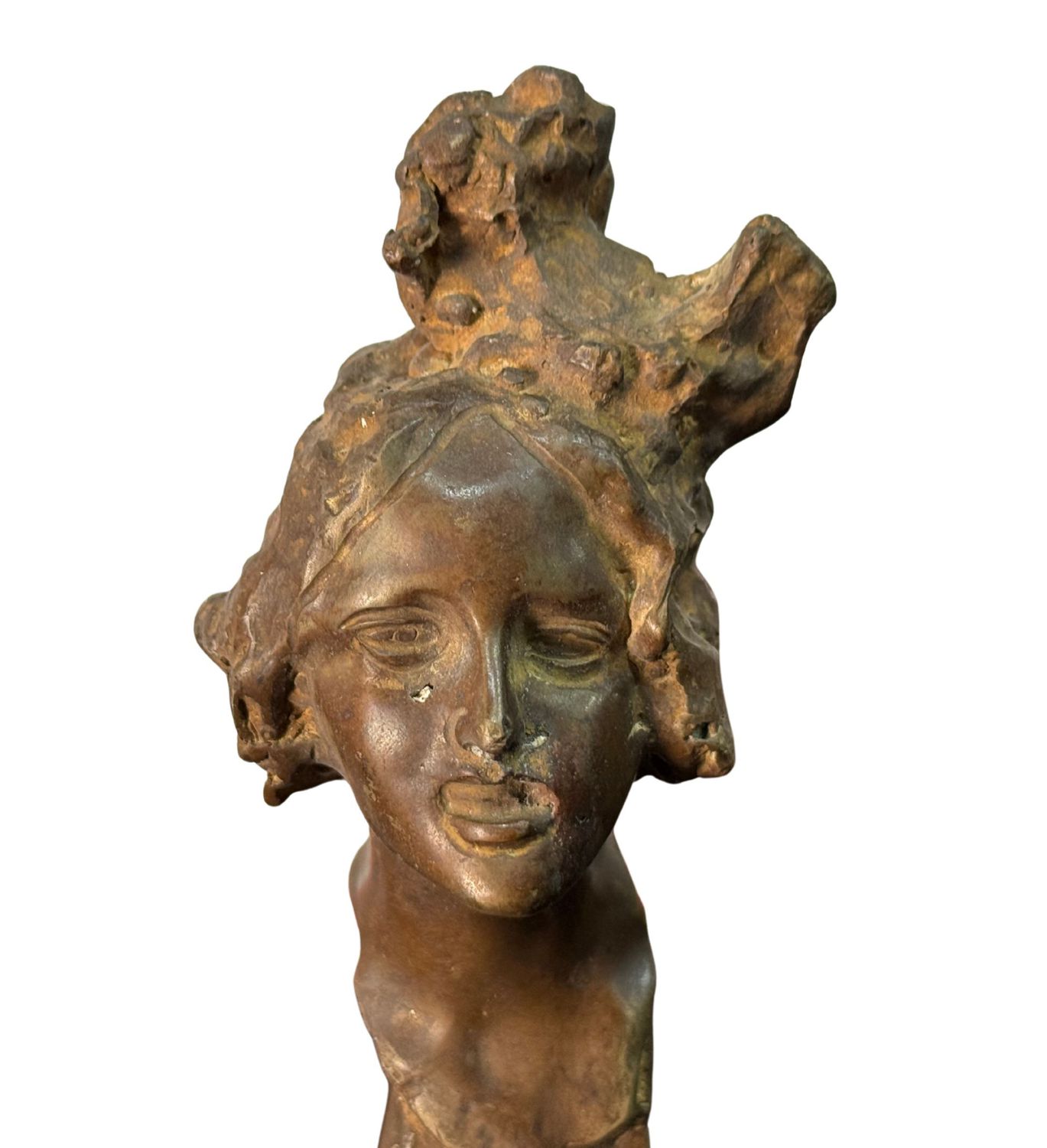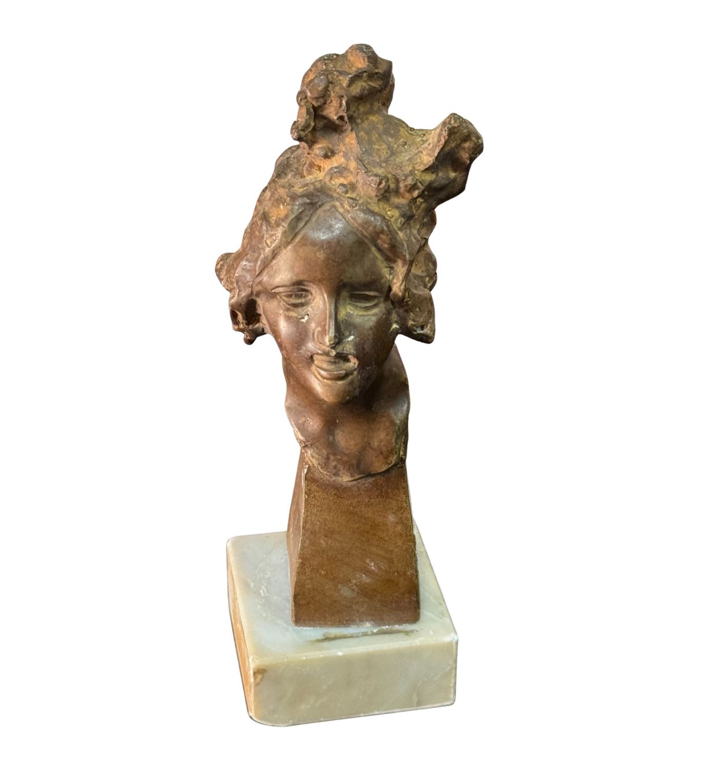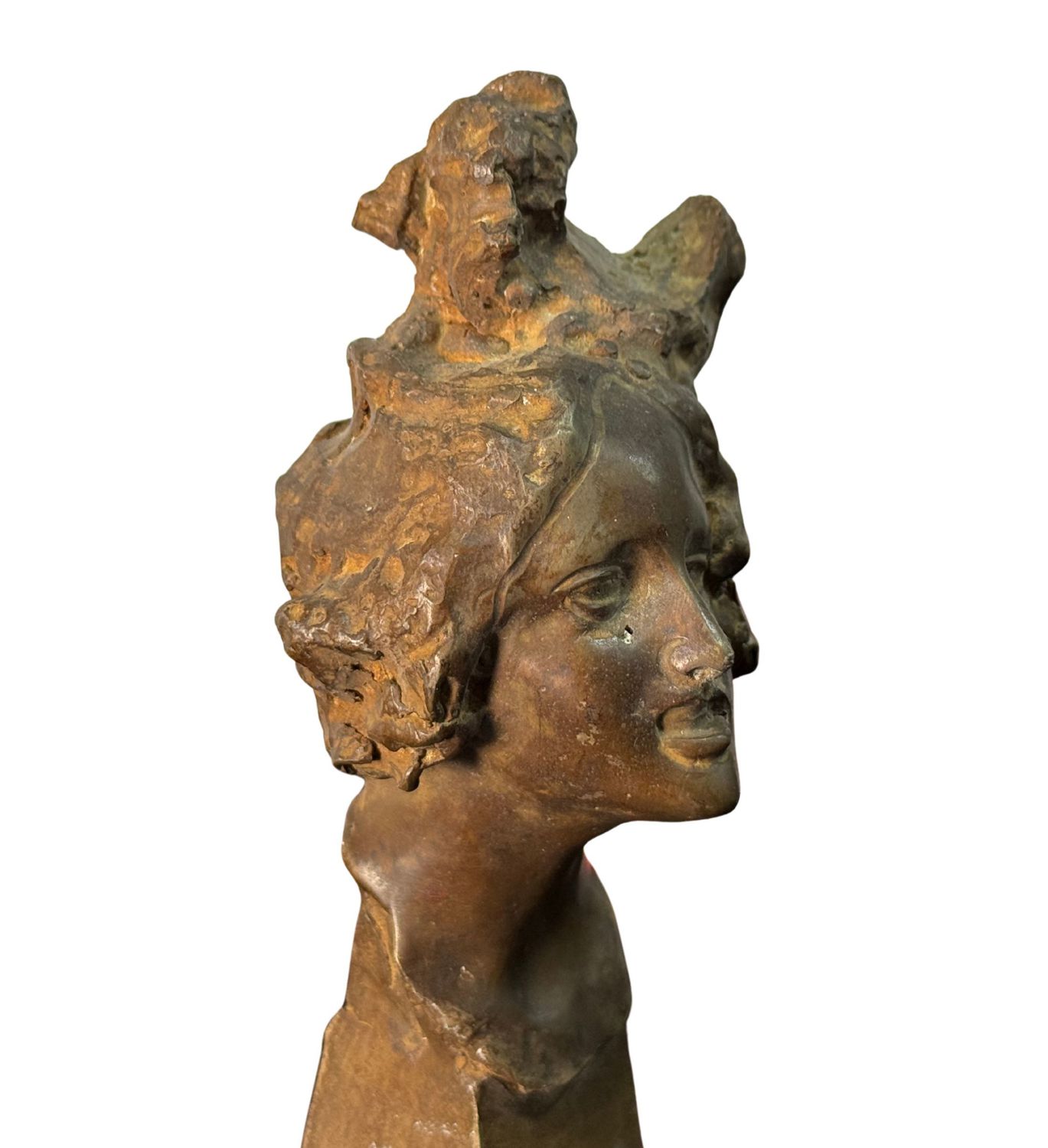 Scultura in bronzo a cera persa, periodo XX secolo, raffigurante Busto femminile. Dimensioni: 20x6x6 cm. Firma laterale a sinistra Renda. Opera in buone condizioni.