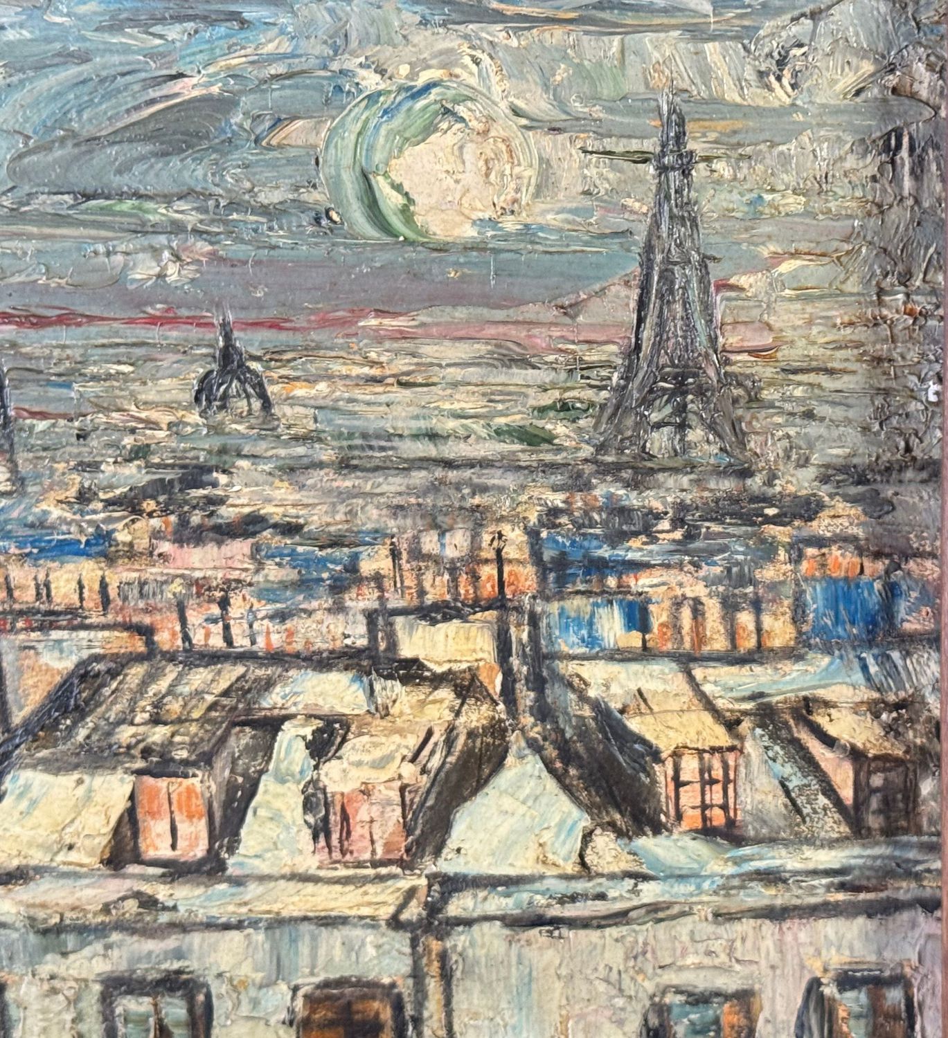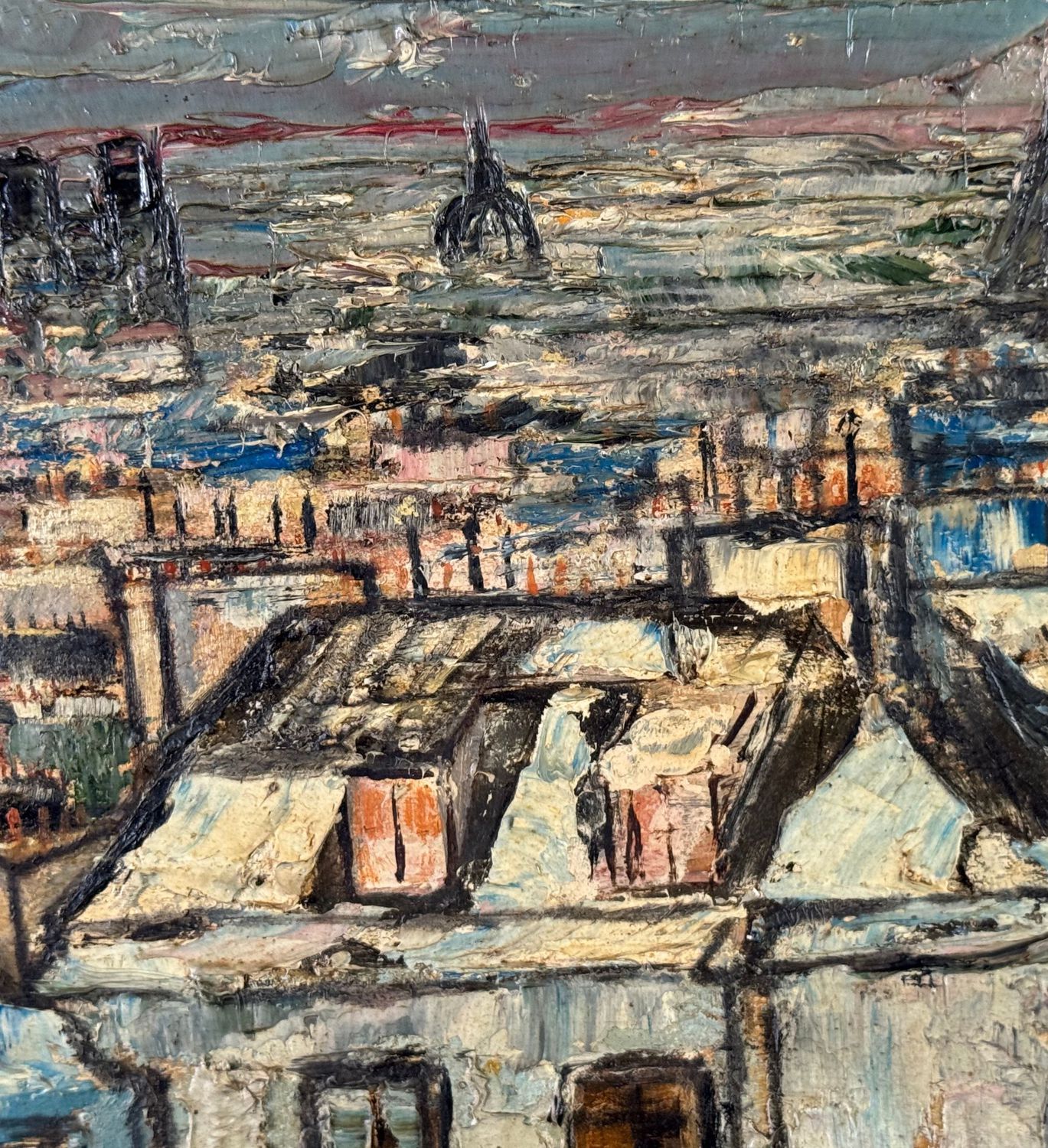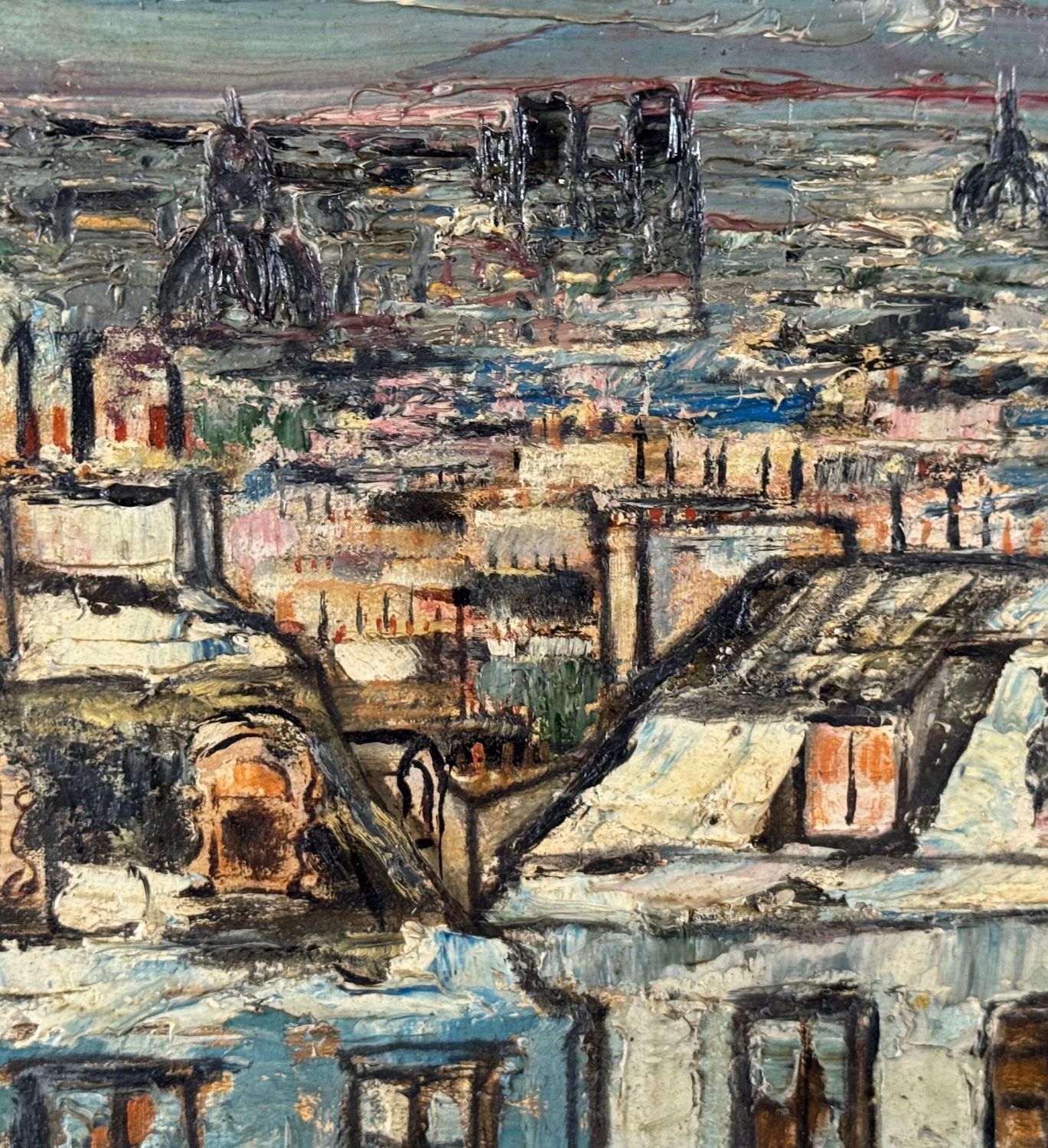 Dipinto olio su pannello, periodo XX secolo, scuola Europea, raffigurante Tetti. Dimensioni compreso cornice: 45x36. Dimensioni interno cornice: 32x23 cm. Da artista anonimo. Opera in buone condizioni.