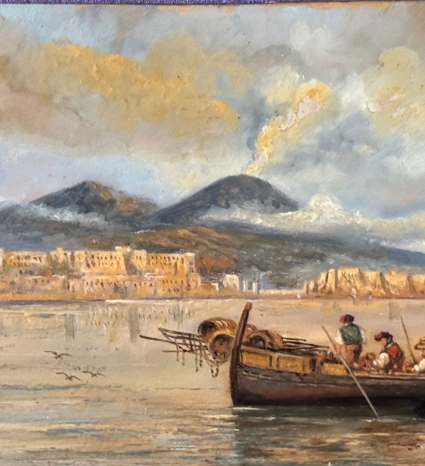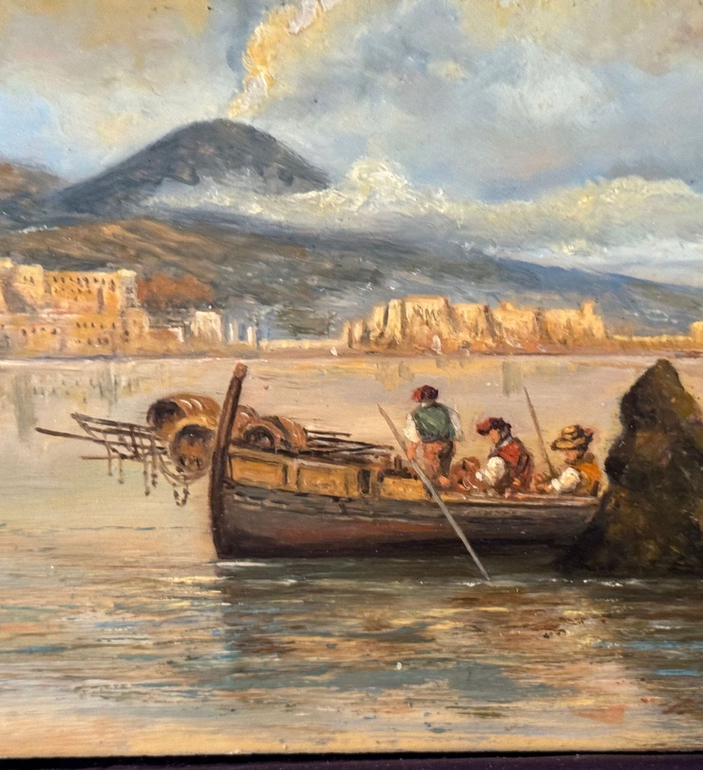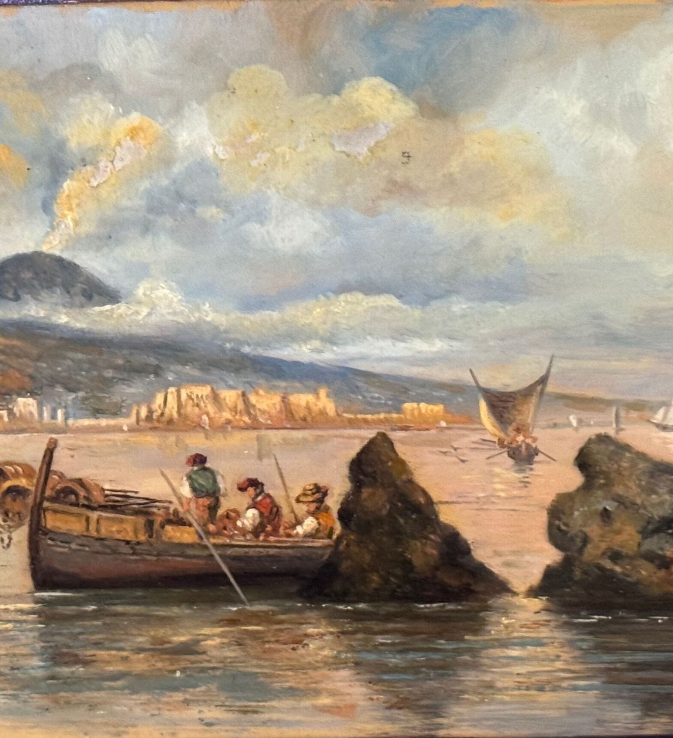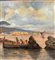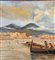 Dipinto olio su tavola, periodo XX secolo, scuola Italiana, raffigurante Marina napoletana con barche e pescatori. Dimensioni: 30x17 cm. Artista anonimo. Opera in buone condizioni.
