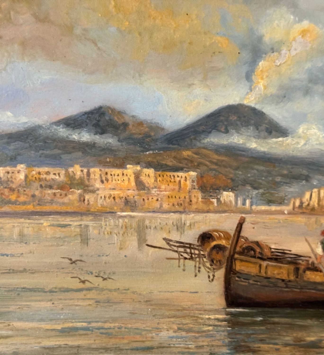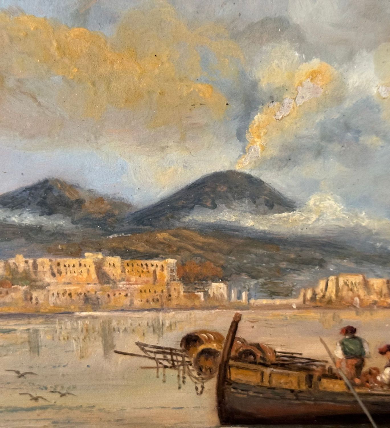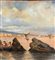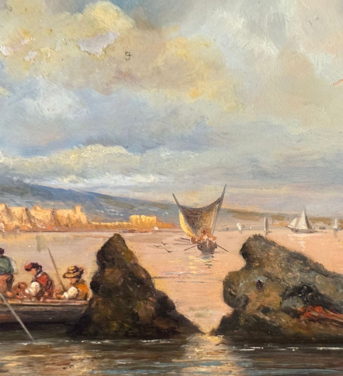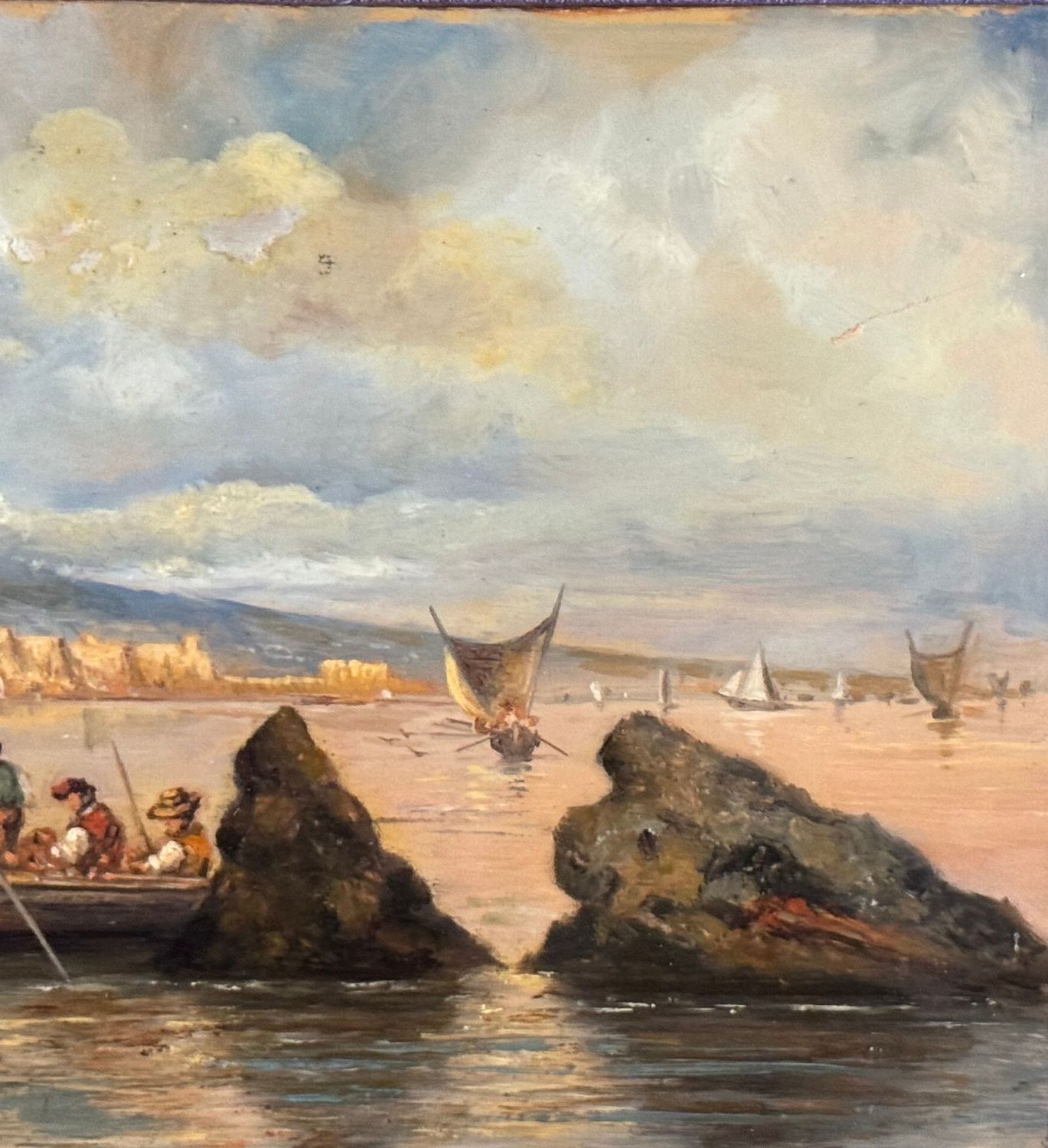 Dipinto olio su tavola, periodo XX secolo, scuola Italiana, raffigurante Marina napoletana con barche e pescatori. Dimensioni: 30x17 cm. Artista anonimo. Opera in buone condizioni.