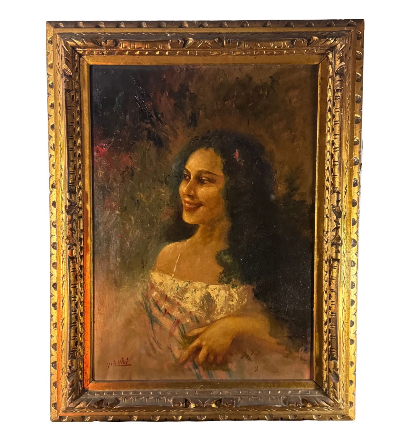 Dipinto olio su tavola, periodo XX secolo, scuola Italiana, raffigurante Ritratto di donna. Dimensioni compreso cornice: 87x68 cm. Dimensioni interno cornice: 50x70 cm. Reca firma in basso a sinistra A.Guidi. Opera in buone condizioni.
