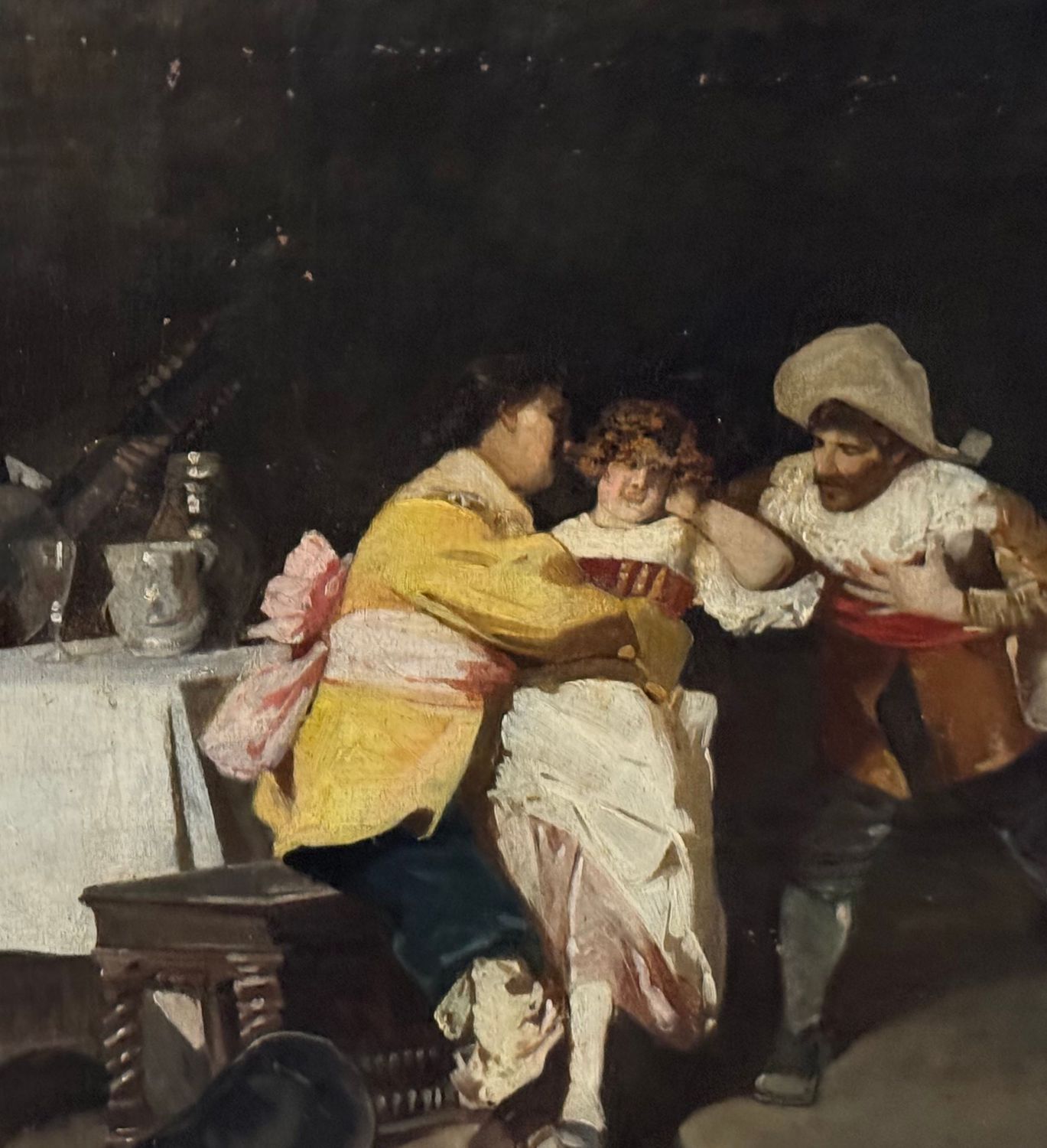 Dipinto olio su tela, periodo XIX secolo, scuola Italiana, raffigurante Personaggi in osteria. Dimensioni compreso cornice: 89x61 cm. Dimensioni interno cornice: 73x46 cm. Firmato in basso a destra Francesco Peluso (Napoli 1836 - 1916). Opera in buone condizioni con lievi segni di vissuto come da foto allegate.