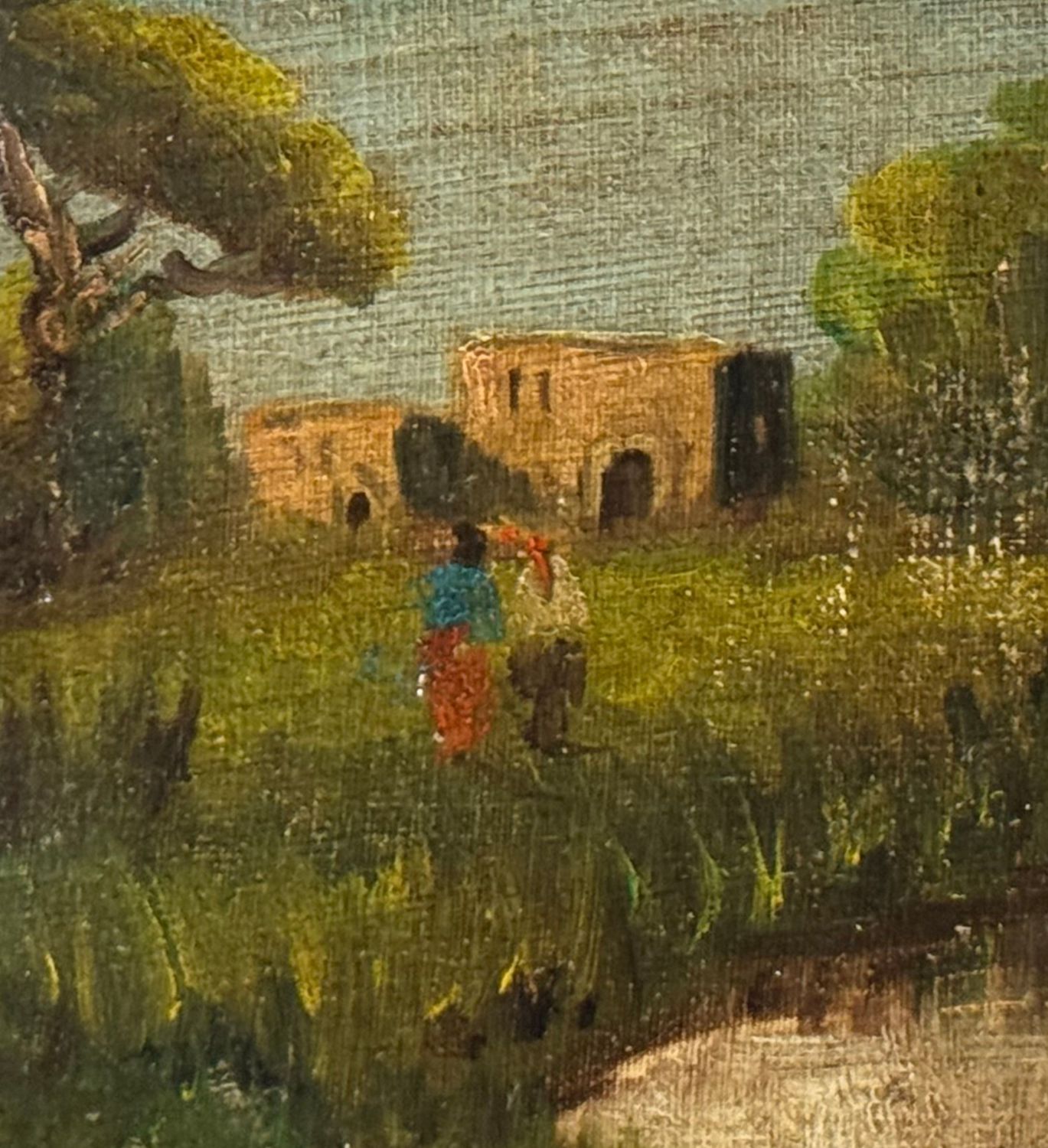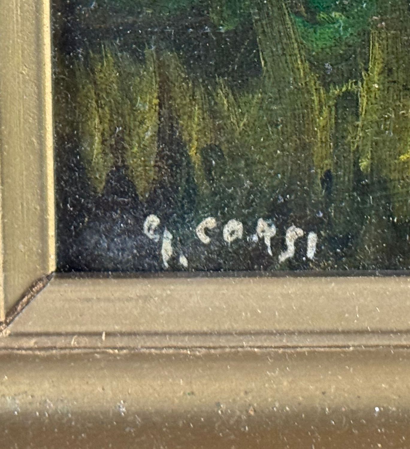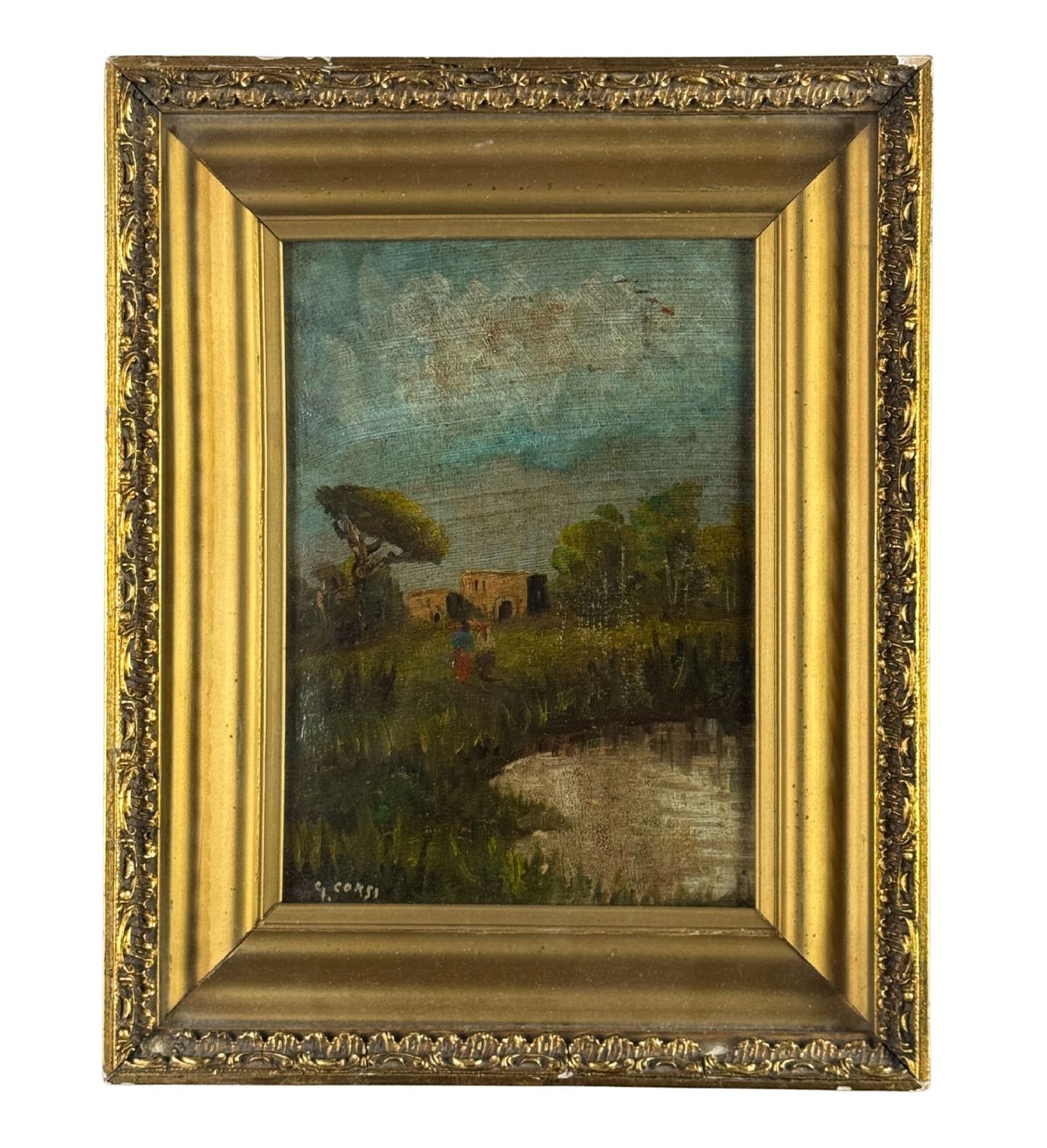 Dipinto olio su tela, periodo XIX secolo, scuola Italiana, raffigurante Paesaggio di campagna. Dimensioni compreso cornice: 27x34 cm. Dimensioni interno cornice: 18x24 cm. Reca firma in basso a sinistra Giacinto Corsi (1829 - 1909). Opera in buone condizioni con lievi segni di vissuto come da foto allegate.