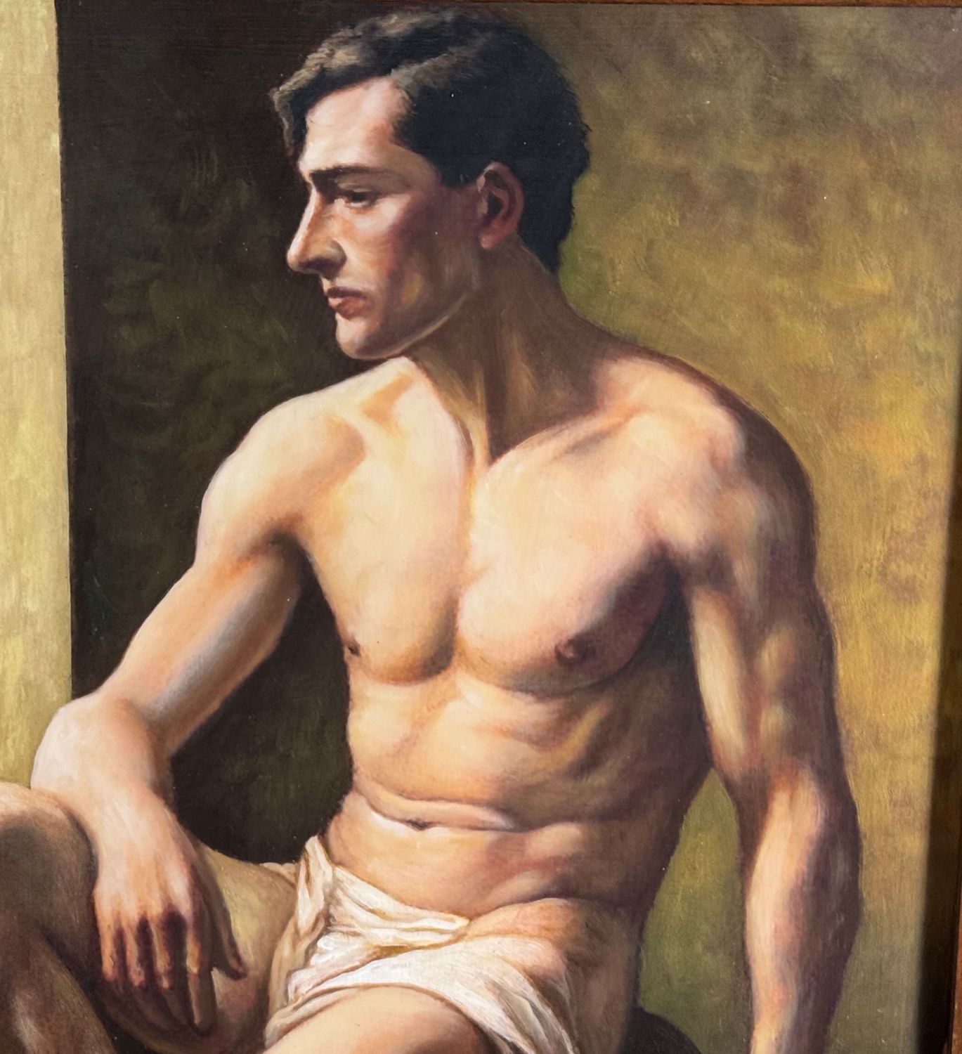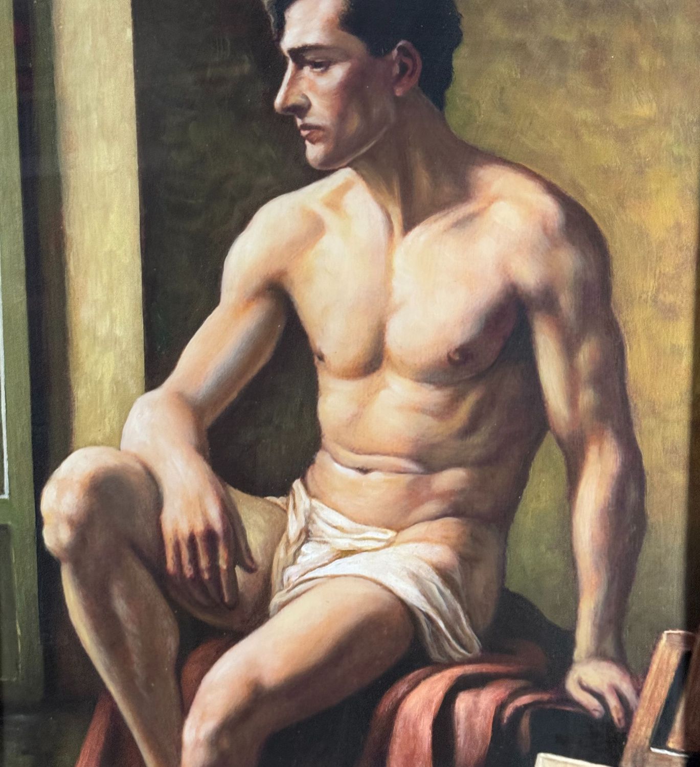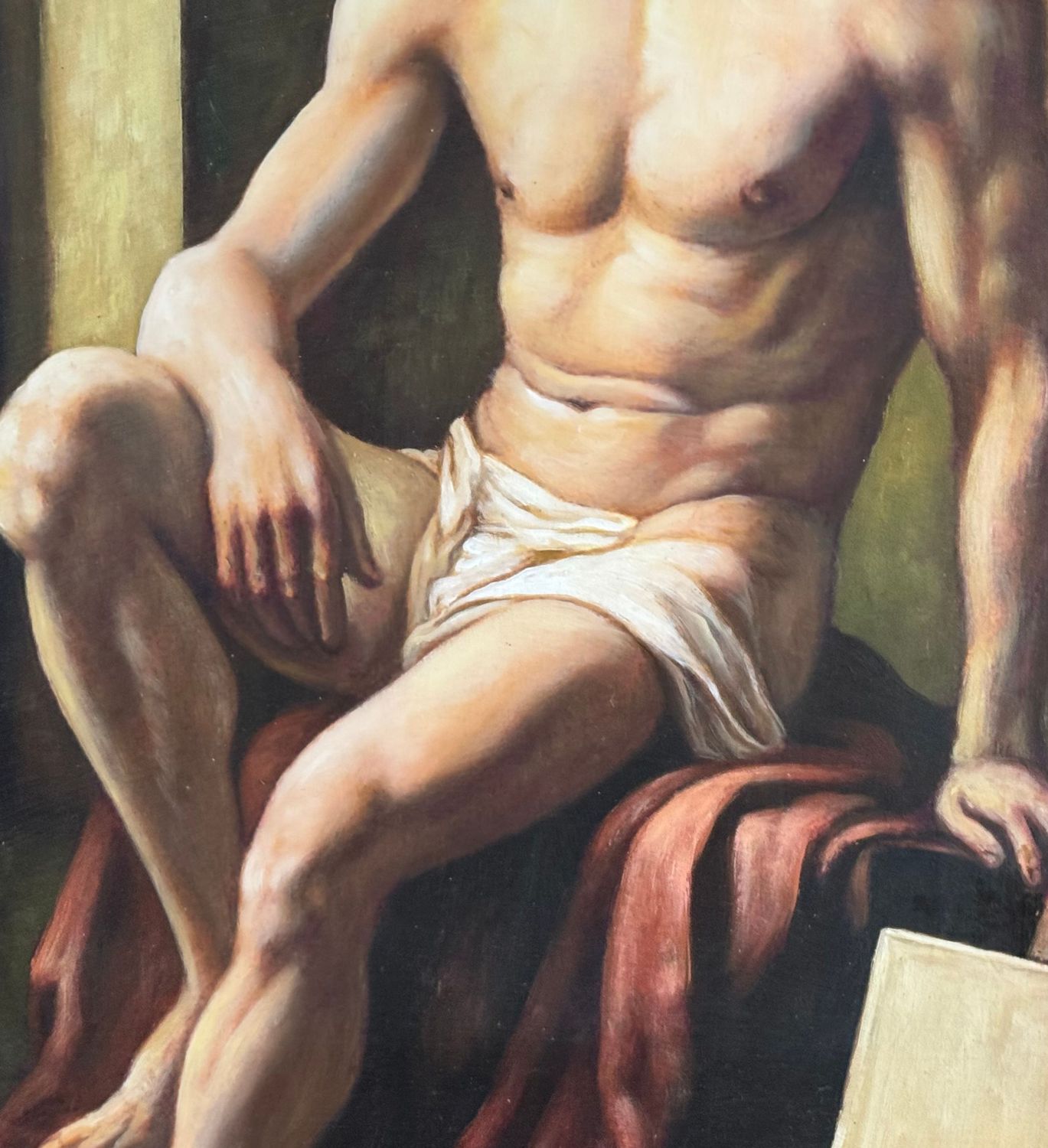 Dipinto olio su pannello, periodo XX secolo, scuola Italiana, raffigurante Nudo maschile. Dimensioni compreso cornice: 50x62 cm. Dimensioni interno cornice: 38x50 cm. Artista anonimo. Opera in buone condizioni.