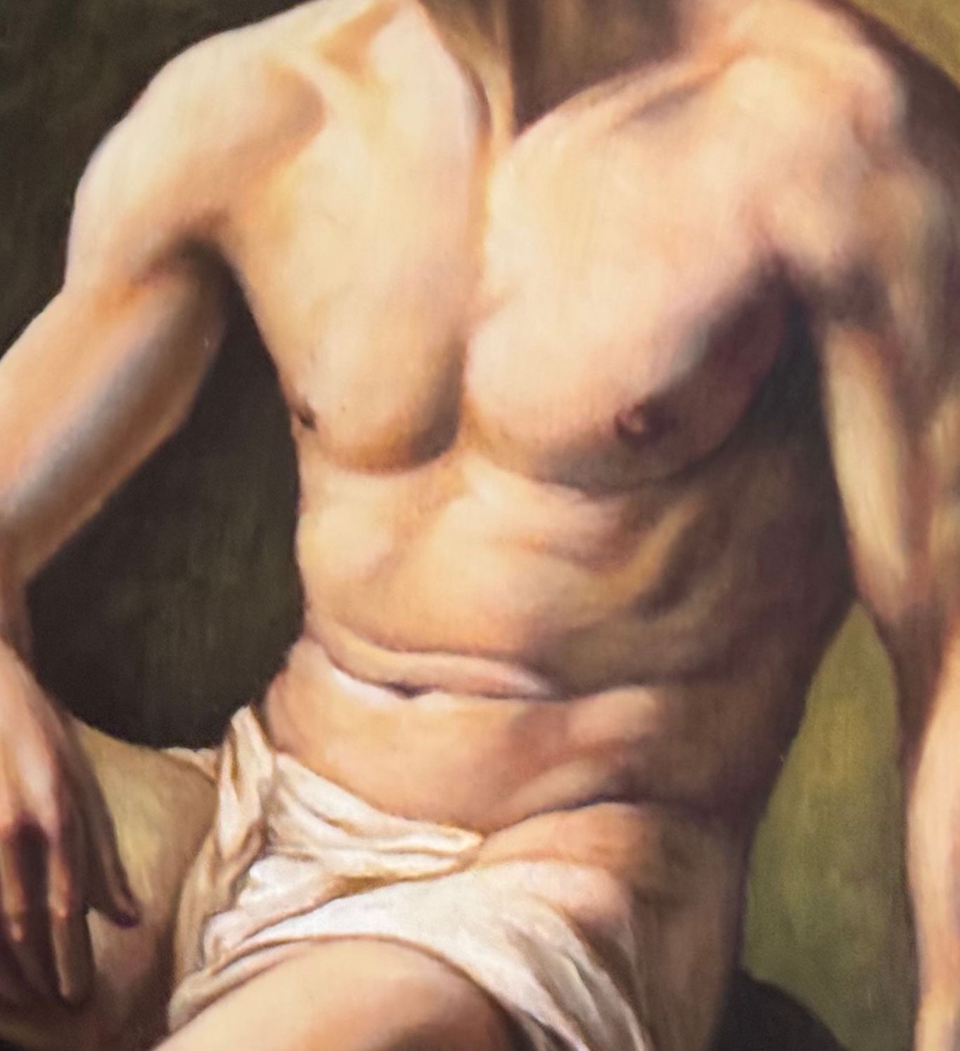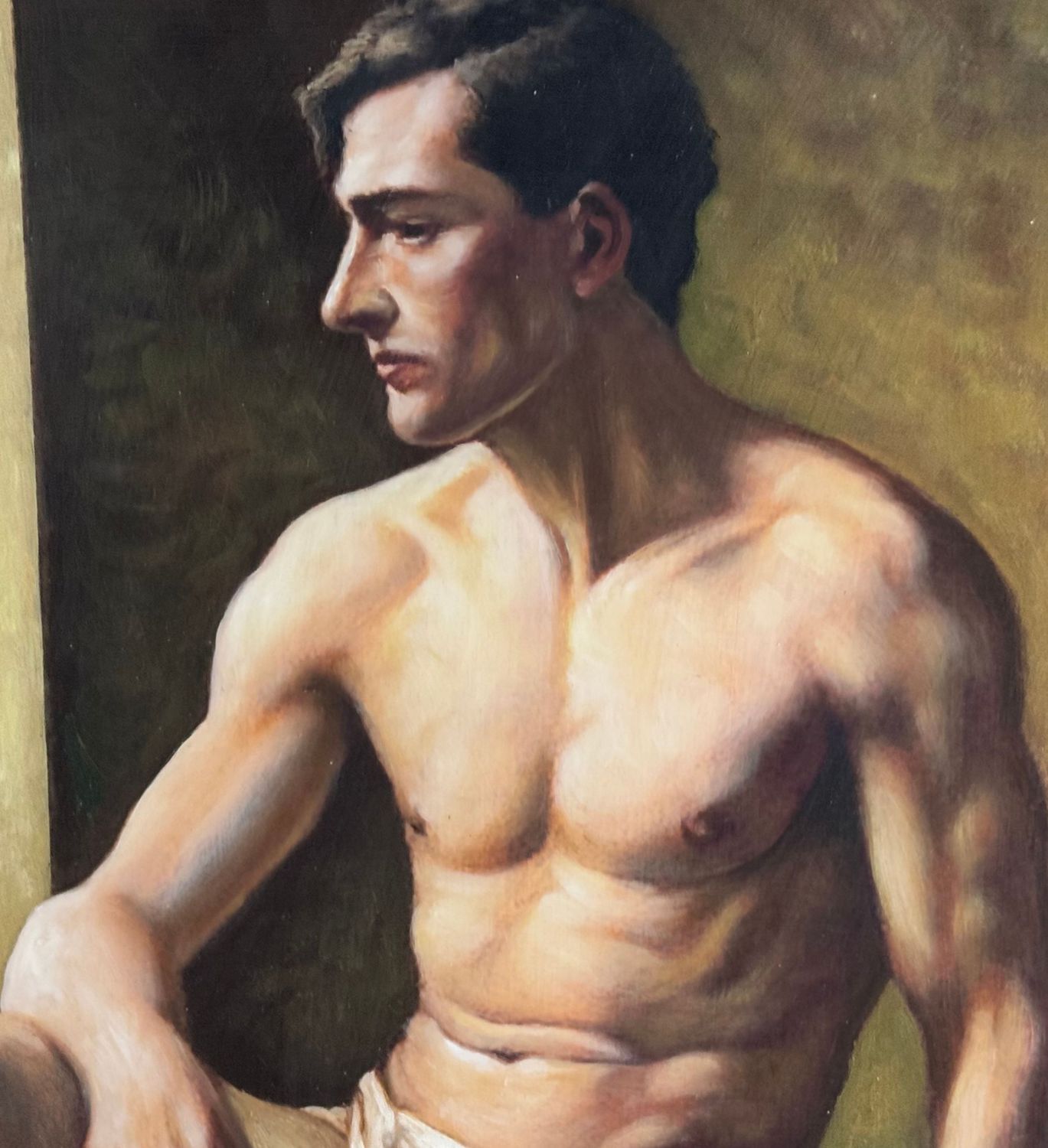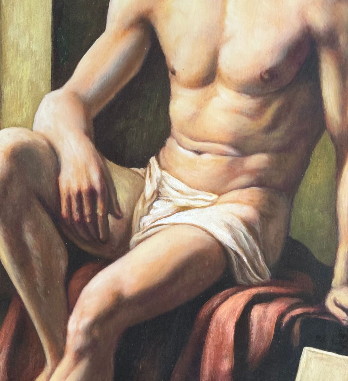 Dipinto olio su pannello, periodo XX secolo, scuola Italiana, raffigurante Nudo maschile. Dimensioni compreso cornice: 50x62 cm. Dimensioni interno cornice: 38x50 cm. Artista anonimo. Opera in buone condizioni.