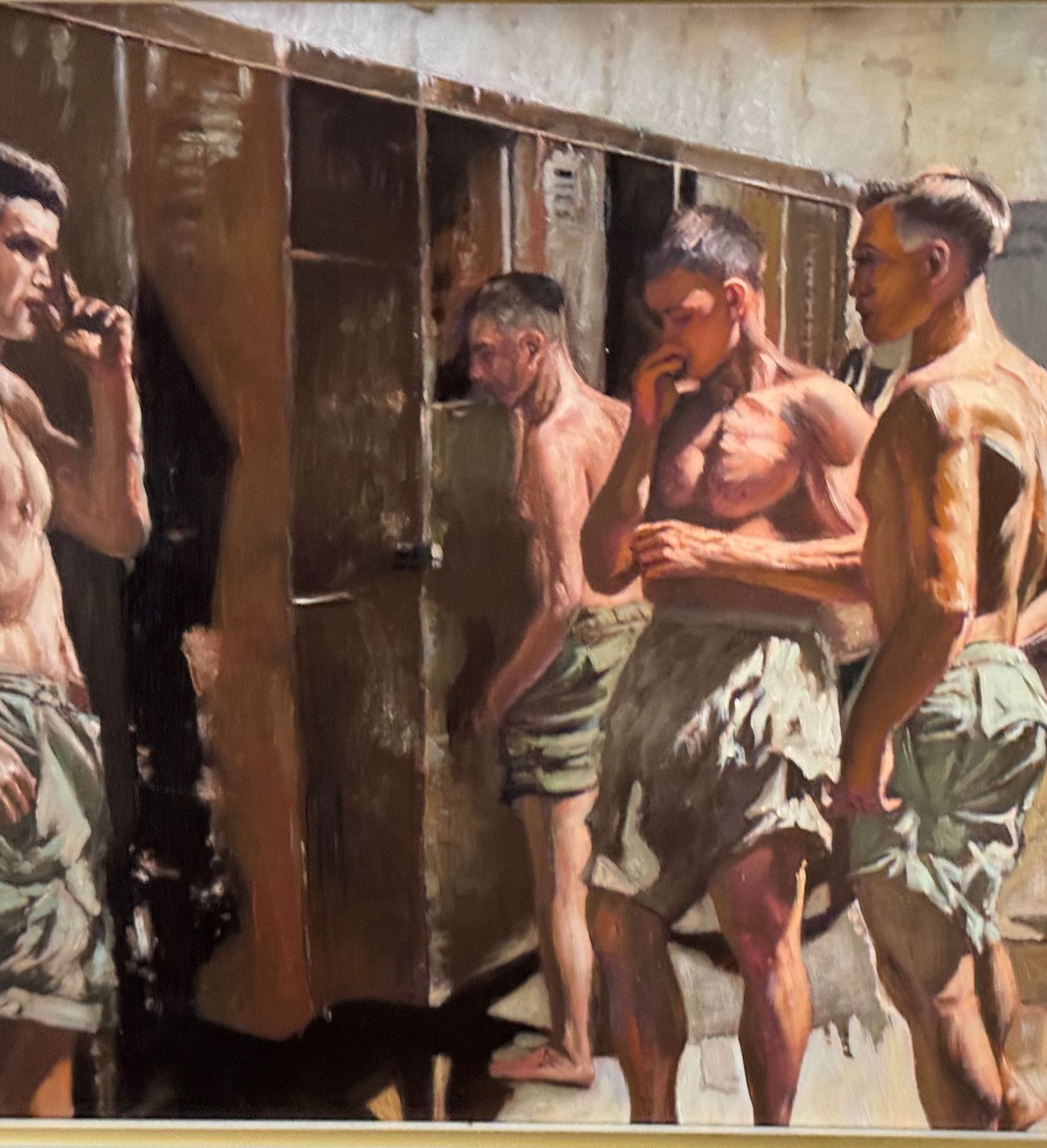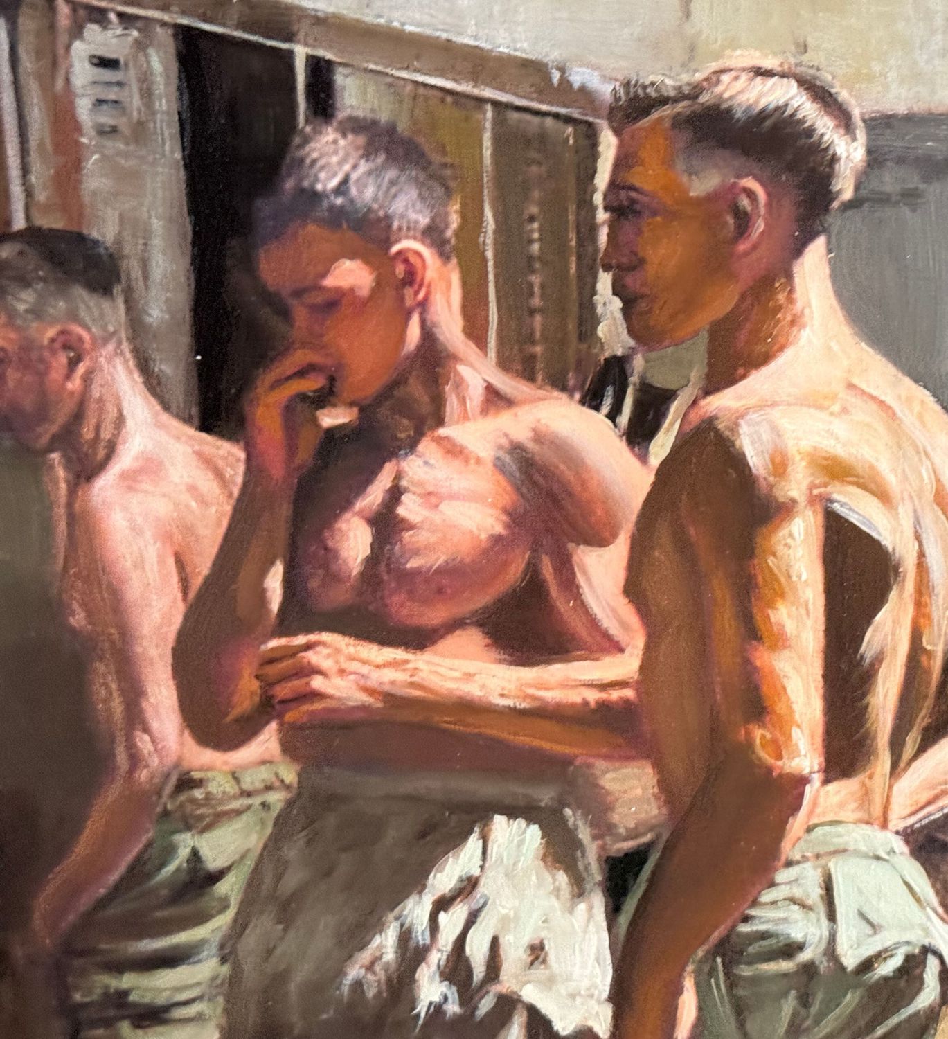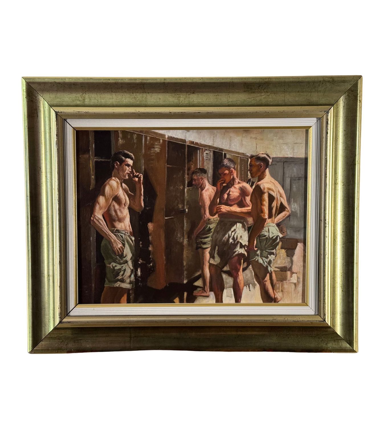 Dipinto olio su tavola, periodo XX secolo, scuola Italiana, raffigurante Atleti in uno spogliatoio. Dimensioni compreso cornice: 59x49 cm. Dimensioni interno cornice: 45x35 cm. Artista anonimo. Opera in buone condizioni.