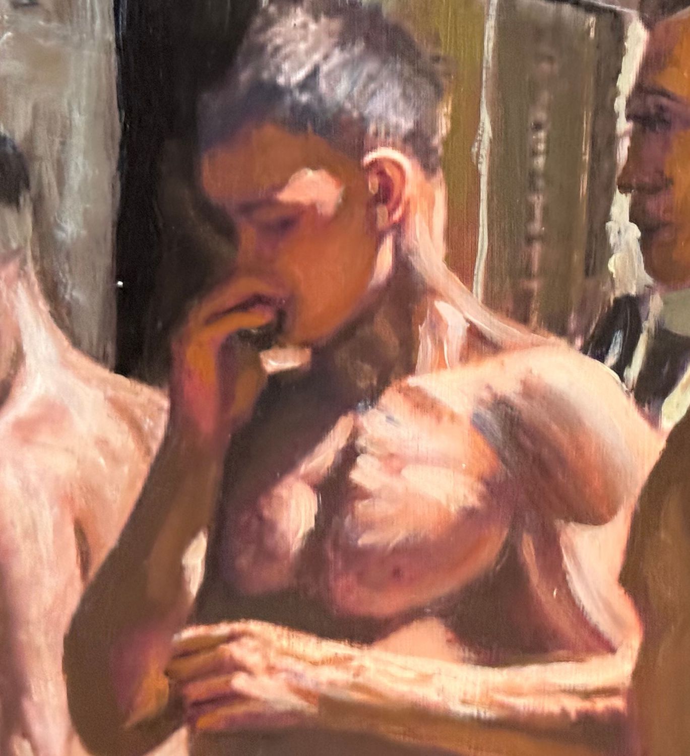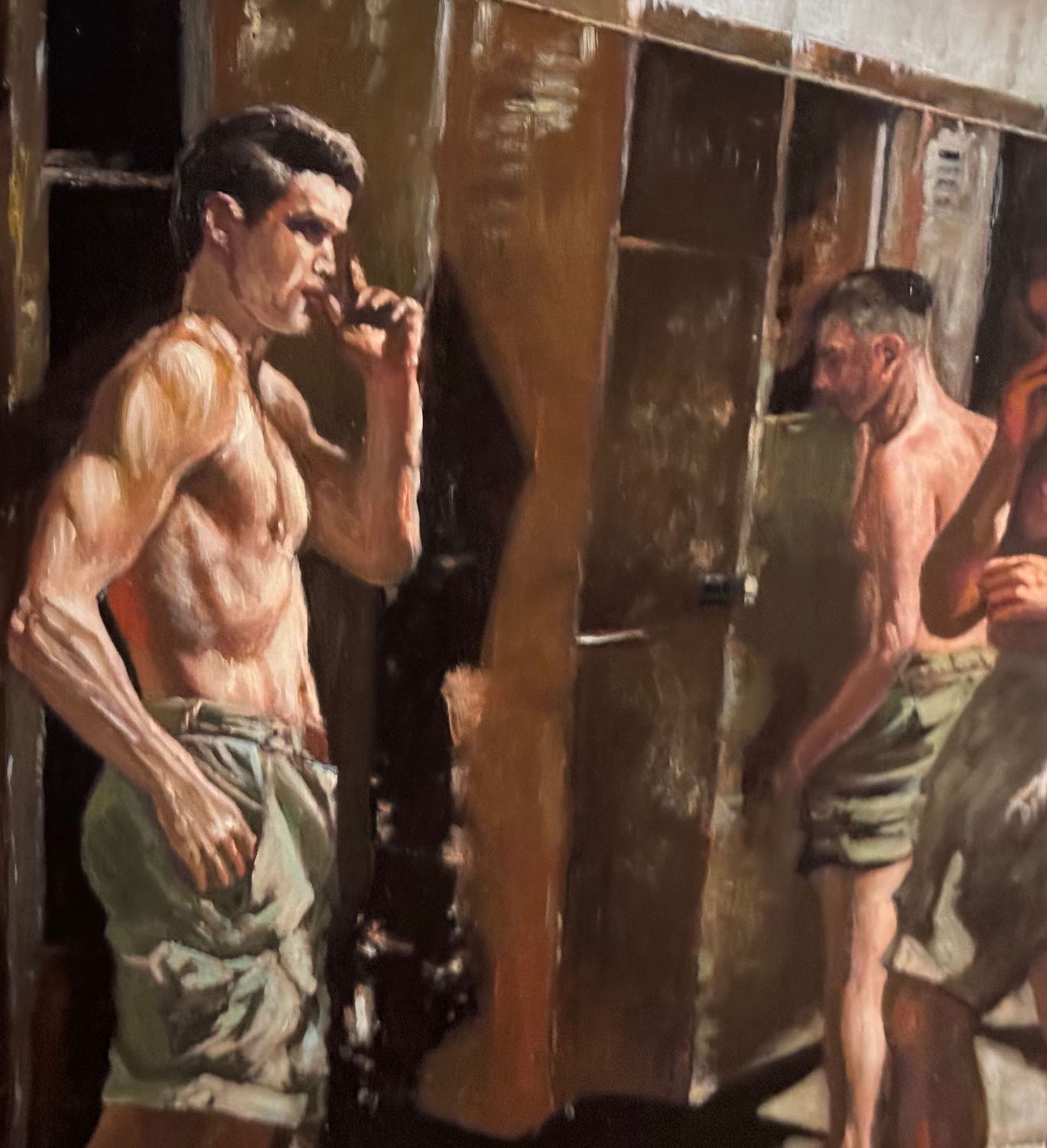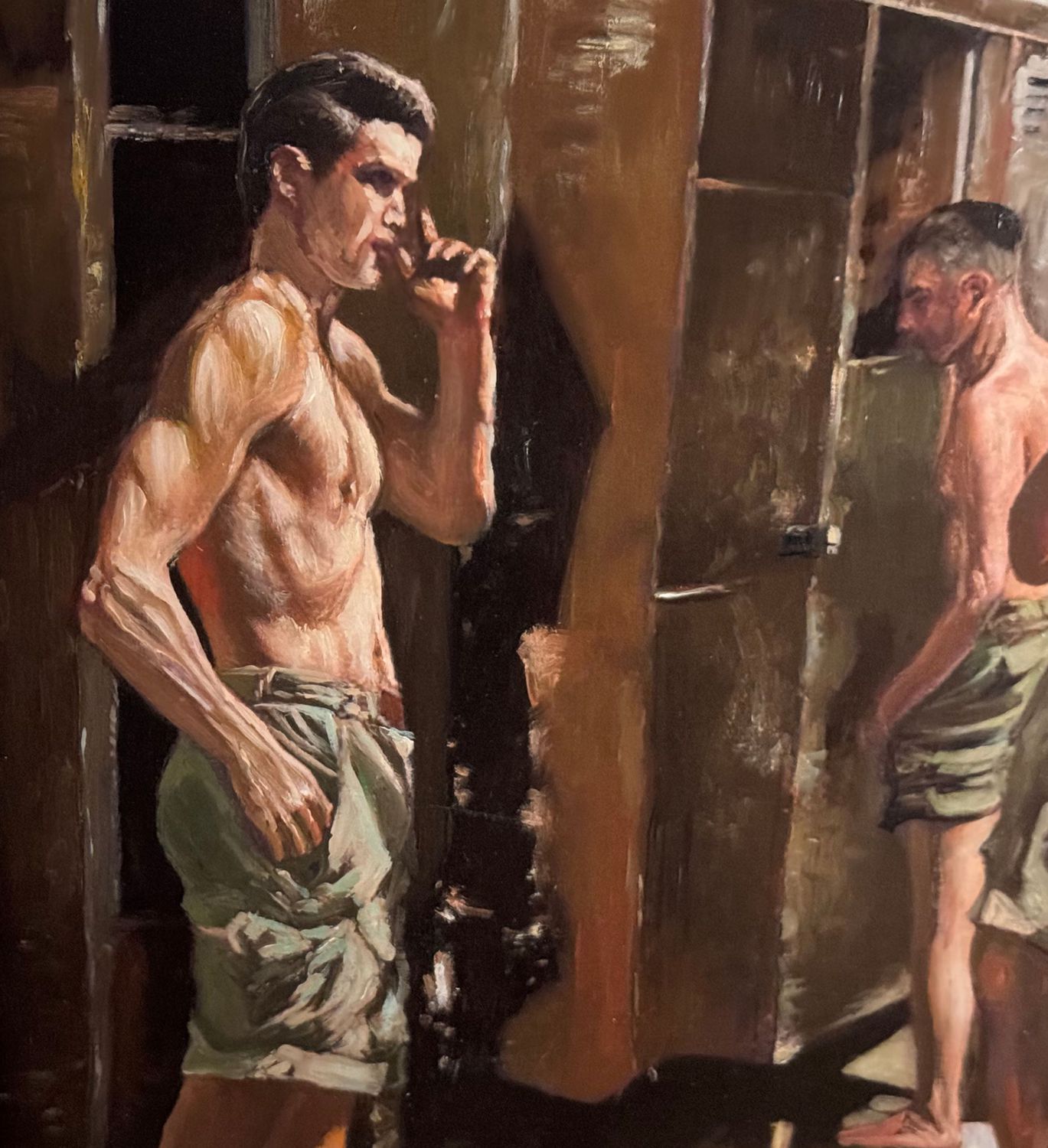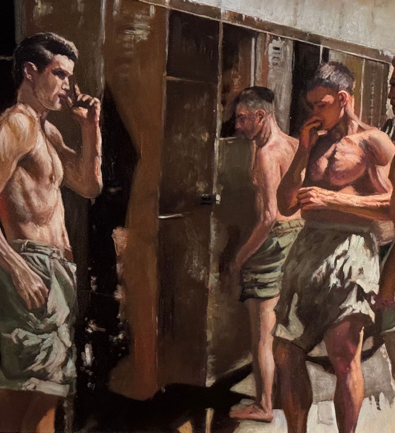 Dipinto olio su tavola, periodo XX secolo, scuola Italiana, raffigurante Atleti in uno spogliatoio. Dimensioni compreso cornice: 59x49 cm. Dimensioni interno cornice: 45x35 cm. Artista anonimo. Opera in buone condizioni.