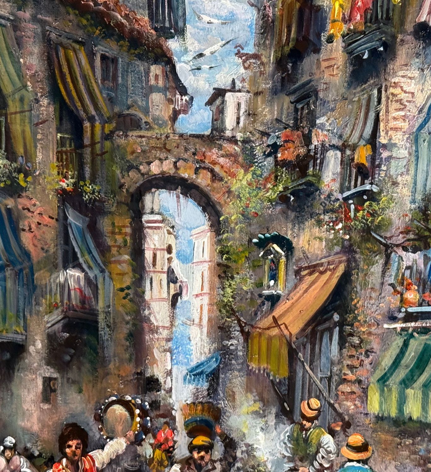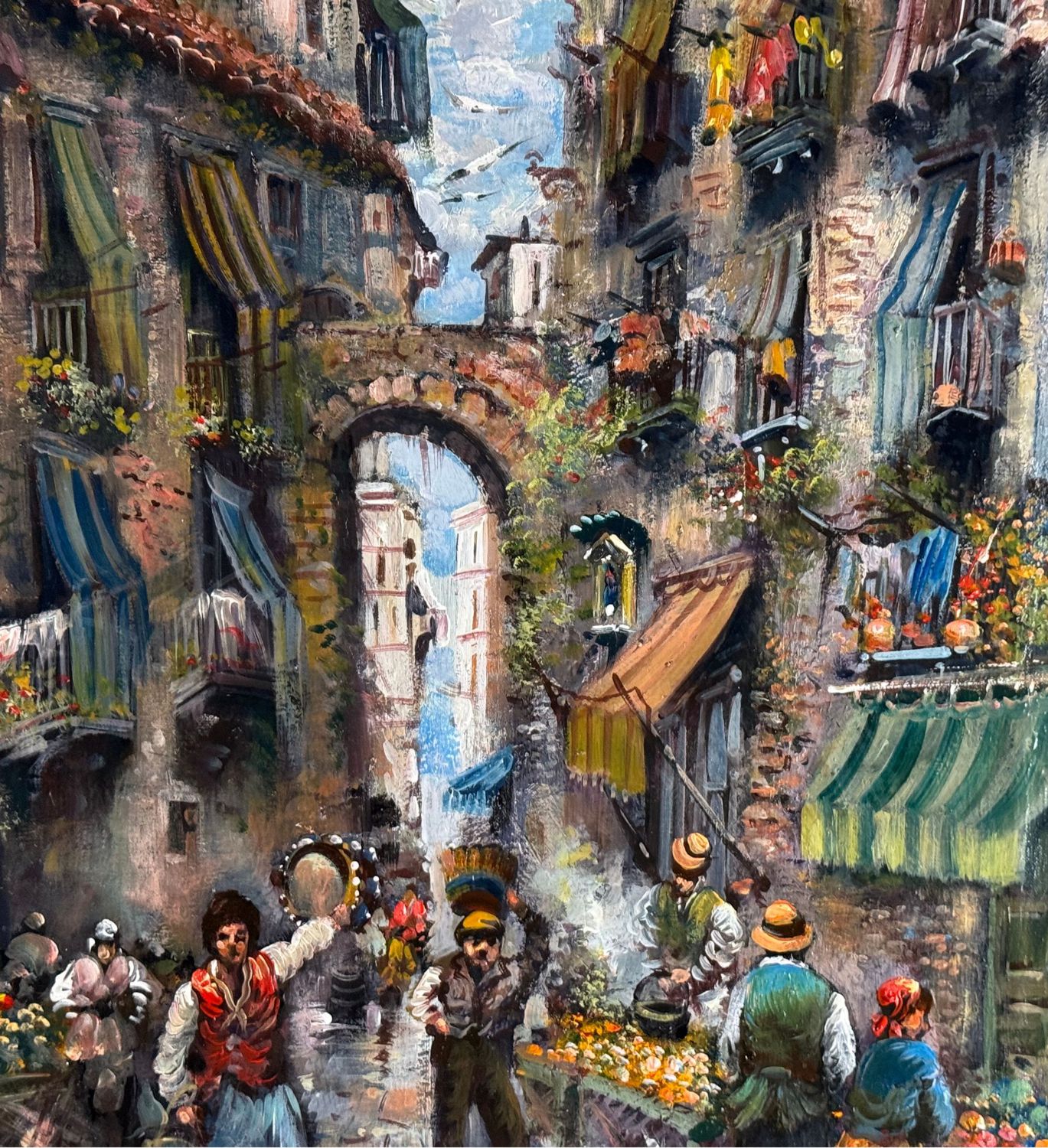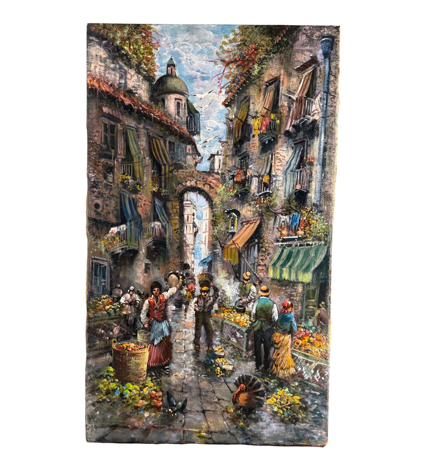 Dipinto olio su tela, periodo XX secolo, scuola Italiana, raffigurante Strada napoletana con mercatino. Dimensioni: 85x50 cm. Da artista anonimo. Opera in buone condizioni con lievi segni di vissuto come da foto allegate.