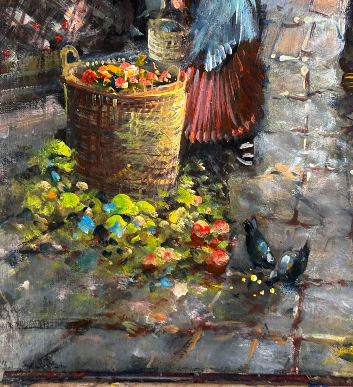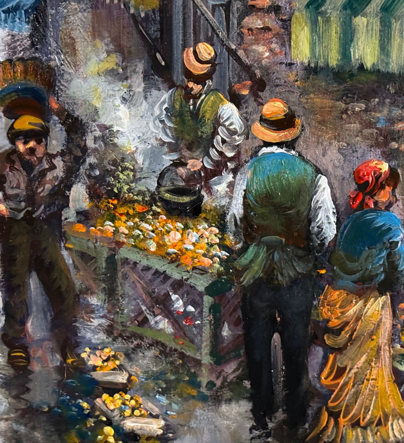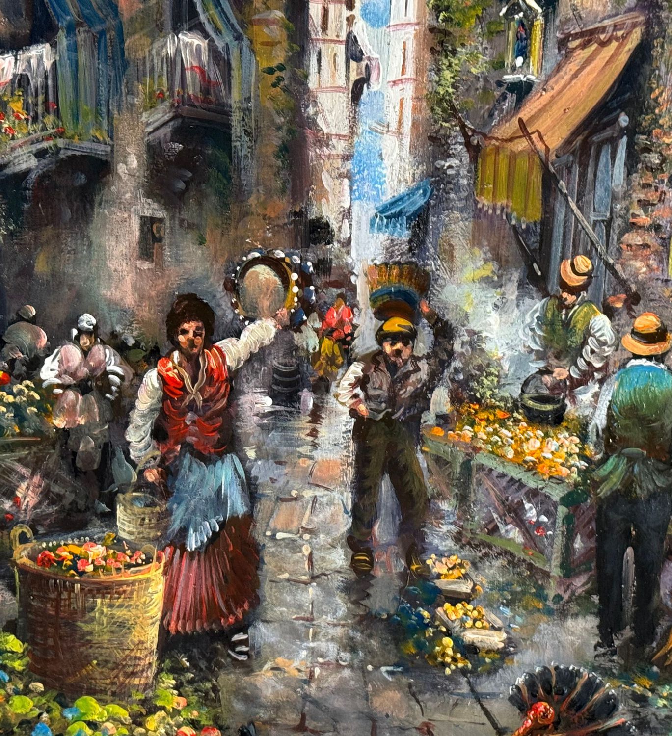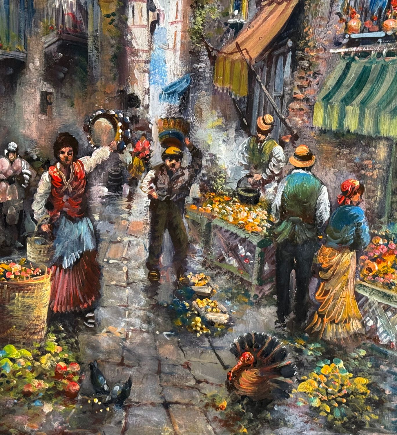 Dipinto olio su tela, periodo XX secolo, scuola Italiana, raffigurante Strada napoletana con mercatino. Dimensioni: 85x50 cm. Da artista anonimo. Opera in buone condizioni con lievi segni di vissuto come da foto allegate.