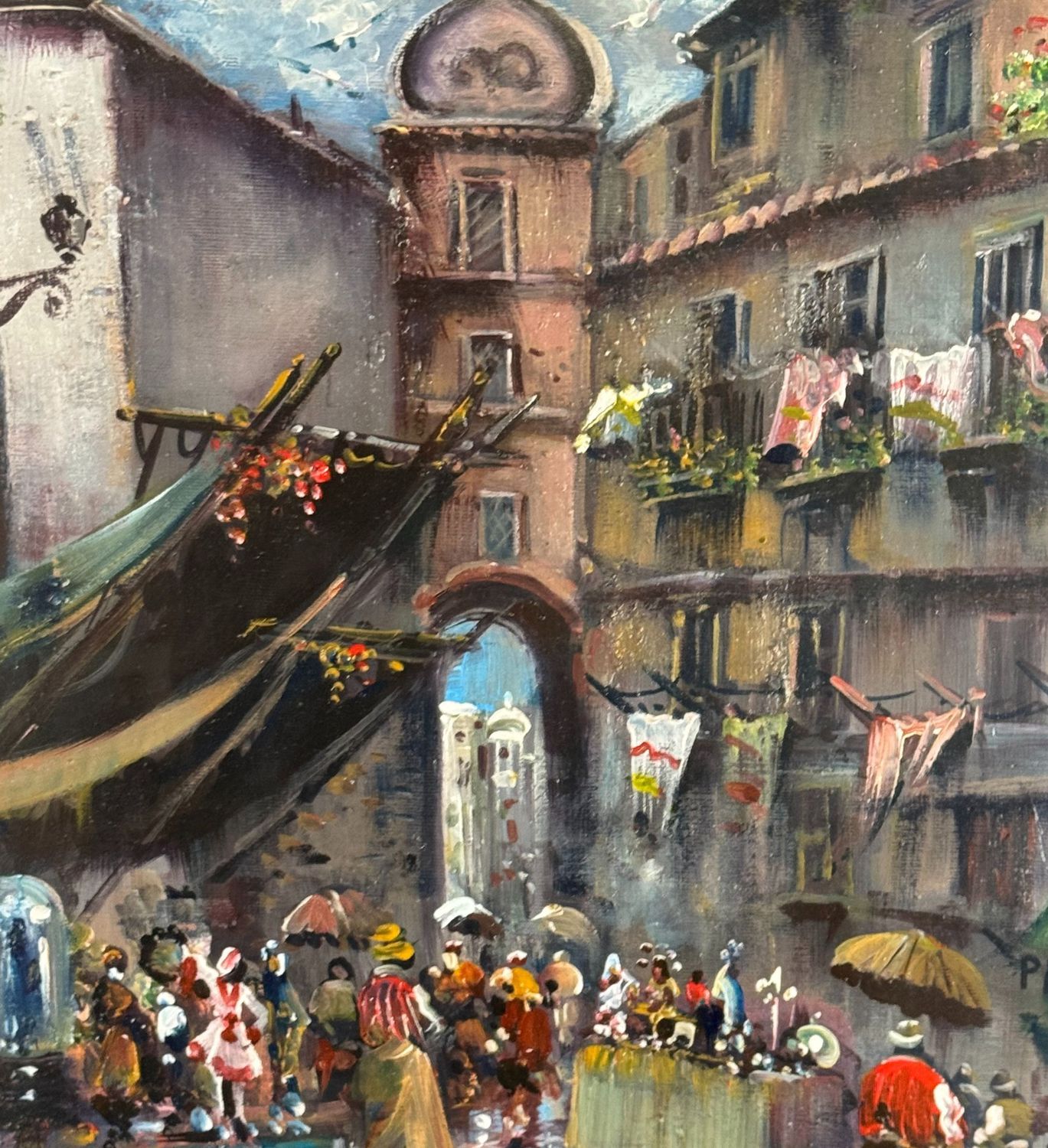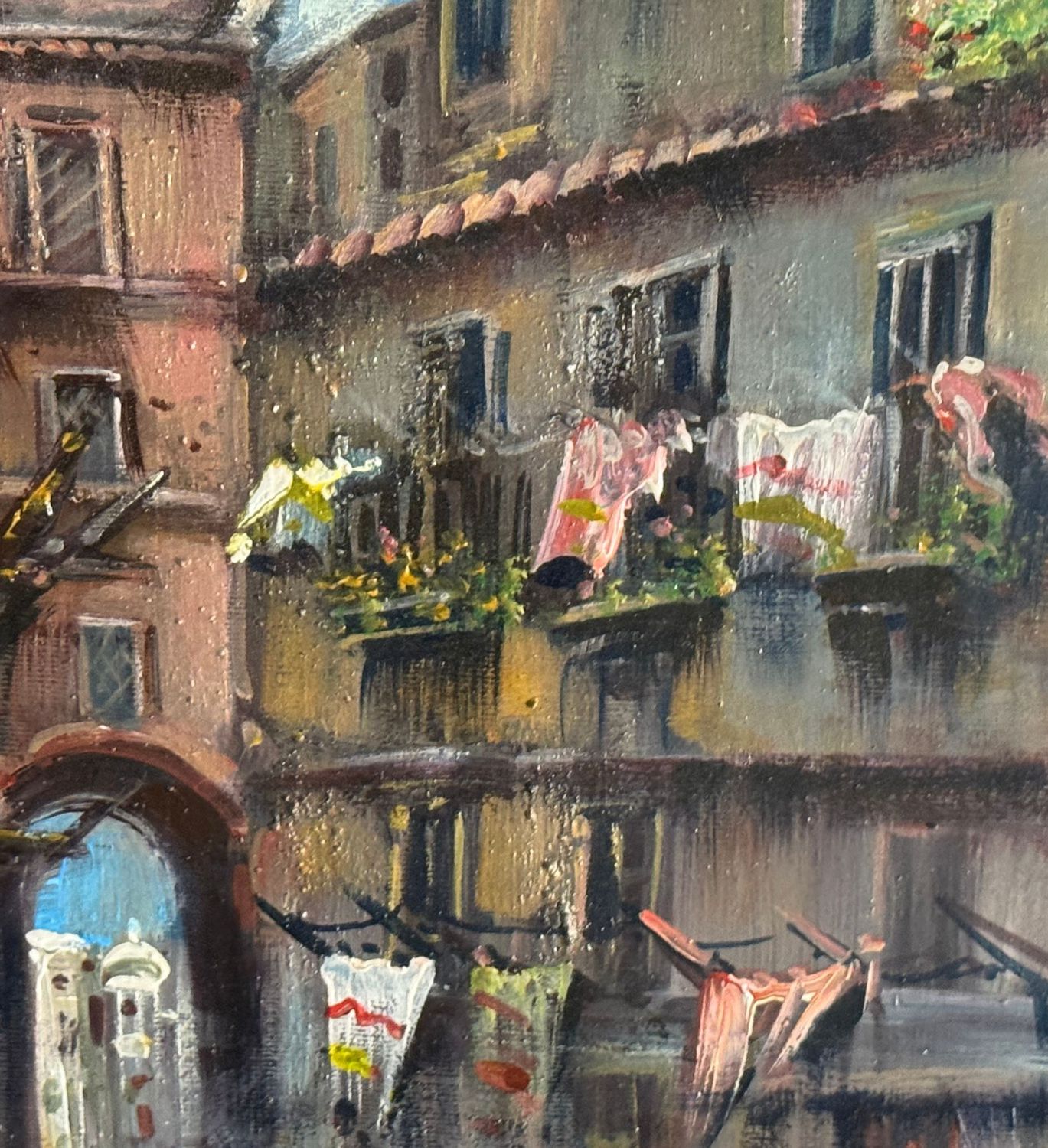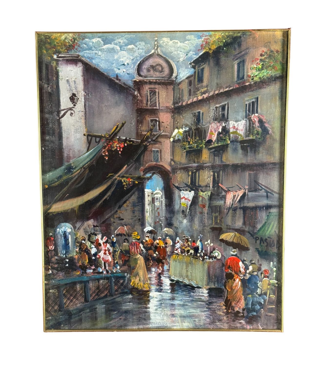 Dipinto olio su tela, periodo XX secolo, scuola Italiana, raffigurante Strada napoletana (San Gregorio Armeno). Dimensioni compreso cornice: 62x71 cm. Dimensioni interno cornice: 40x50 cm. Da artista anonimo. Opera in buone condizioni. Cornice difetti e mancanze.
