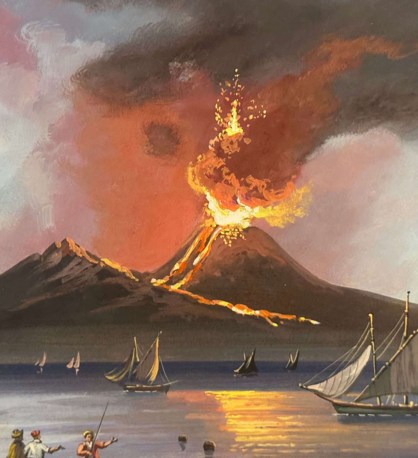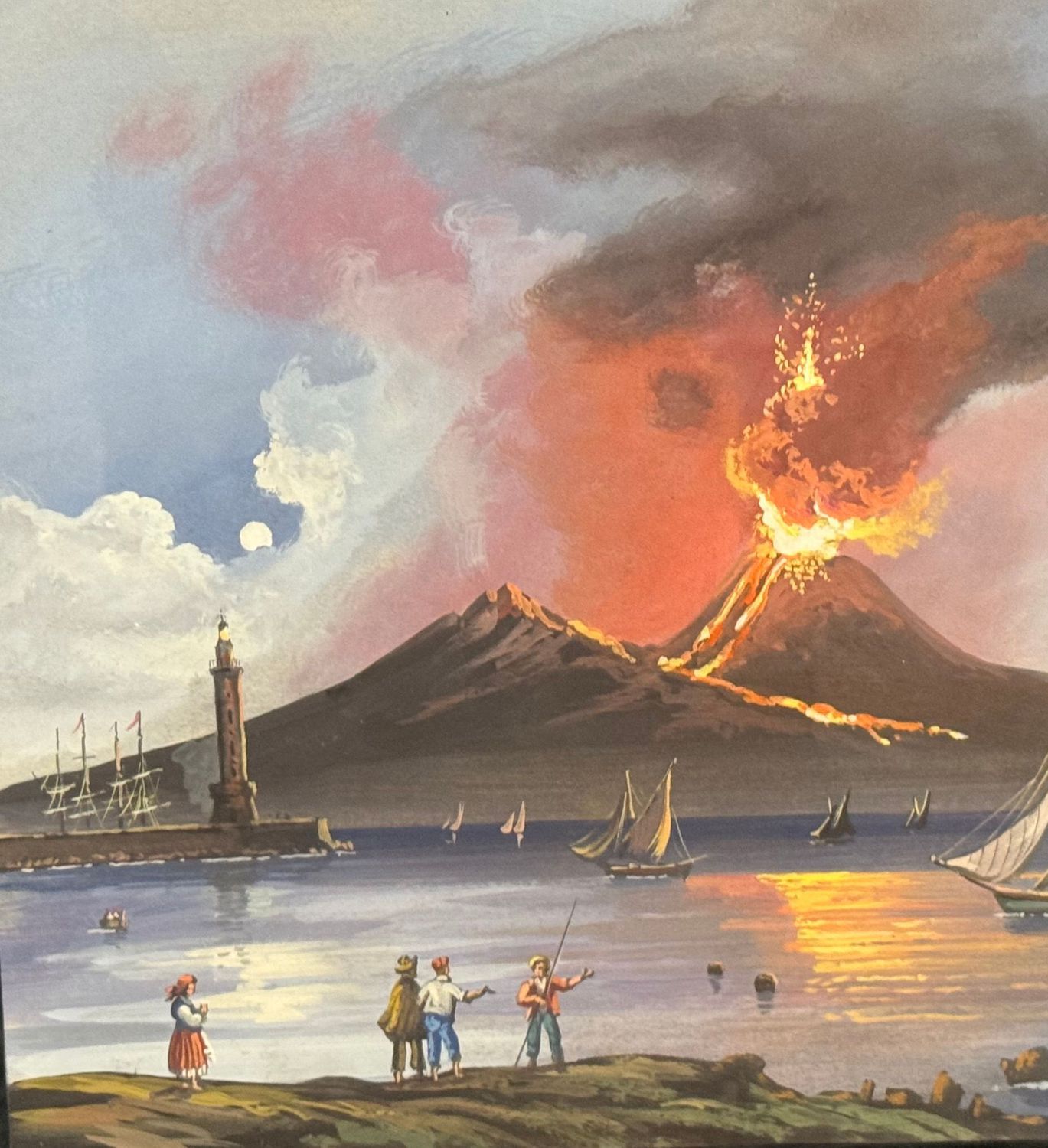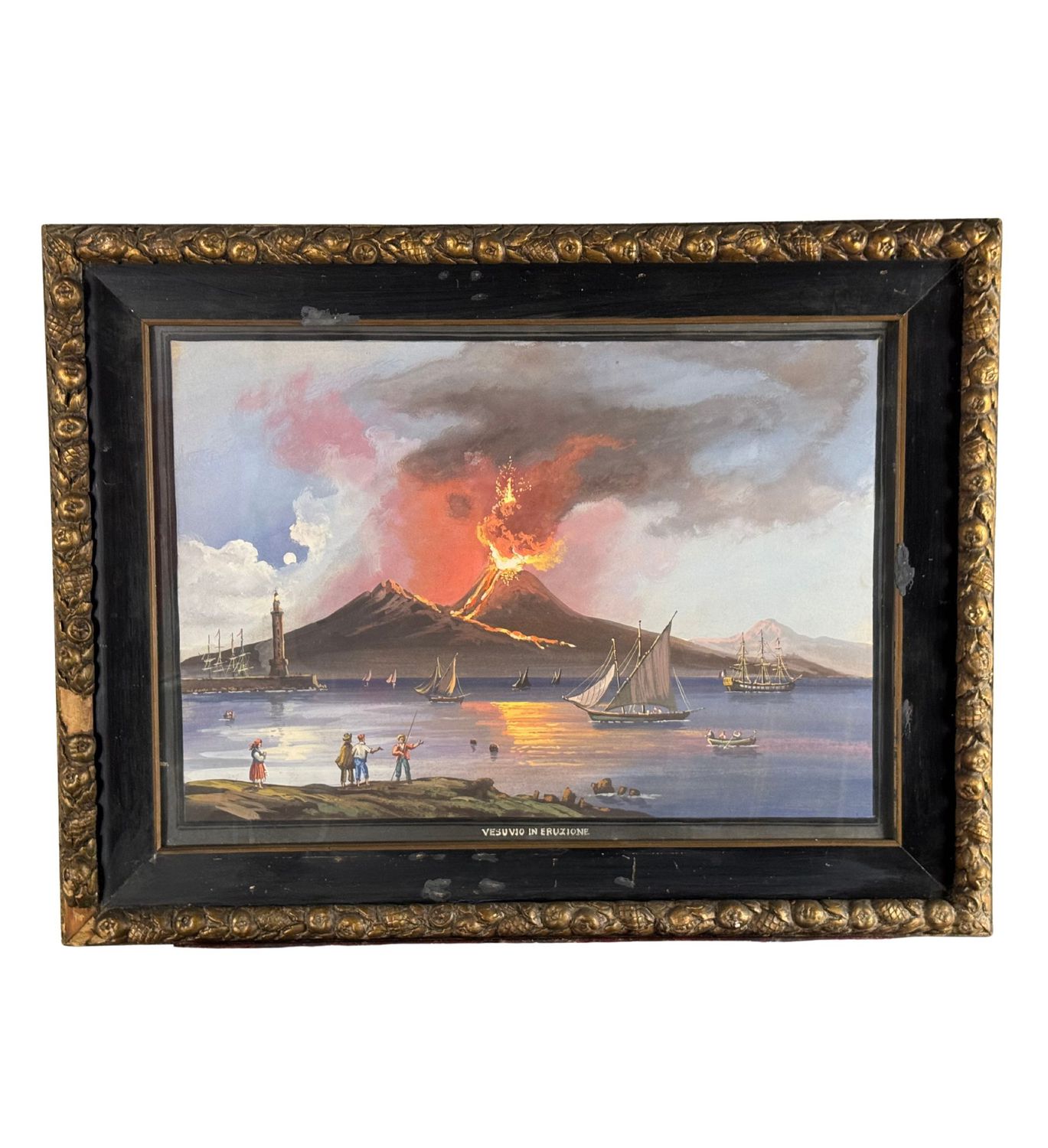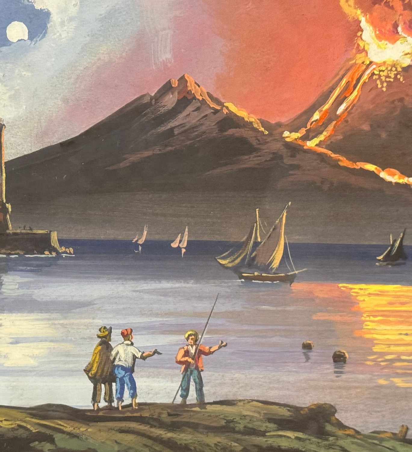 Dipinto guazzo (tempera su carta), periodo XX secolo, scuola Italiana, raffigurante Eruzione del Vesuvio. Dimensioni compreso cornice: 61x47 cm. Dimensioni interno cornice: 50x35 cm. Artista anonimo. Opera in buone condizioni. Cornice da restaurare.