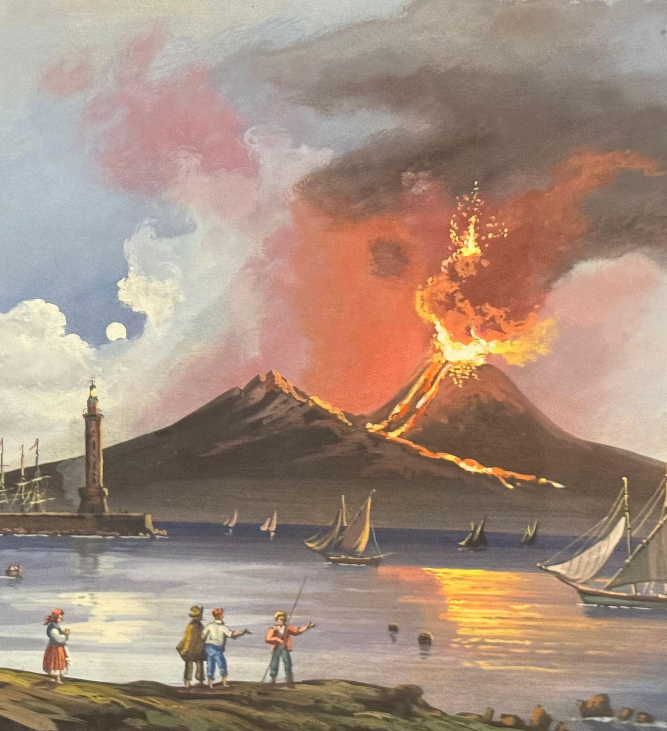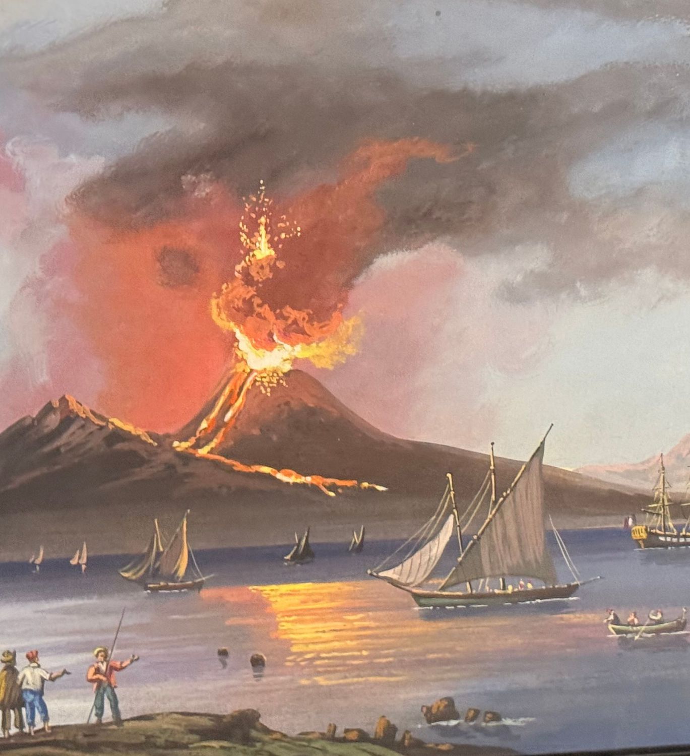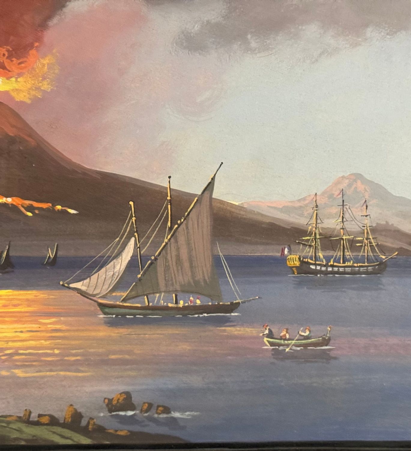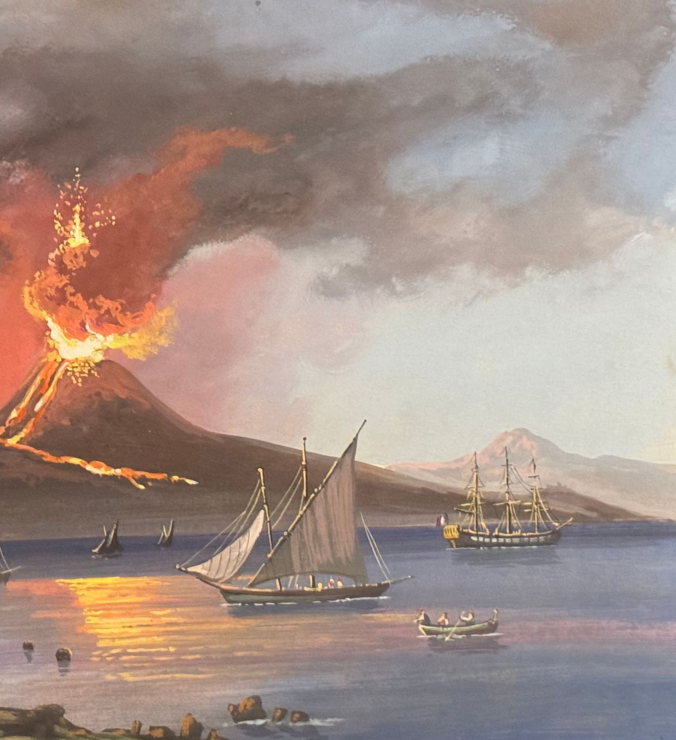 Dipinto guazzo (tempera su carta), periodo XX secolo, scuola Italiana, raffigurante Eruzione del Vesuvio. Dimensioni compreso cornice: 61x47 cm. Dimensioni interno cornice: 50x35 cm. Artista anonimo. Opera in buone condizioni. Cornice da restaurare.