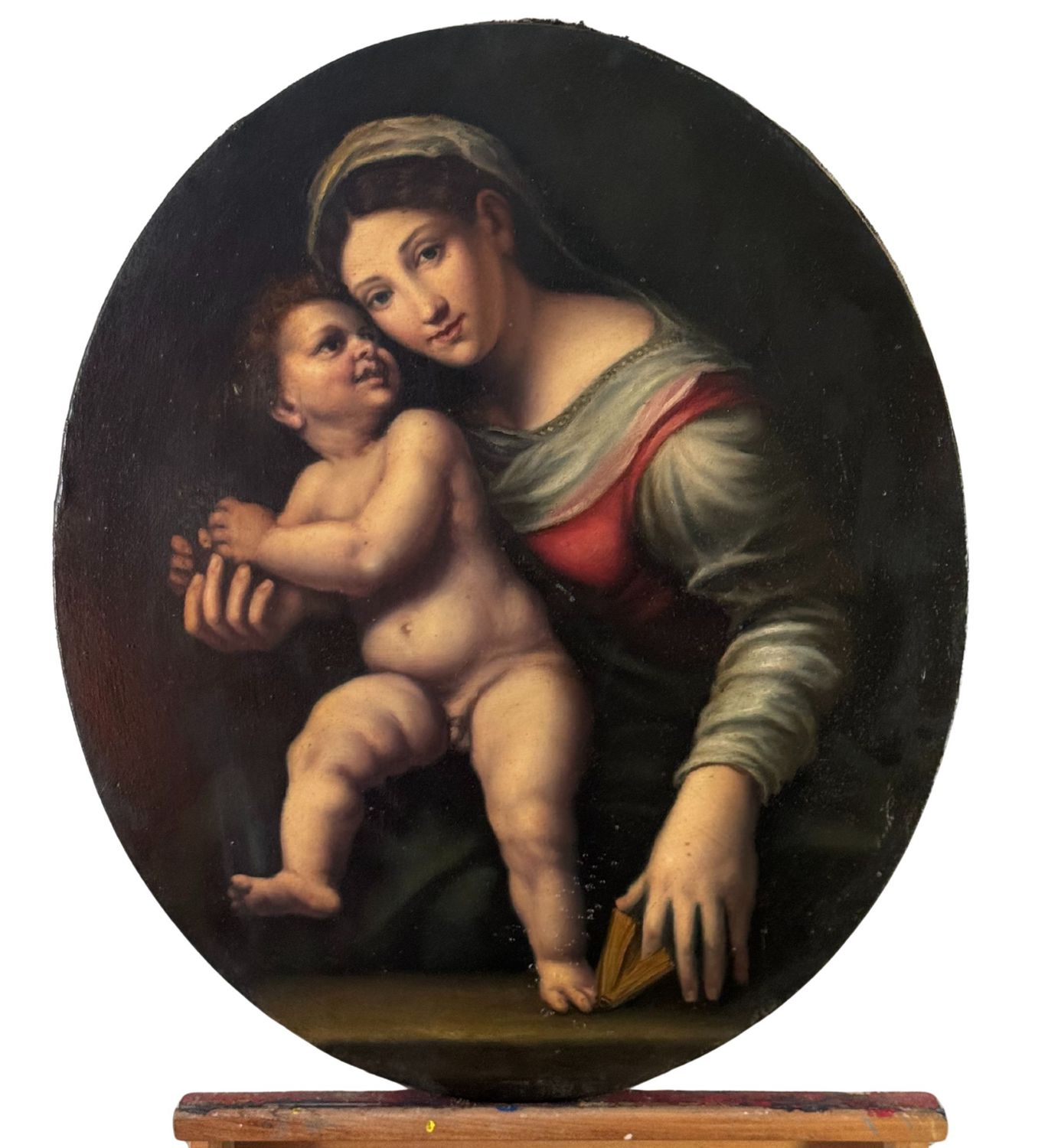 Dipinto olio su tela di forma ovale, periodo XX secolo, scuola Italiana, raffigurante Madonna con bambino (da Giulio Romano). Dimensioni: 65x55 cm. Artista anonimo. Opera in buone condizioni con lievi segni di vissuto come da foto allegate.