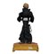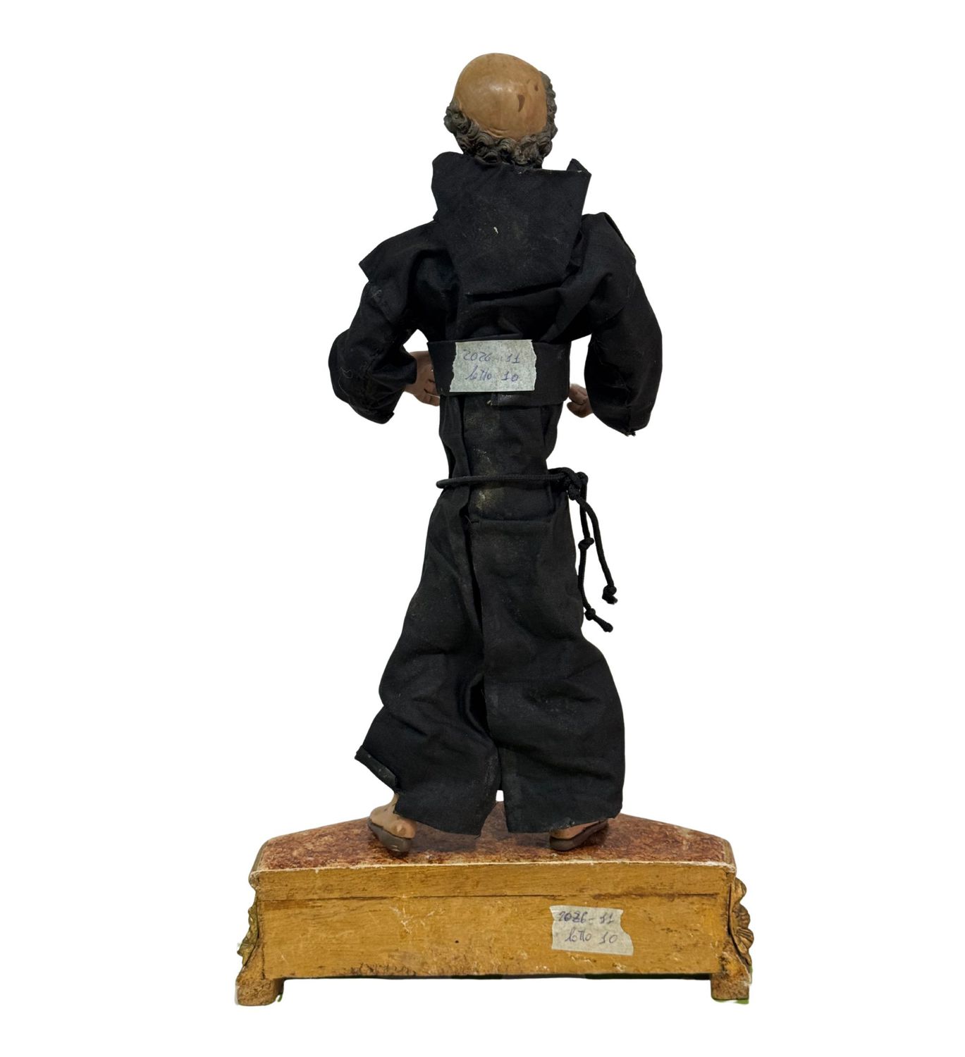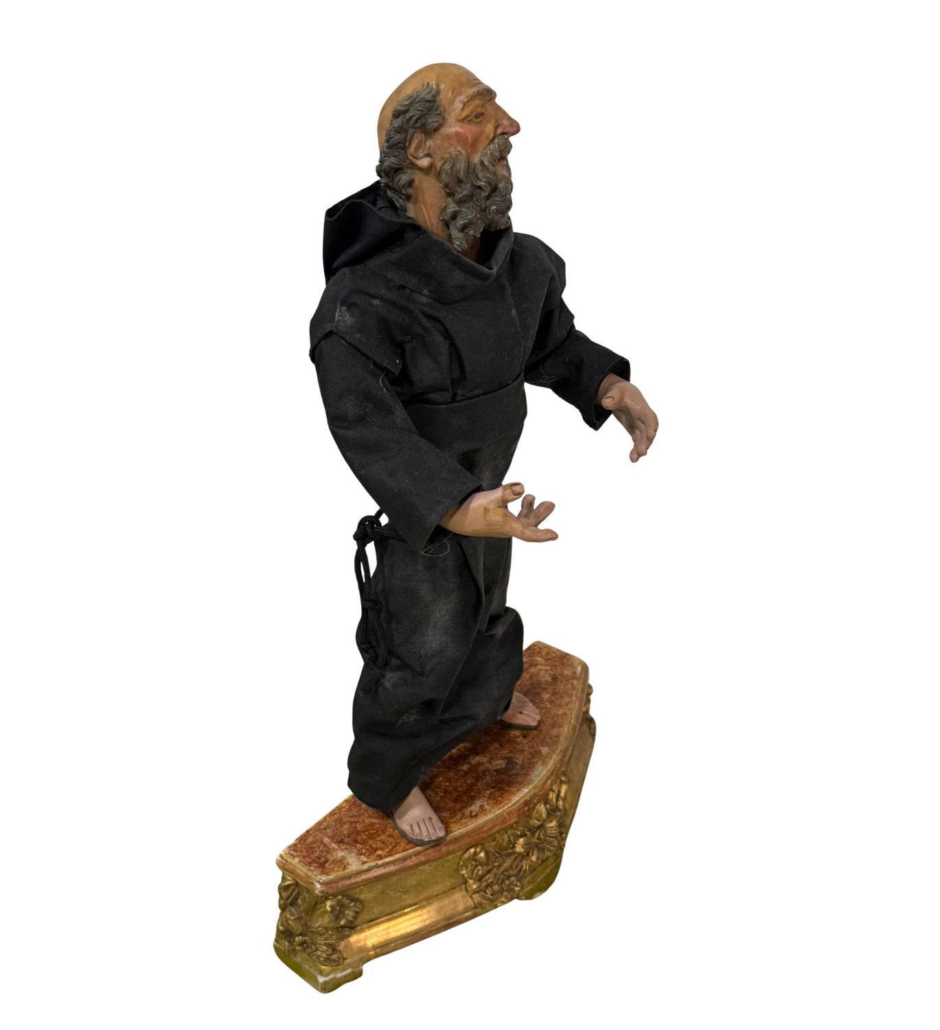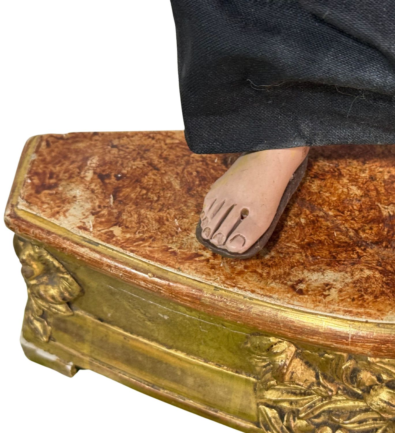 Pastore da presepe napoletano, così composto: testa, mani e piedi in terracotta policromo, occhi in vetro, corpo in stoppa, abito in stoffa. Poggiante in base in legno dorata. Periodo XX secolo. Dimensioni: h48(compresa la base), h40(esclusa la base).
