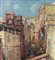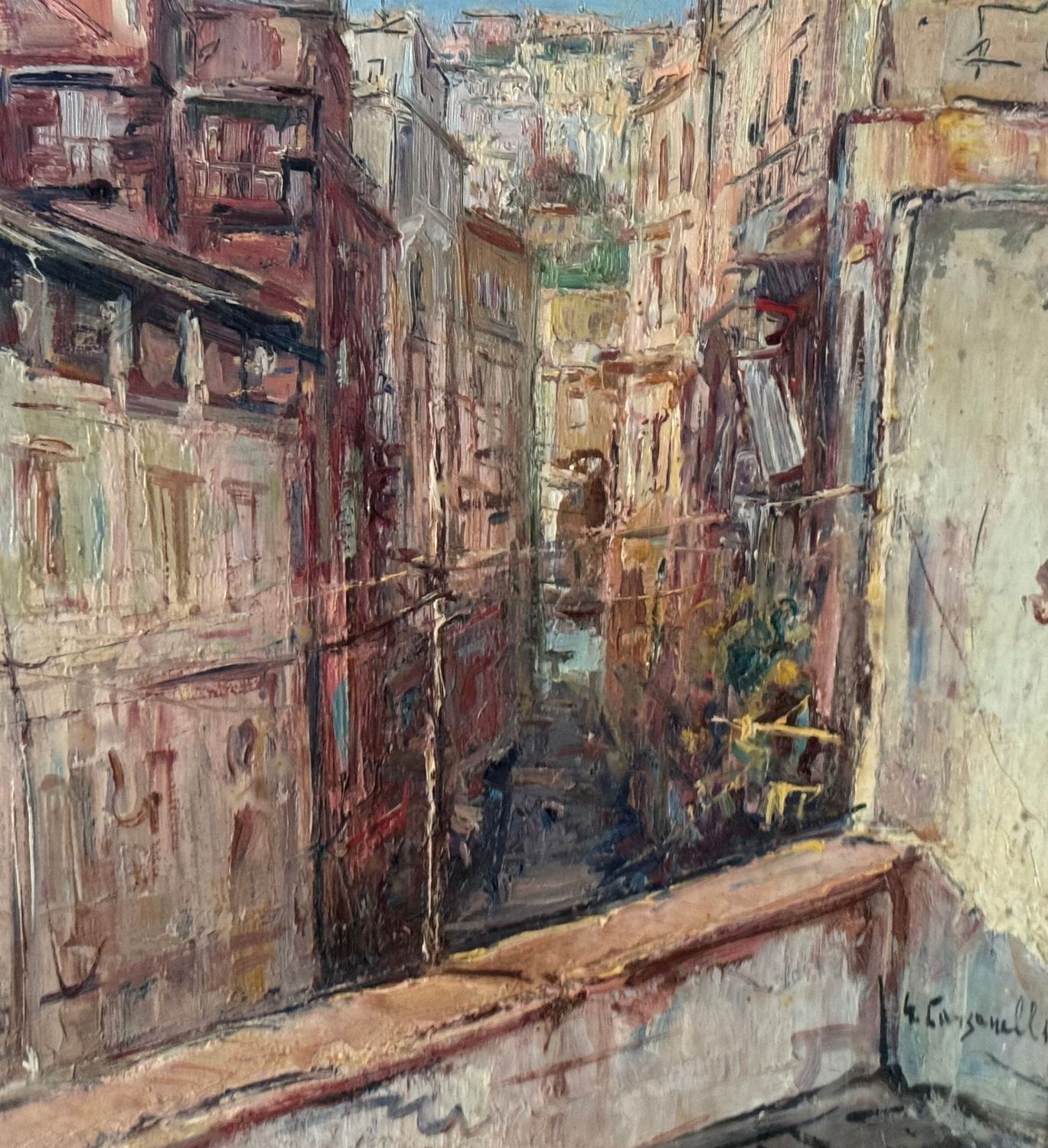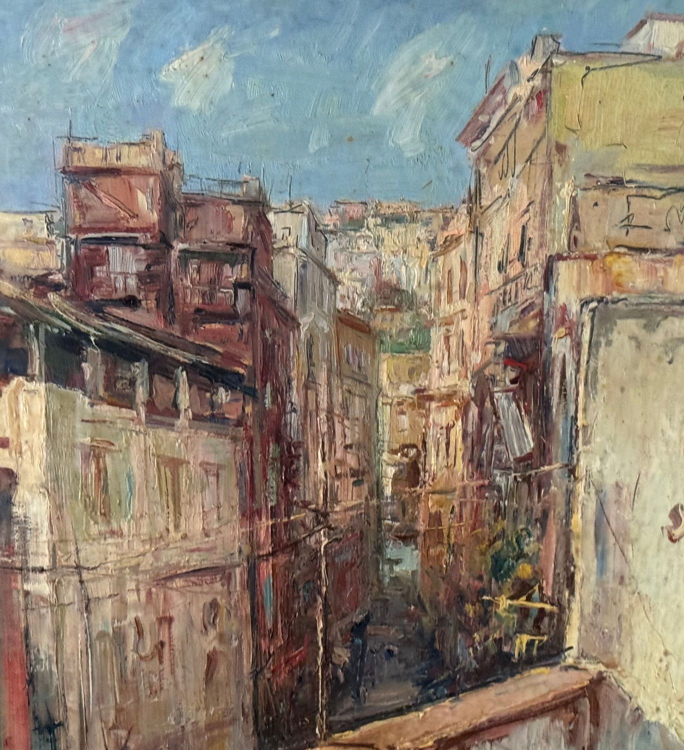 Dipinto olio su tavola, periodo XX secolo, scuola Italiana, raffigurante Strada con edifici. Dimensioni compreso cornice: 65x75 cm. Dimensioni interno cornice: 45x55 cm. Firmato in basso a destra Nicola Canzanella. Opera in buone condizioni.