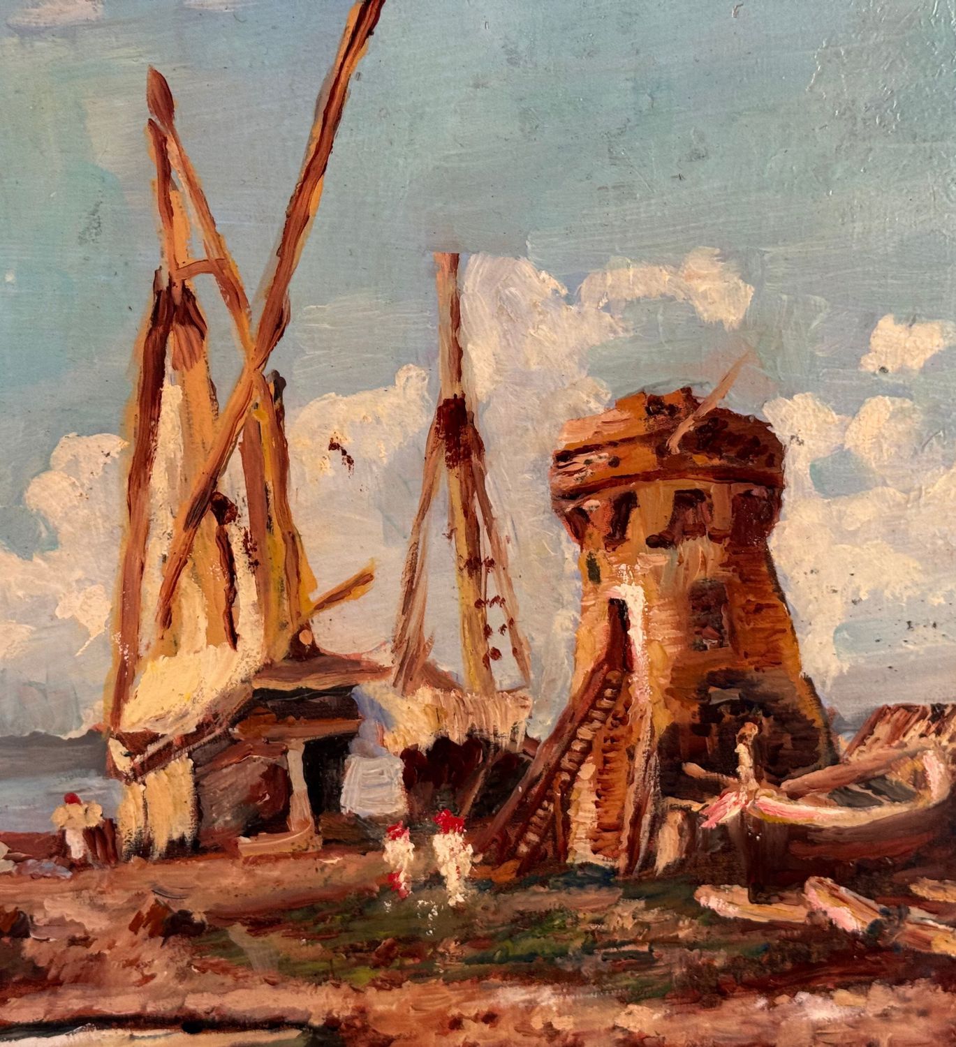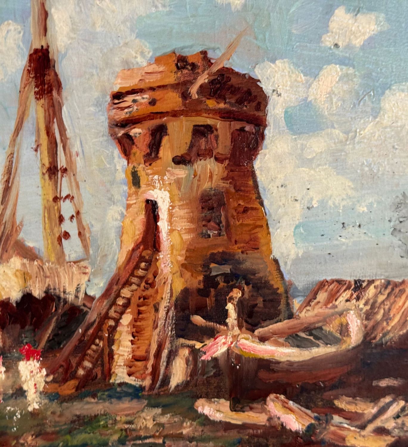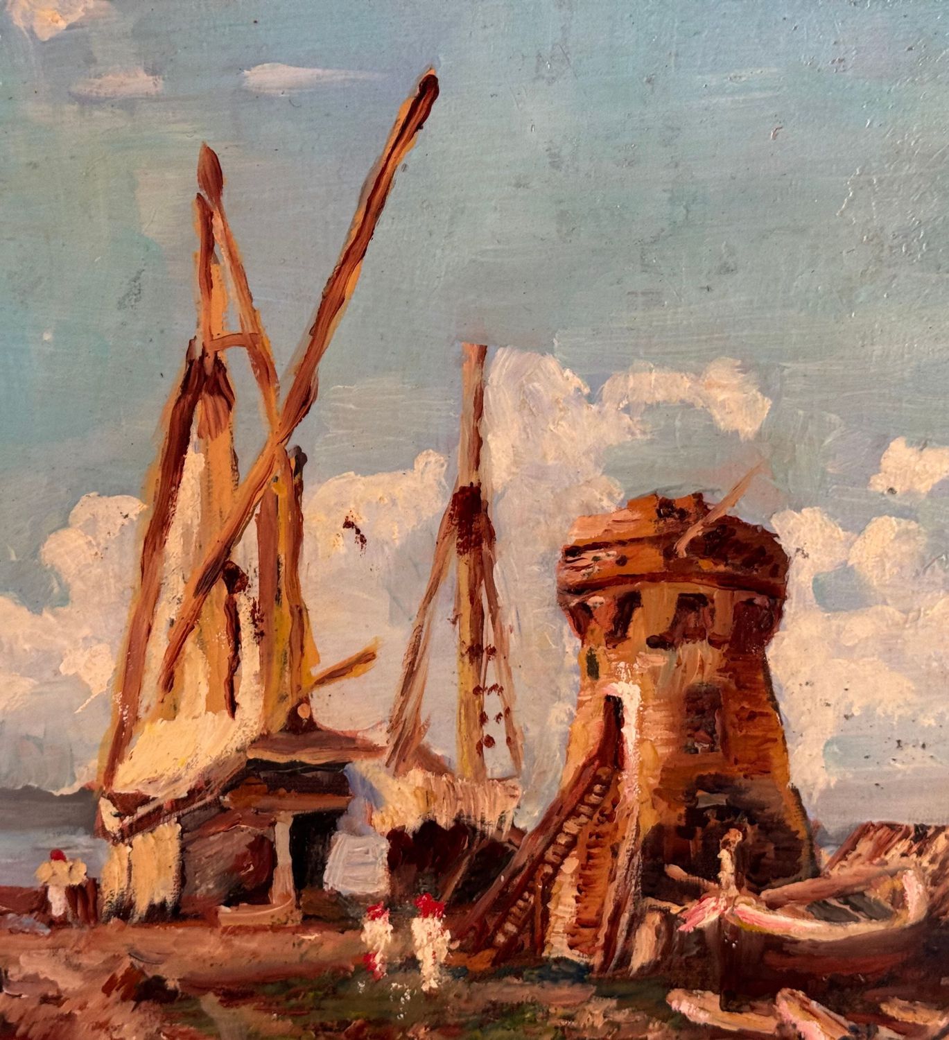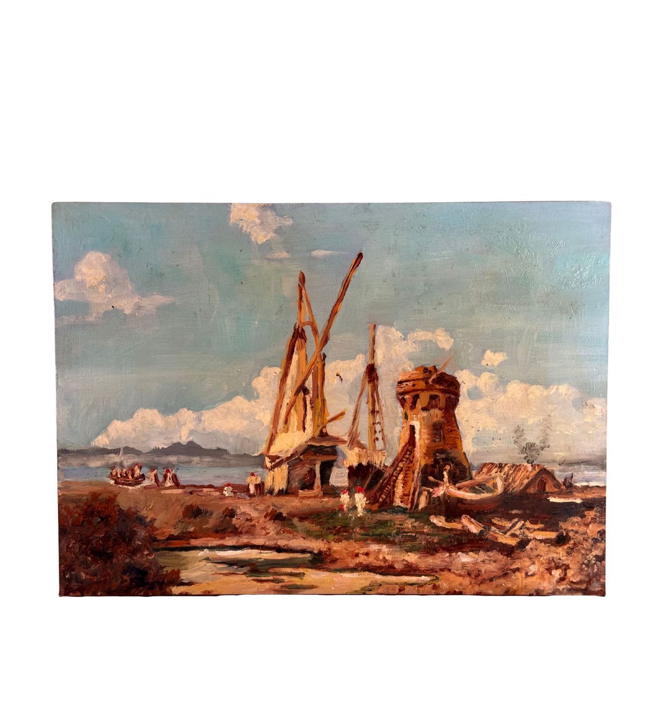 Dipinto olio su tavola, periodo XX secolo, scuola Italiana, raffigurante Cantiere su marina. Dimensioni: 42x30 cm. Artista anonimo. Opera in buone condizioni.