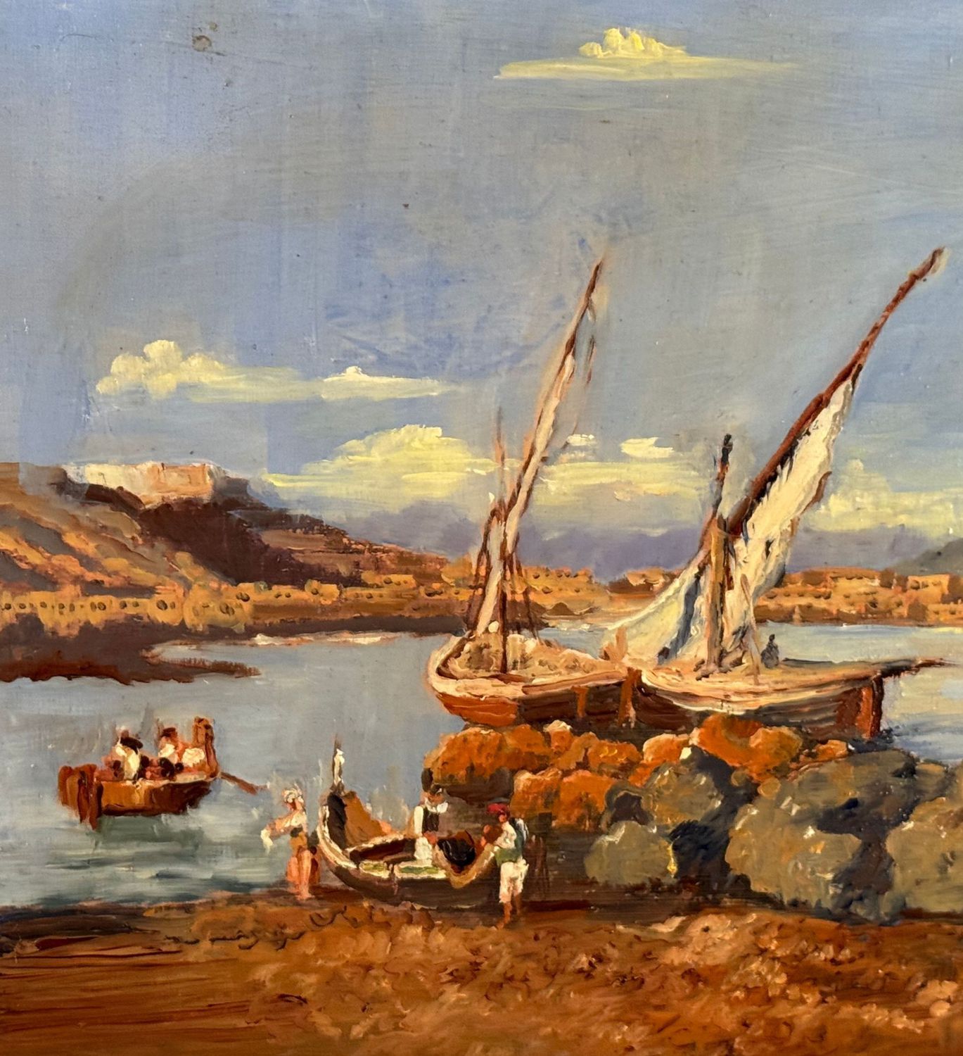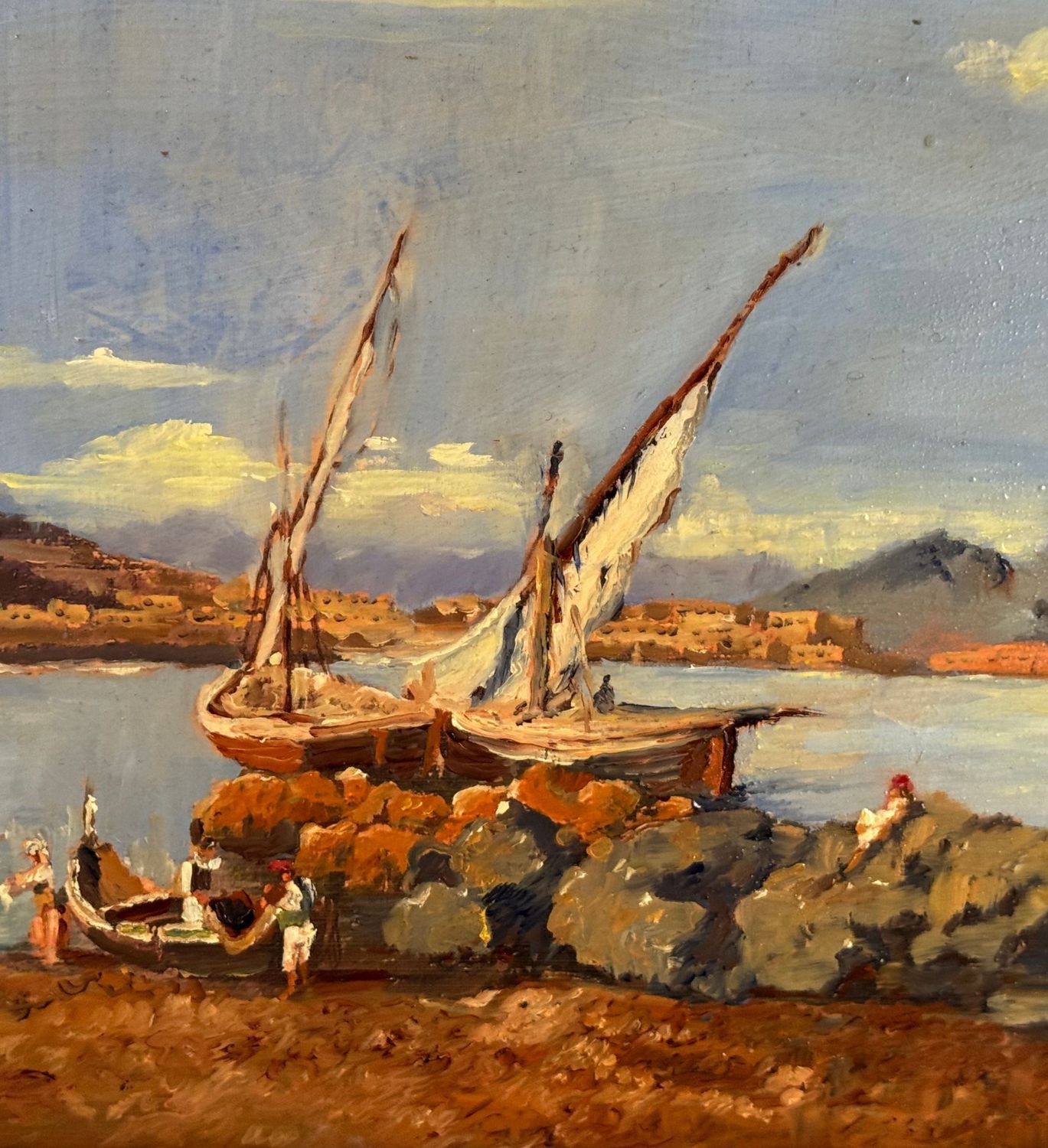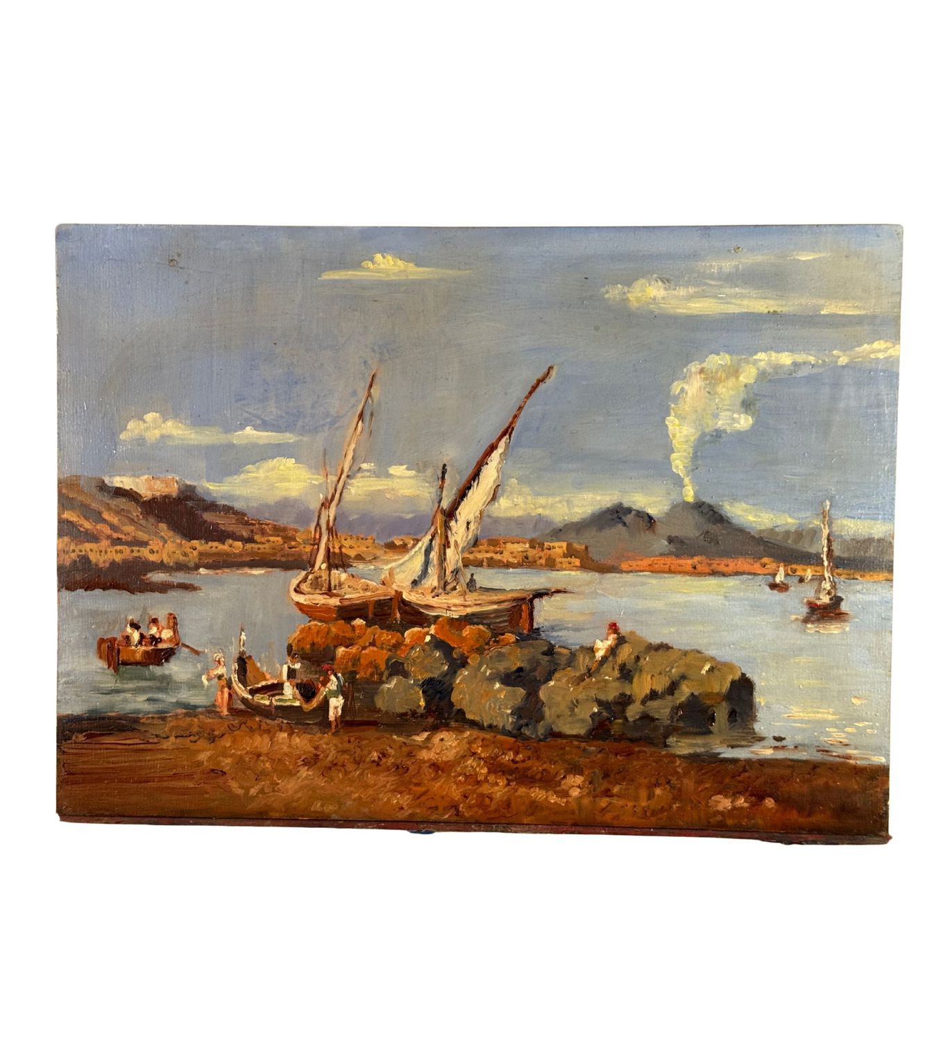 Dipinto olio su tavola, periodo XX secolo, scuola Italiana, raffigurante Scorcio di marina con barche e pescatori. Dimensioni: 42x30 cm. Artista anonimo. Opera in buone condizioni.