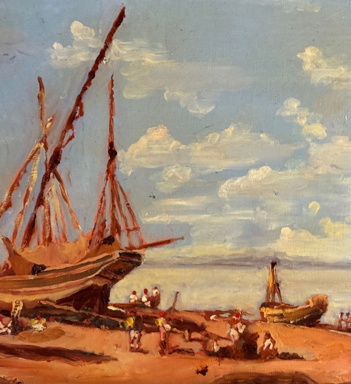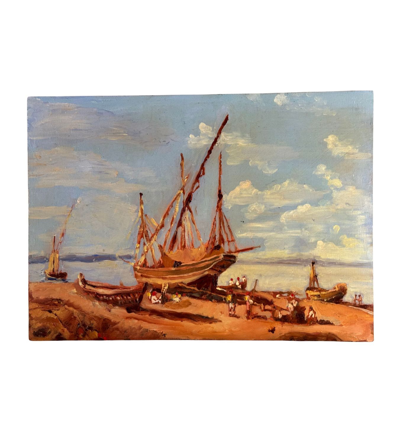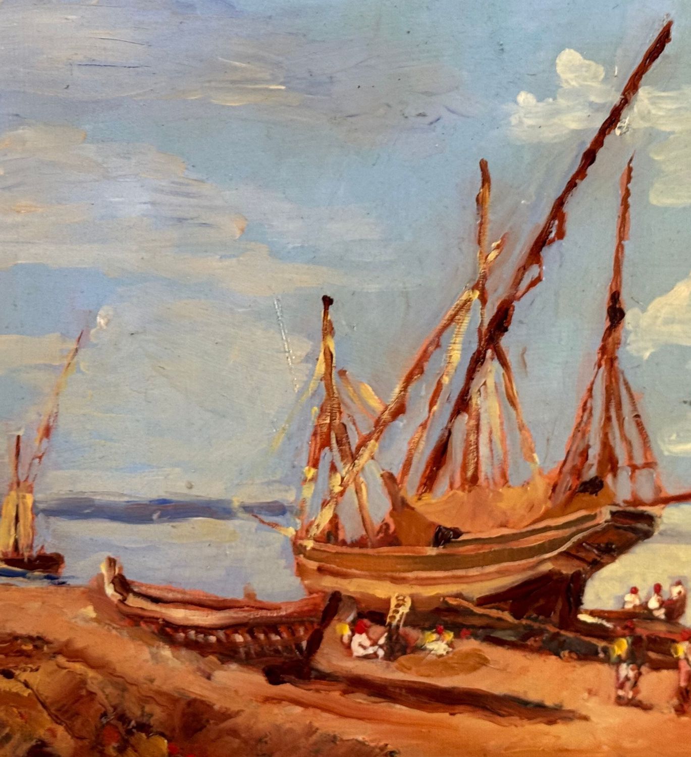 Dipinto olio su tavola, periodo XX secolo, scuola Italiana, raffigurante Scorcio di marina con barche a secco. Dimensioni: 42x30 cm. Artista anonimo. Opera in buone condizioni.