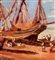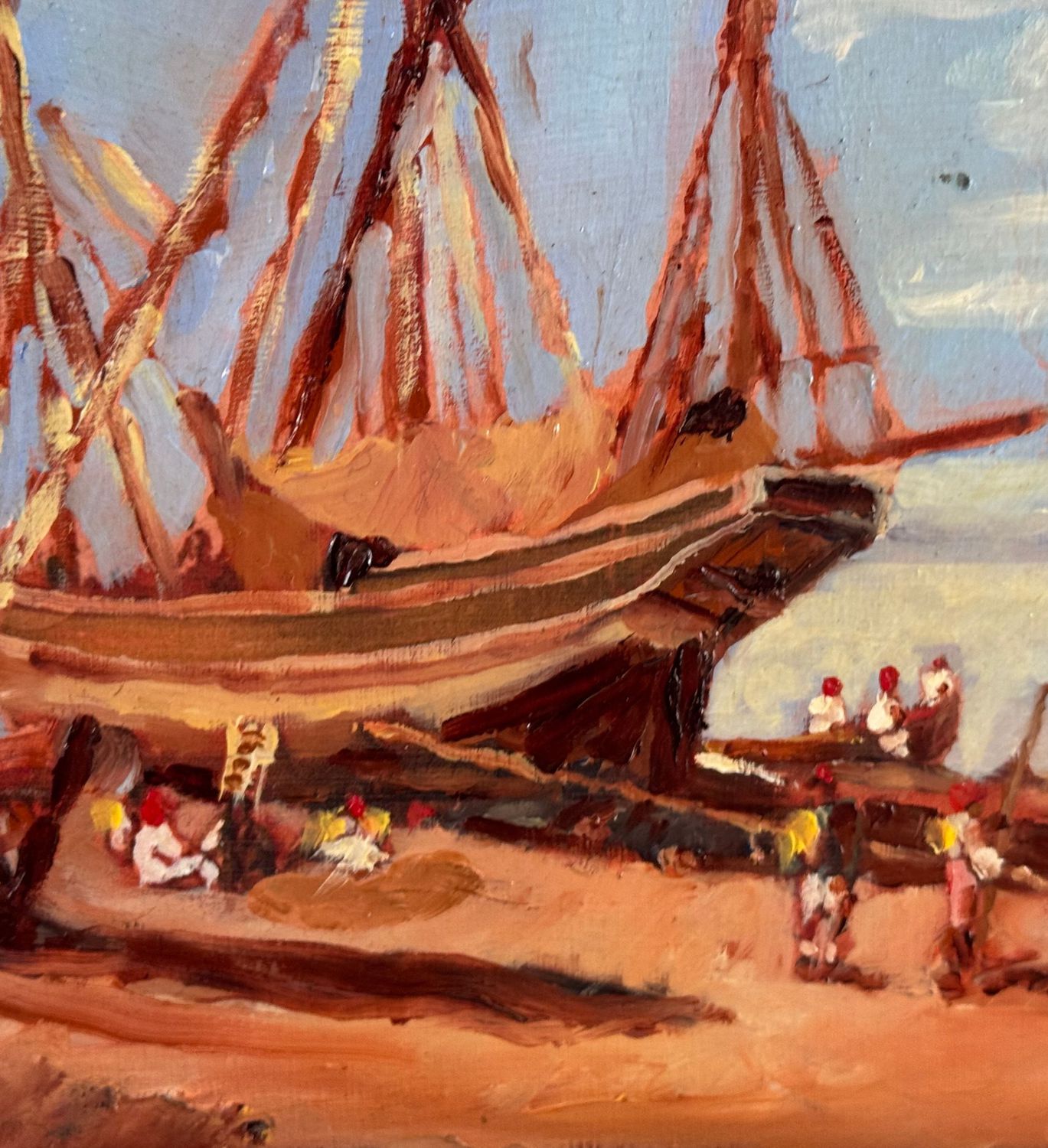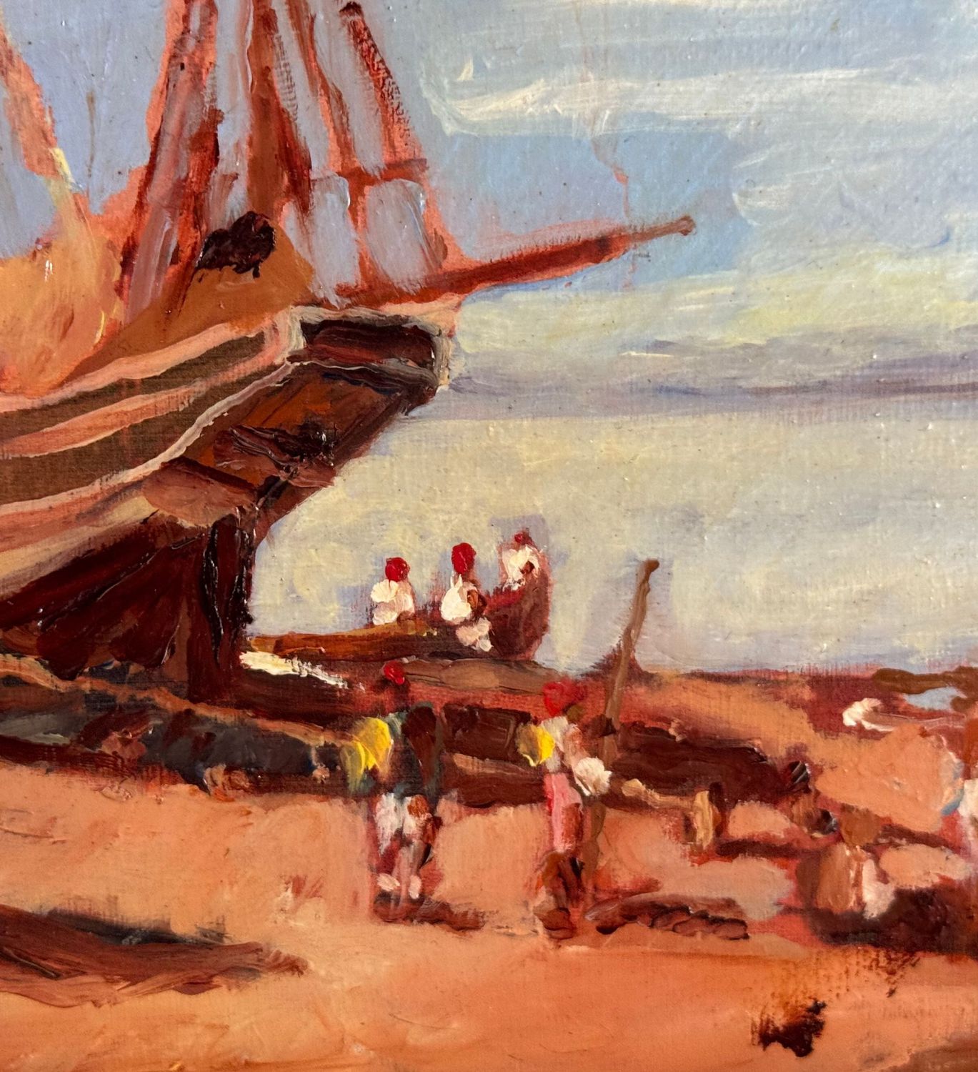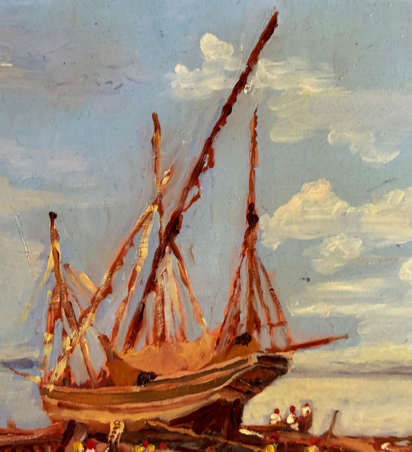 Dipinto olio su tavola, periodo XX secolo, scuola Italiana, raffigurante Scorcio di marina con barche a secco. Dimensioni: 42x30 cm. Artista anonimo. Opera in buone condizioni.