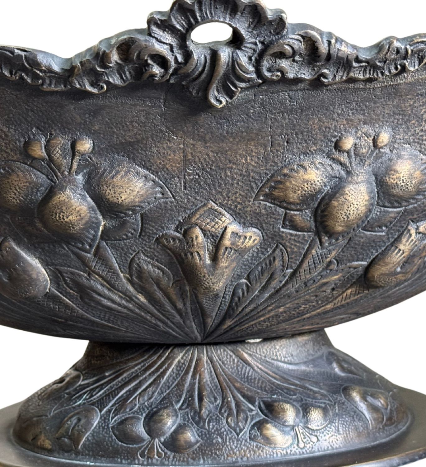 Vaso centrotavola cesellato a mano in bronzo patinato, periodo XIX/XX secolo. Dimensioni: 72x24x35 cm. In buone condizioni.