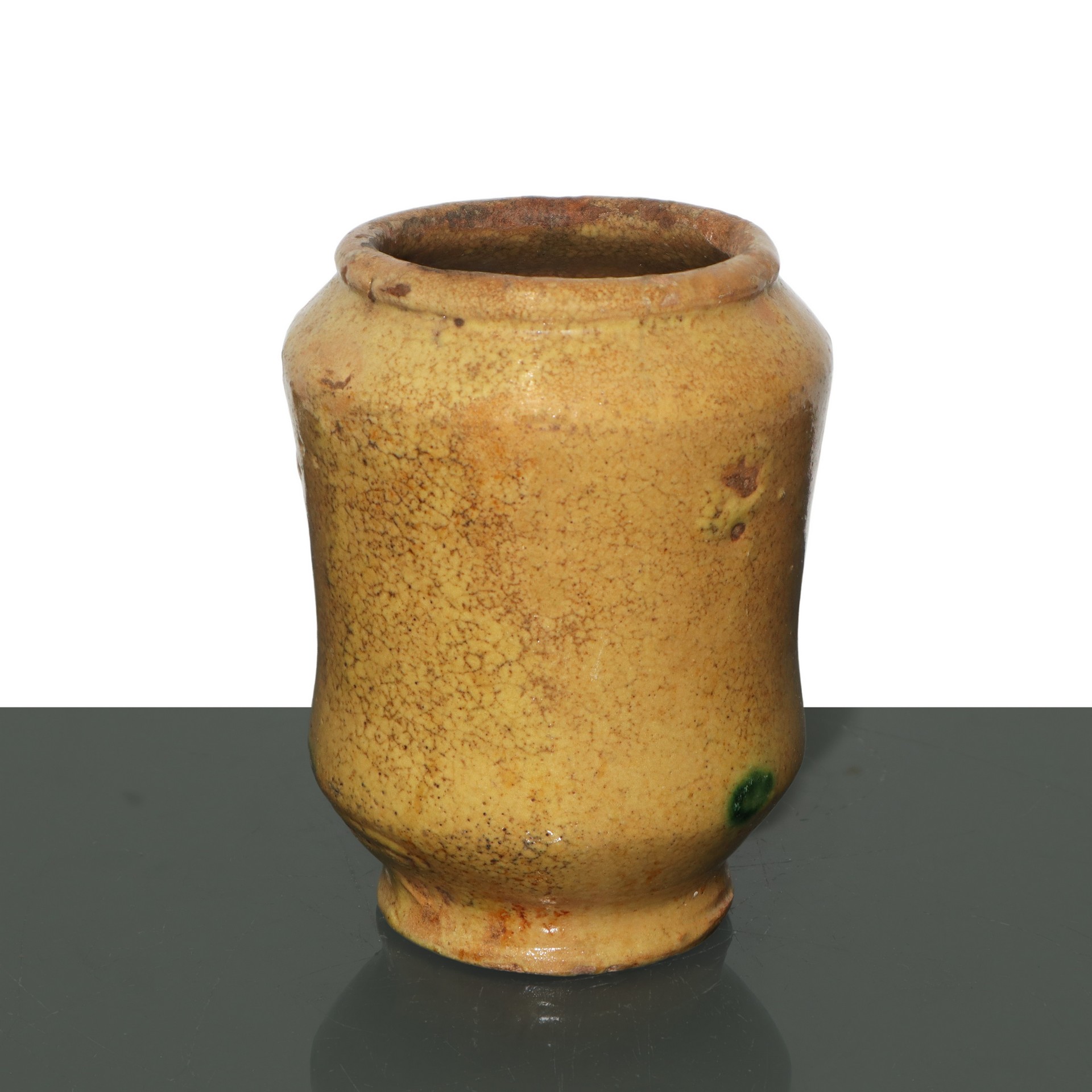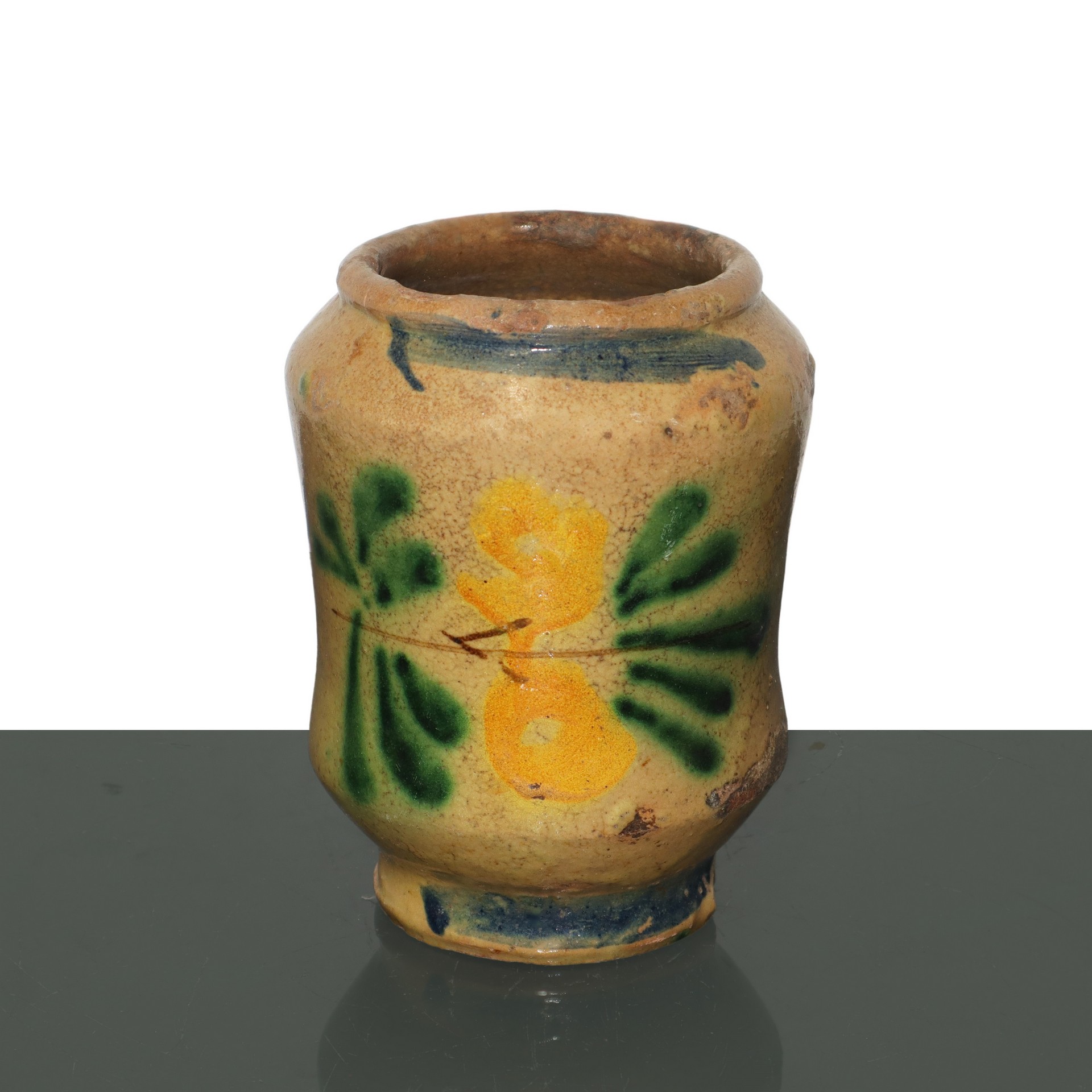 Lot 34 | Piccolo cilindro in maiolica di Caltagirone con fiore borbonico dipinto policromo sul fronte, fine 19th/20° secolo
