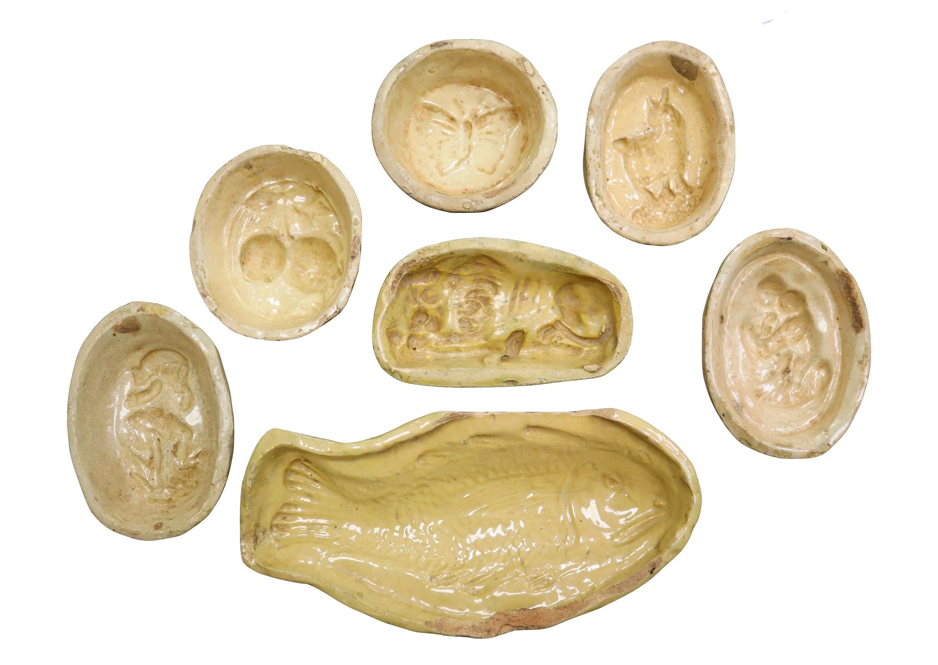 Gruppo di 7 formelle per mostarda Formella stampo pesce : 29 x 10 cm. Altre formelle cm 17 x 7, 14 x 8 , Diametro 12, 15 , 14, 15 Forme e stampo vario, presenti mancanze (evidenti sul pesce).