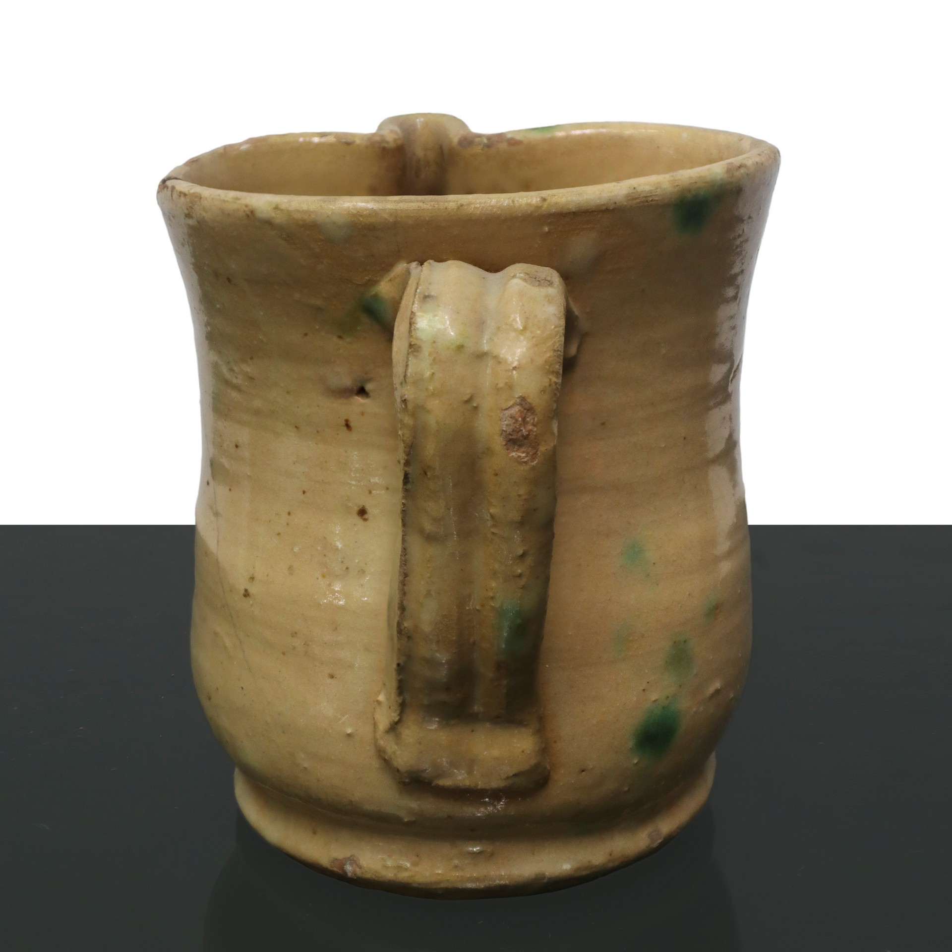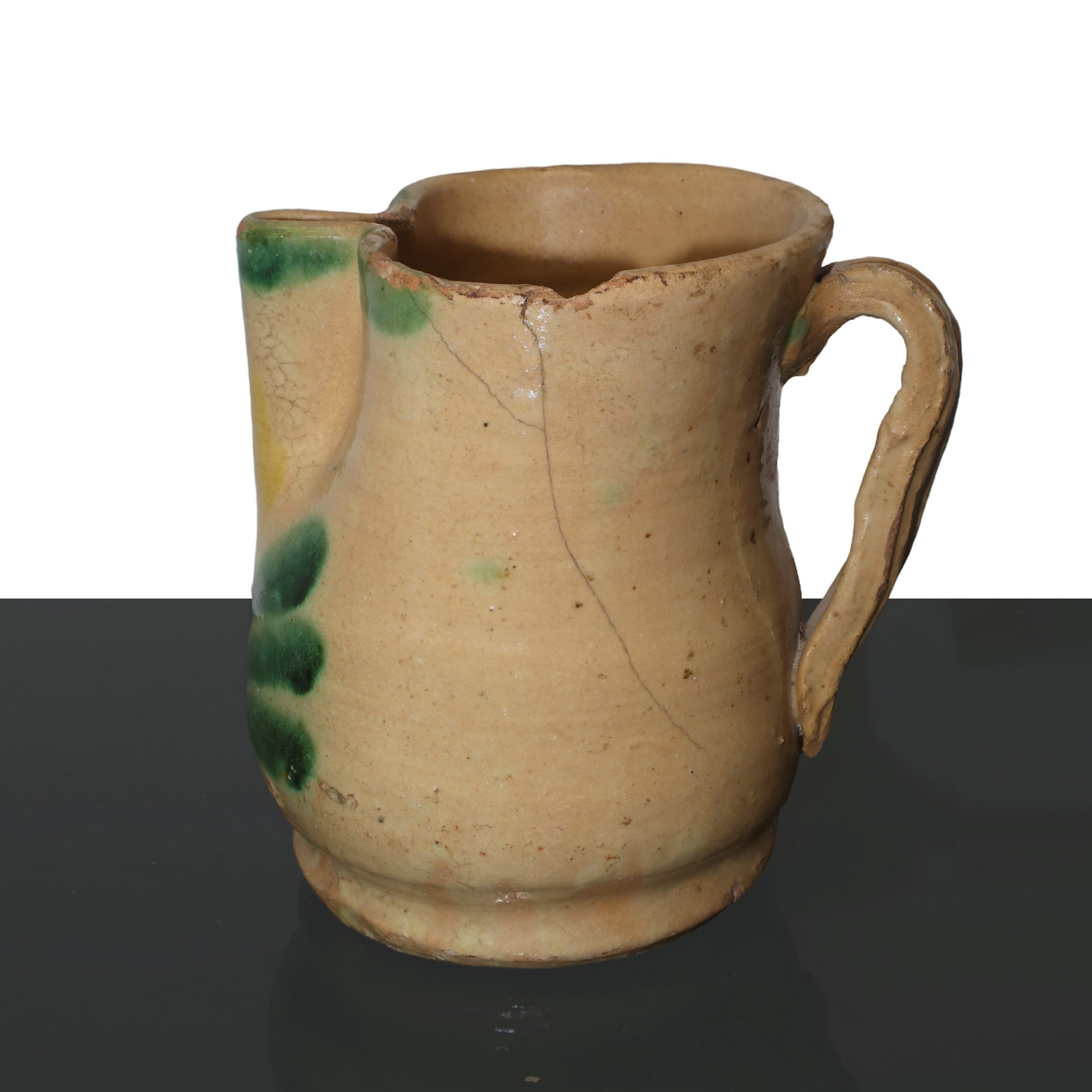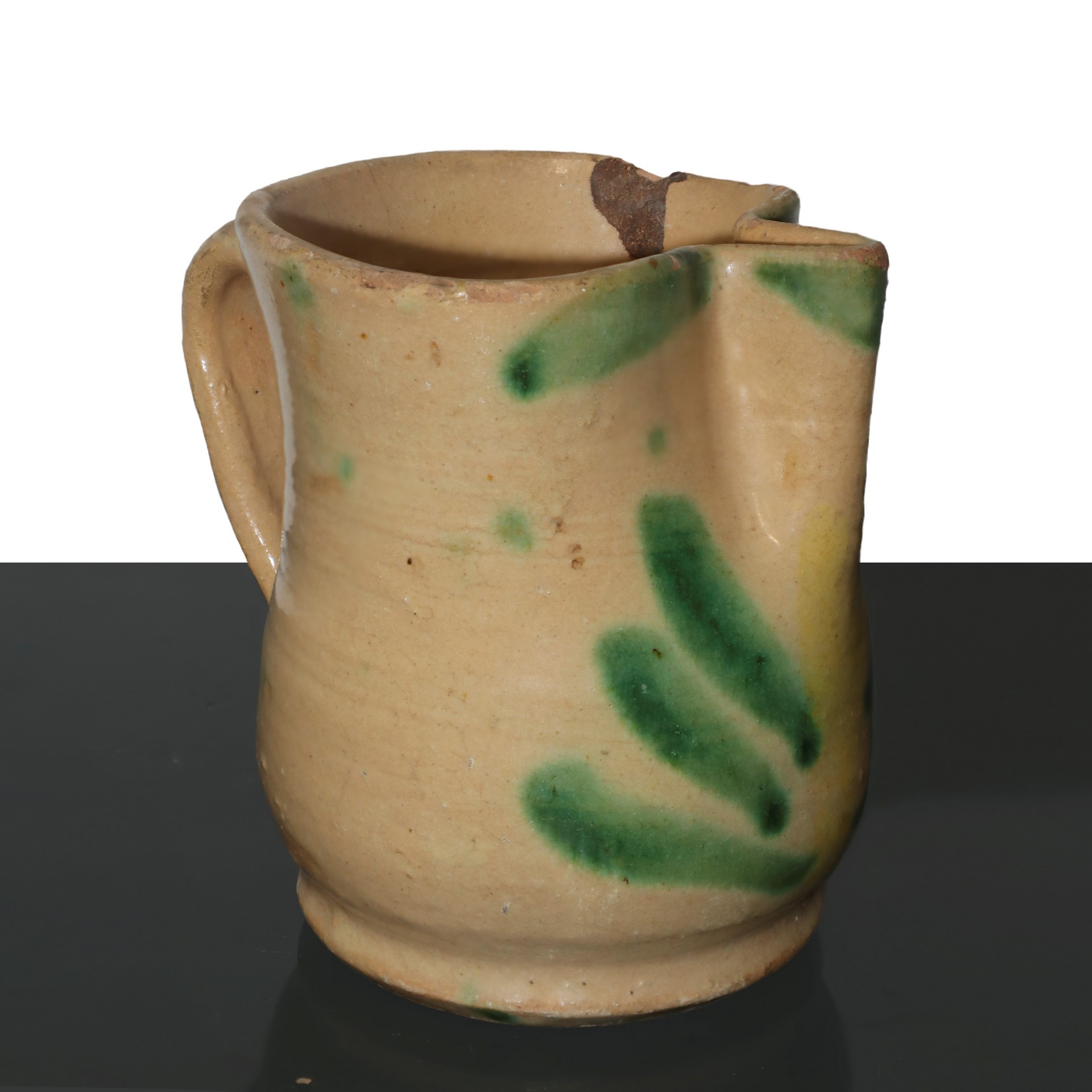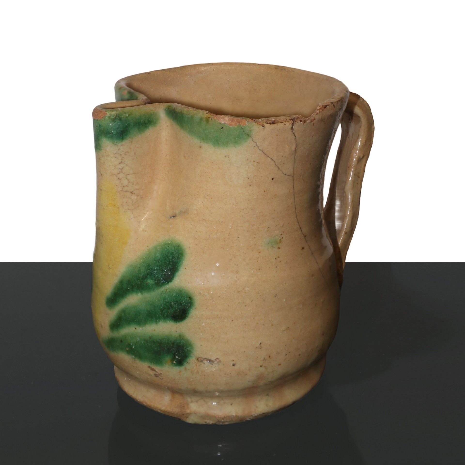 Cannata in miaolica policroma di Caltagirone. smaltata con decori di foglie, 20° secolo h cm 13,5 Presente filatura