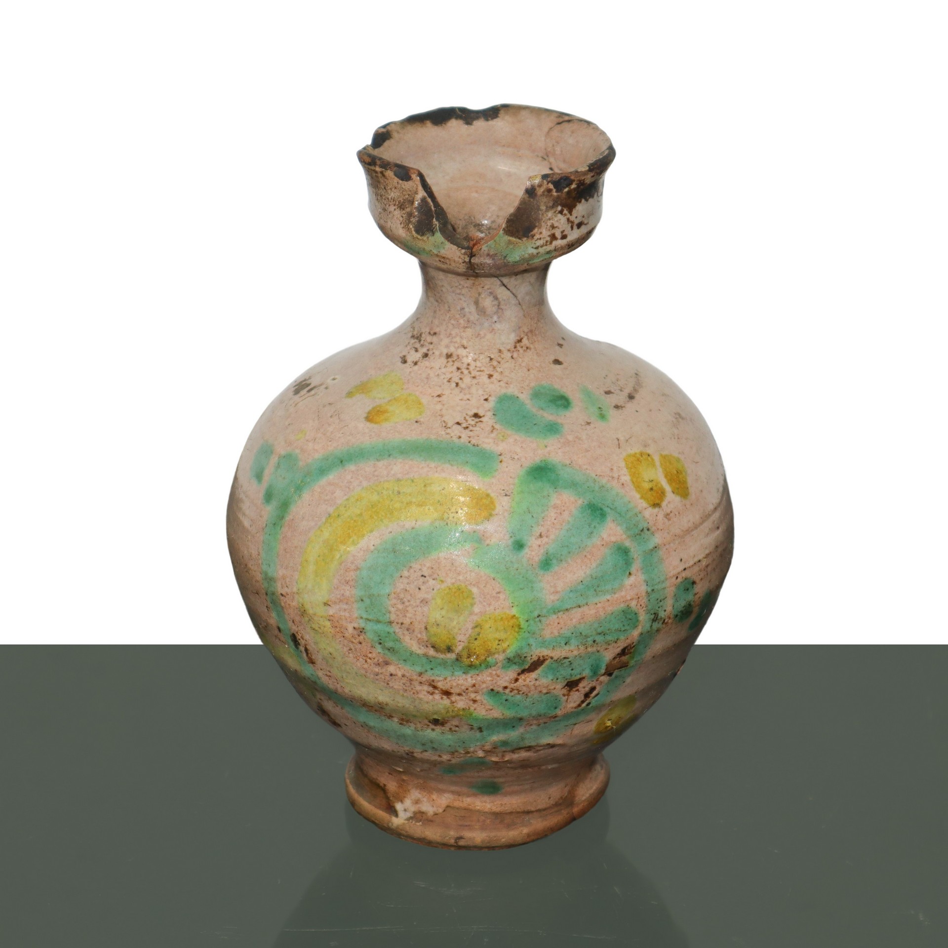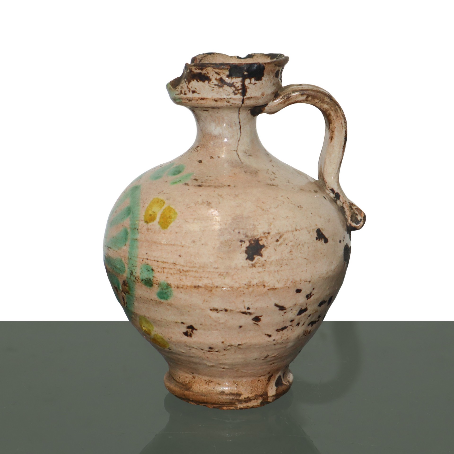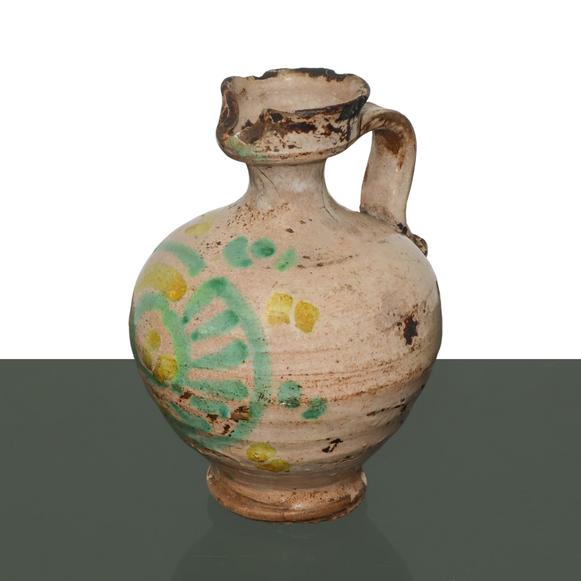 Orciolo con manico in maiolica di Caltagirone con decorazioni verdi e gialle, 19° secolo h cm 15