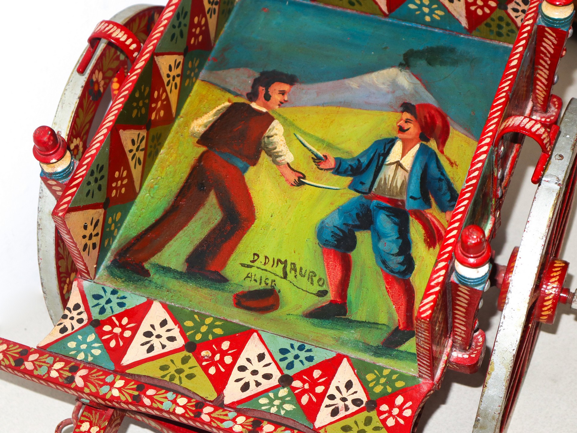 Domenico Di Mauro (Guardia Mangano 1913 - Aci S. Antonio 2016) - Piccolo carretto siciliano in legno dipinto policromo con Etna e scena di combattimento cm 35X100X40 Firmato Di Mauro, Alice