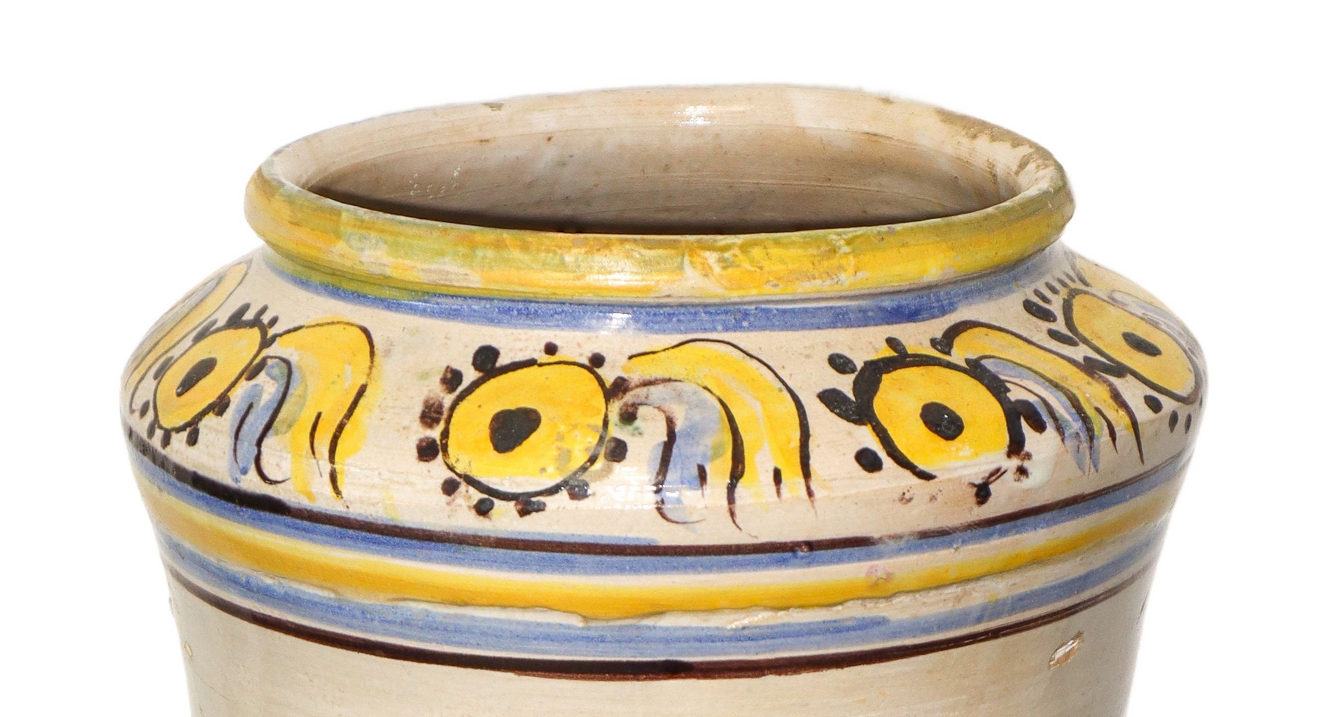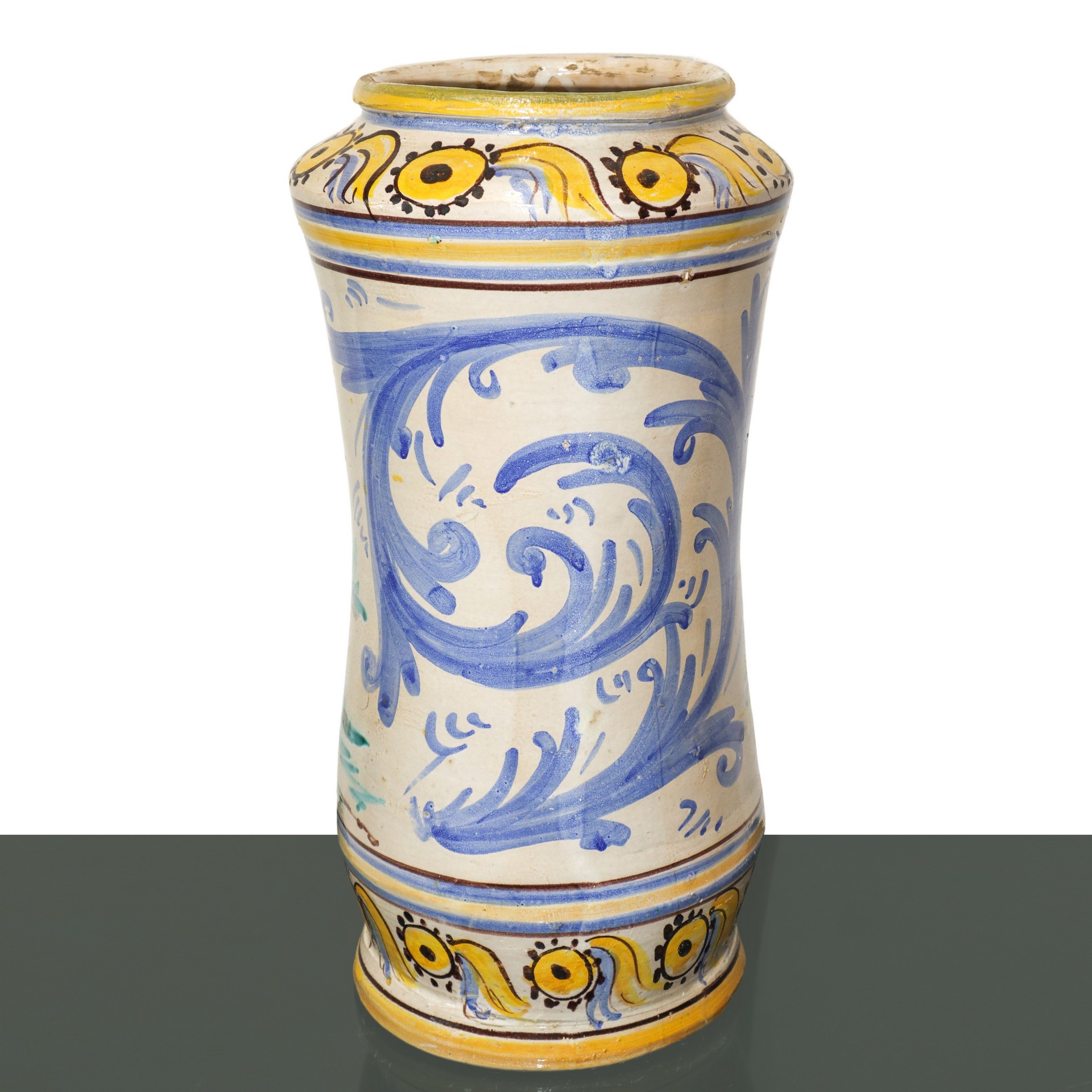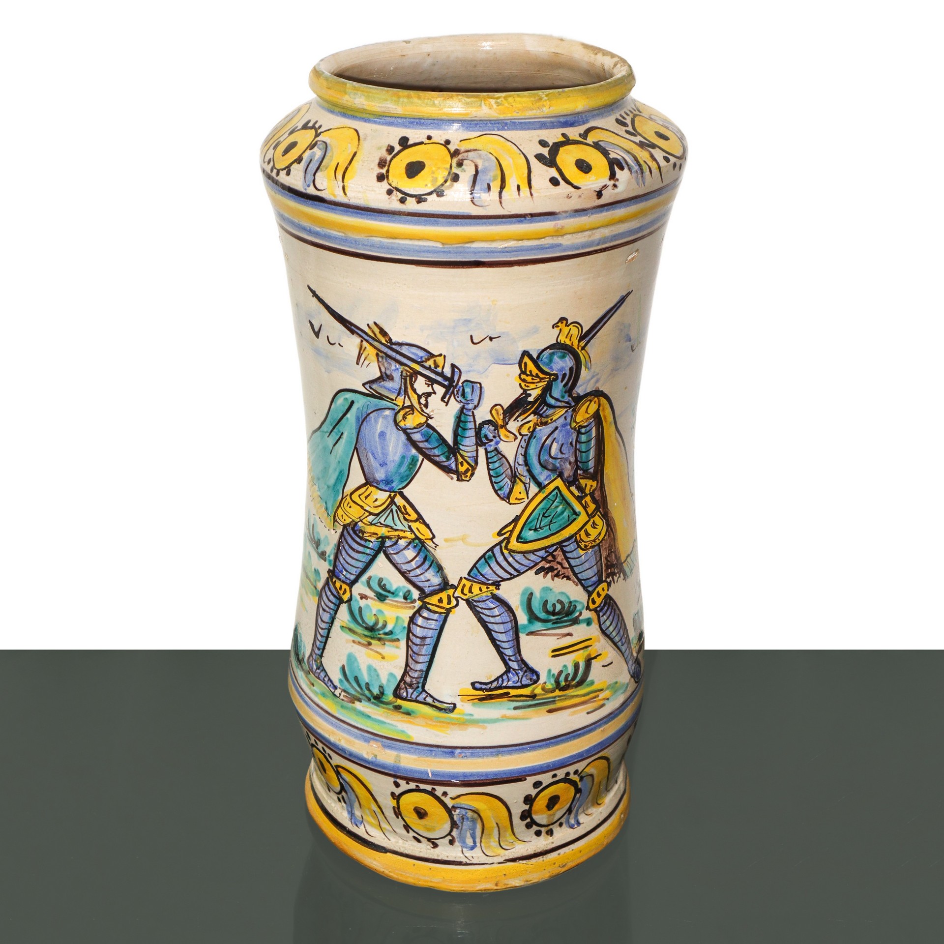 Grande cilindro in maiolica di Caltagirone dipinto policromo con raffigurazione di pupi siciliani, 20° secolo
