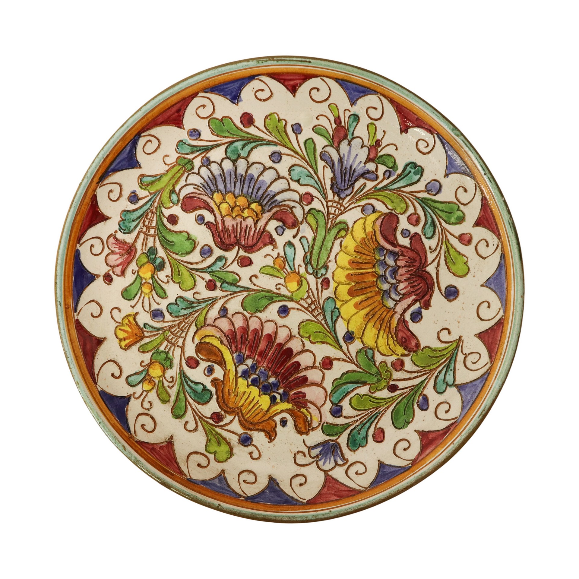 Piatto in ceramica policroma dipinta a motivi floreali e smaltata