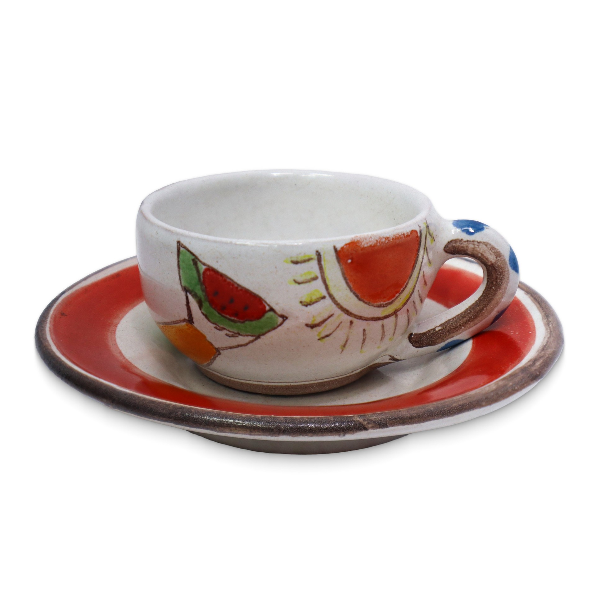 De Simone - Servizio da caffe' per sette, in ceramica dipinta a mano, motivi vari, 1960/1970 piattino H cm 2,5x12,5 - tazzina H cm 4,5x9 Con 7 piattini e 7 tazzine da caffe'. Firmati alla base De Simone Italy.