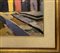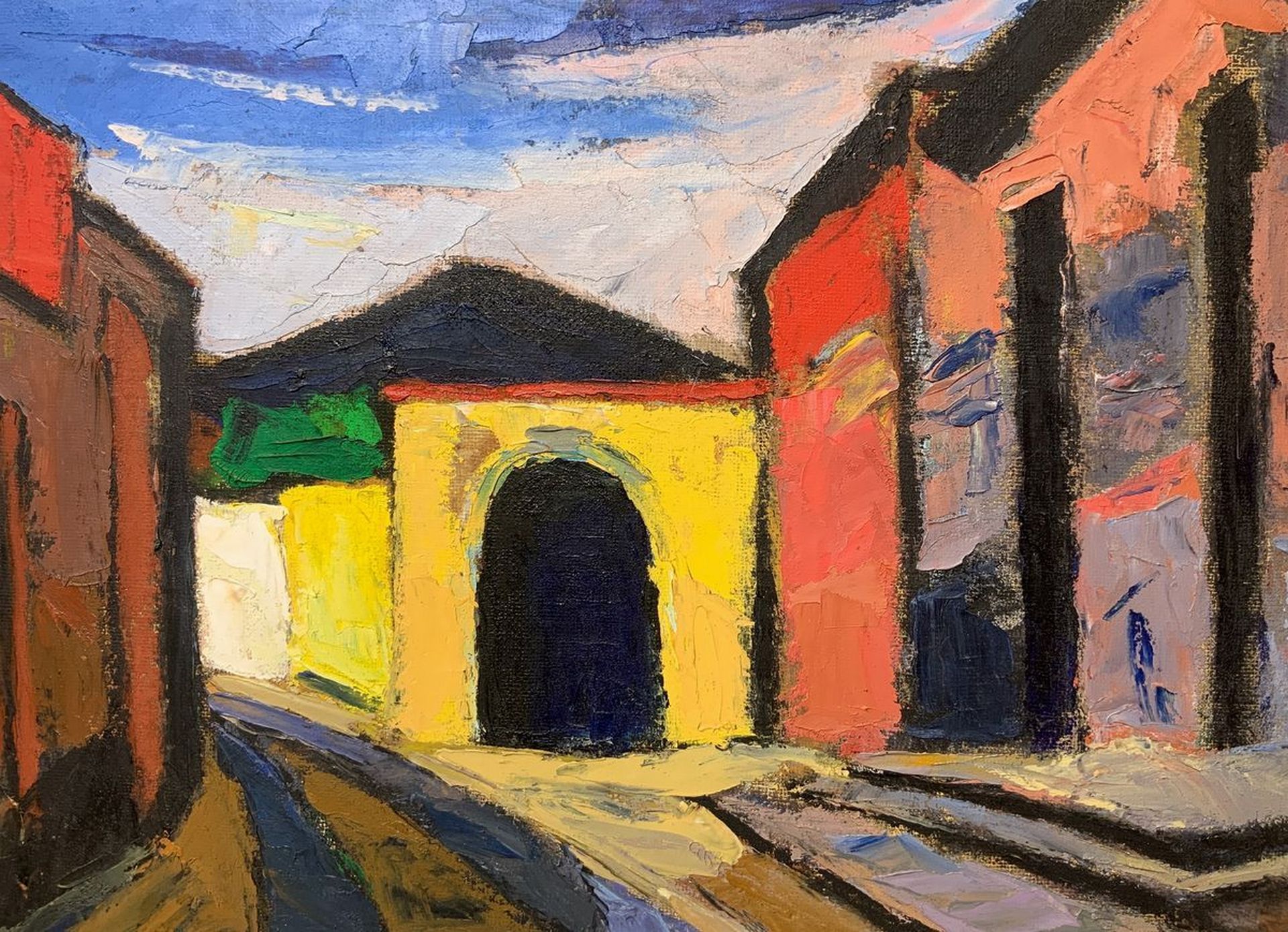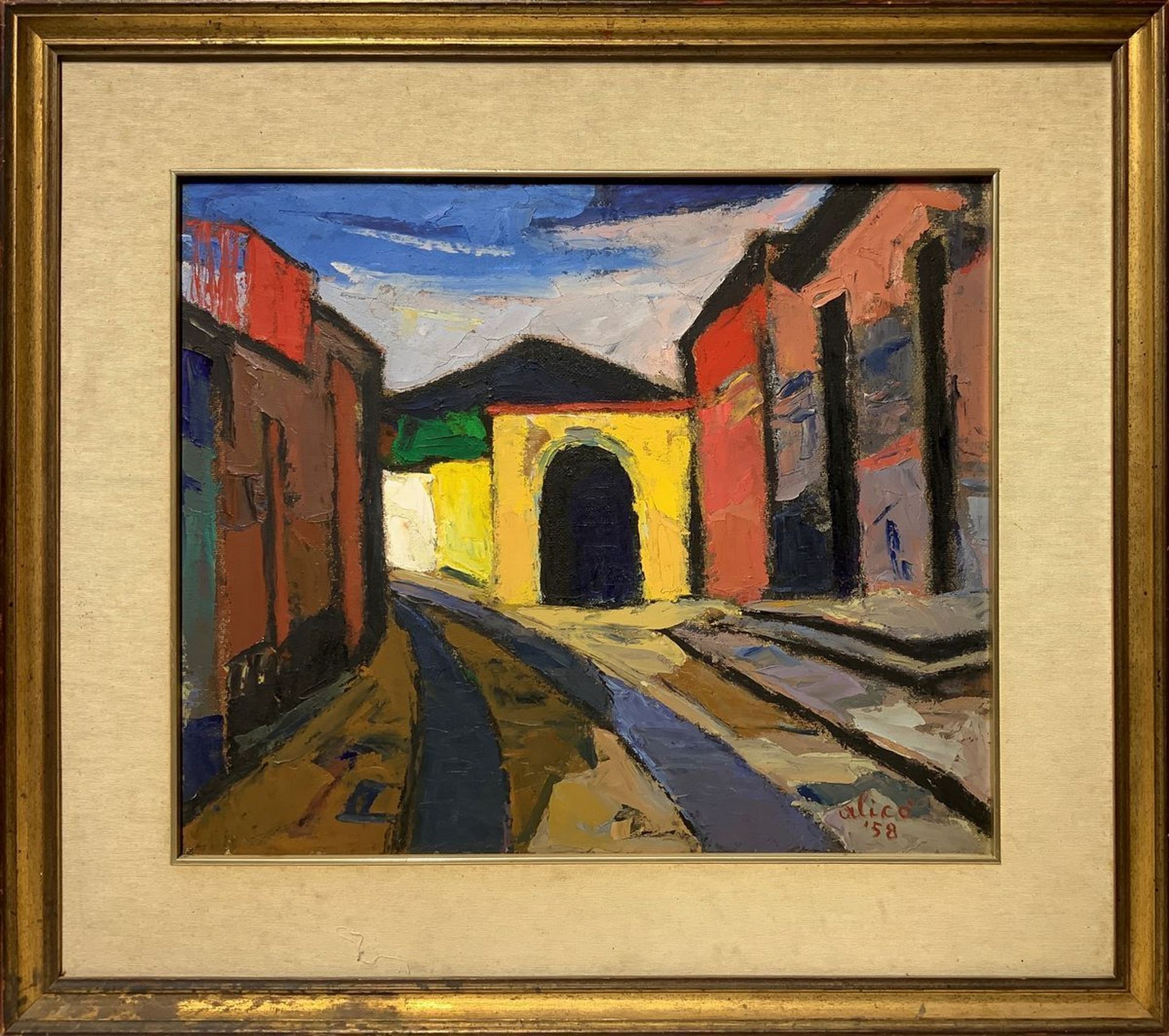 Giovanni Alicò (Catania 1906 - Milano 1971) - Strada di paese con case (Aci Sant'Antonio) ed Etna in prospettiva., 1958 Cm 50x60, in cornice cm 71x81 Dipinto ad olio su tavola