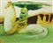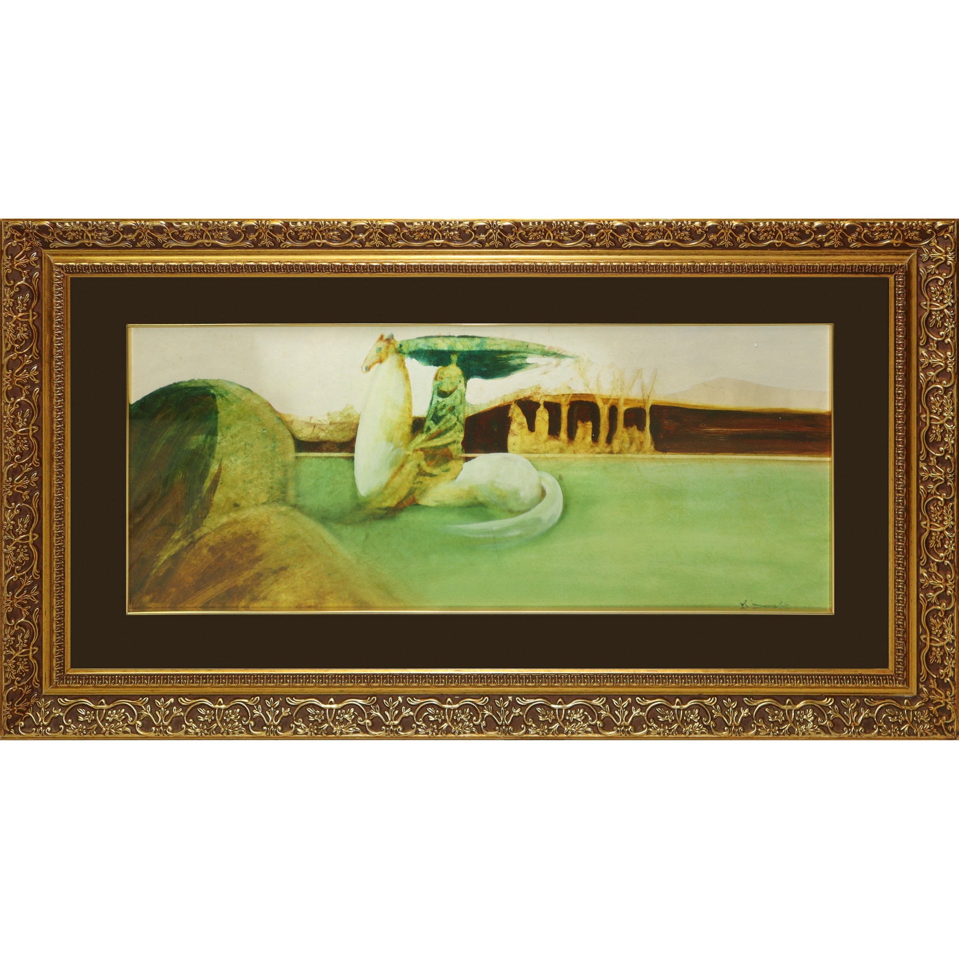 Cesare D'Angelo (Catania 1940 - 2006) - Paesaggio con donna a cavallo H cm 30x70 - in cornice H cm 52x92 Olio su faesite
