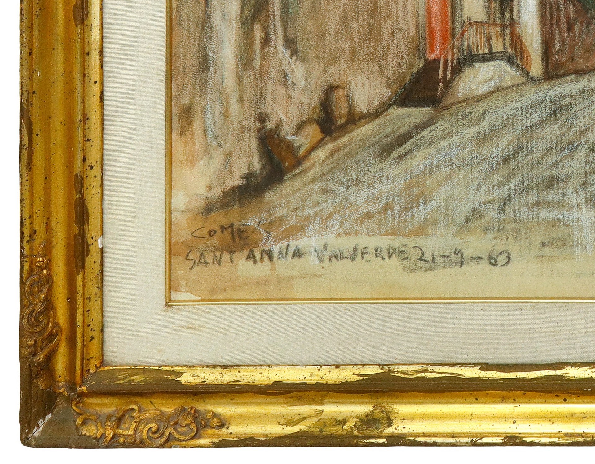 Carmelo Comes (Catania 1905 - Catania 1988) - Scorcio urbano di Valverde, 1963 h cm 45x60 con cornice h cm 65x81 Tecnica mista su carta Firma, soggetto e data di esecuzione in basso a sinistra.