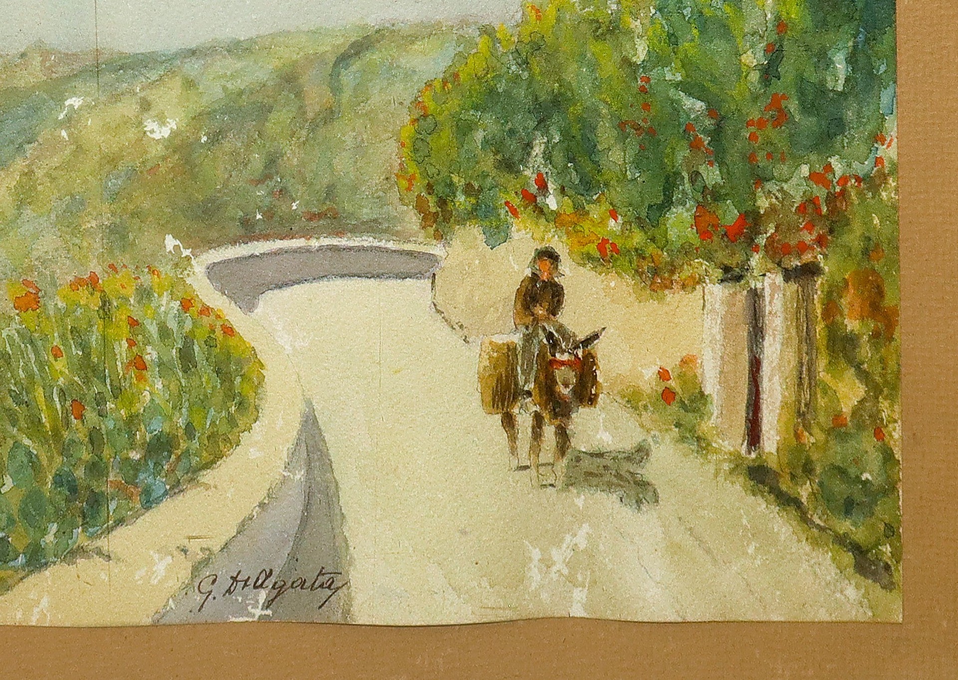 Gaetano D'Agata (1883 - 1949) - Scorcio di via Pirandello a Taormina con l'Etna sullo sfondo, 20° secolo h cm 24,5x33,5 in cornice h cm 44,5x51 Acquerello su carta Firmato in basso al centro G. D'Agata.