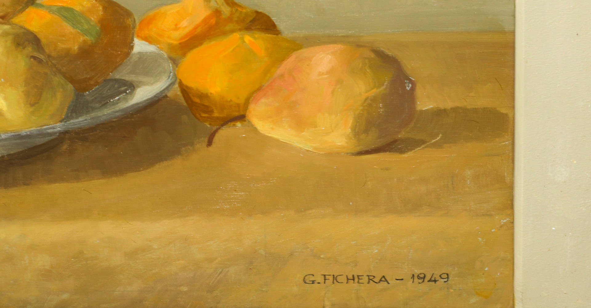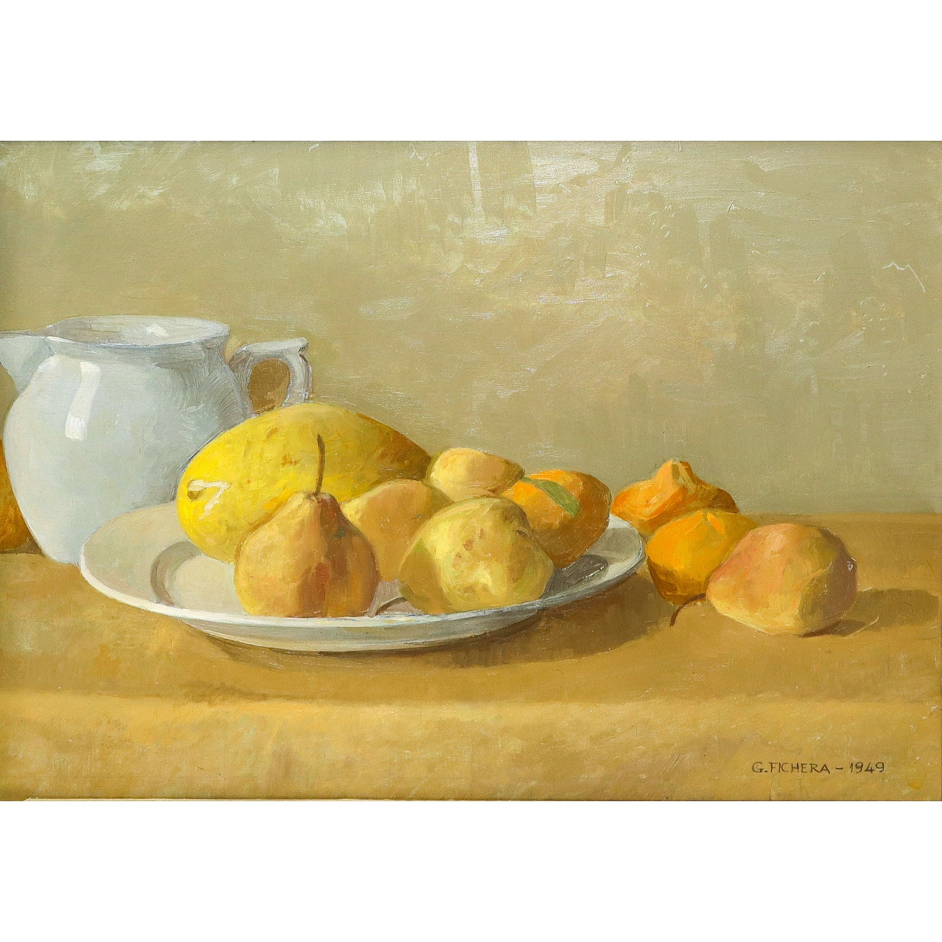Giovanni Fichera detto Occhiolà (Catania 1925) - Natura morta di frutti, 1949 h cm 35X48 in cornice h cm 62X64 Olio su compensato Questo lotto è soggetto a diritto di seguito