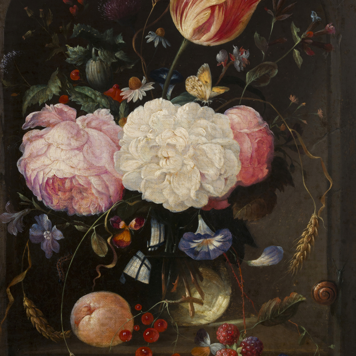 The work can be precisely referenced to the panel Still Life of Flowers in a Glass Vase with Insects and Fruits in a Stone Niche, lot no. 14, measuring 34,2 x 26,8 cm, signed "J.D.De Heem. R" lower right, auctioned on 7 December 2022 at Sotheby's in London.