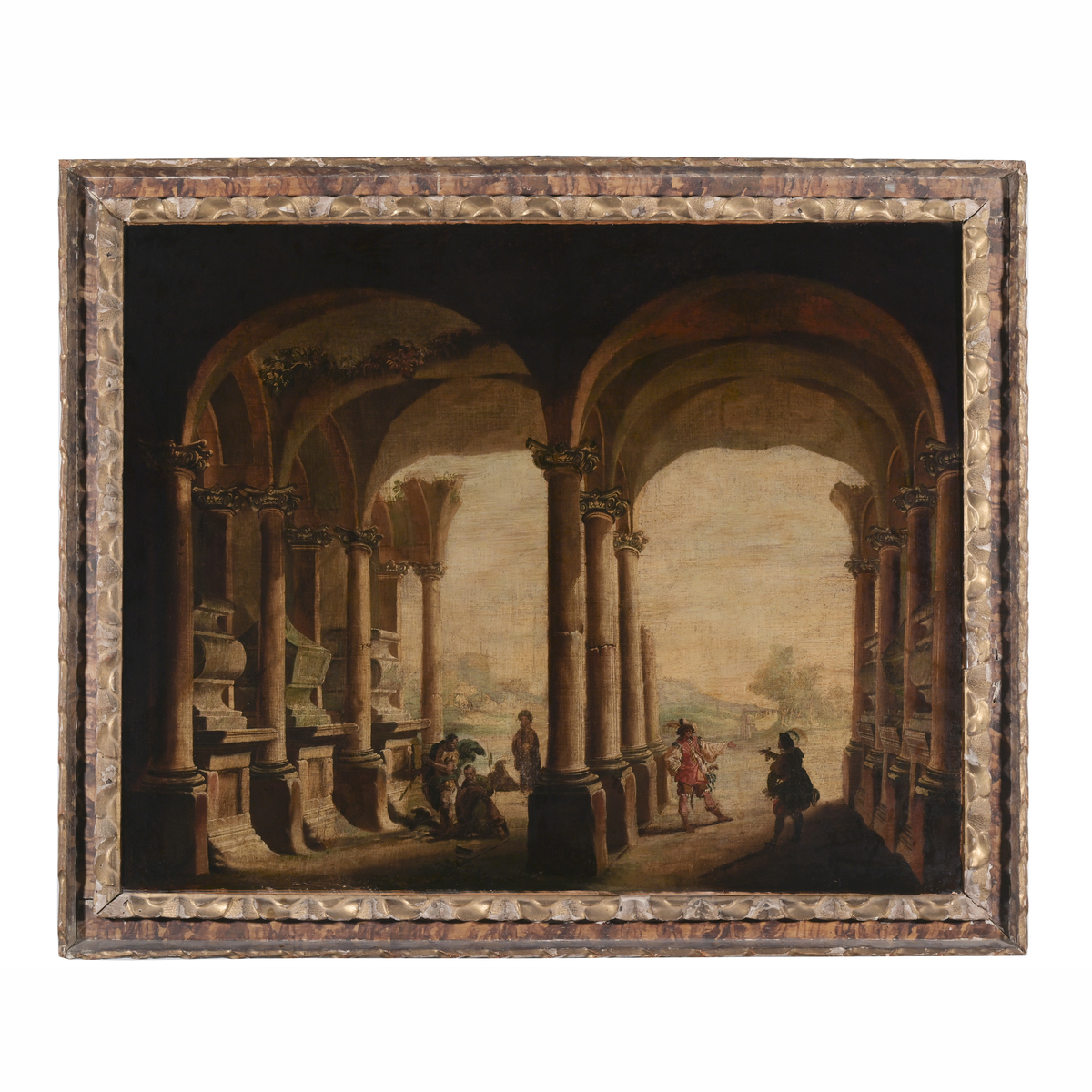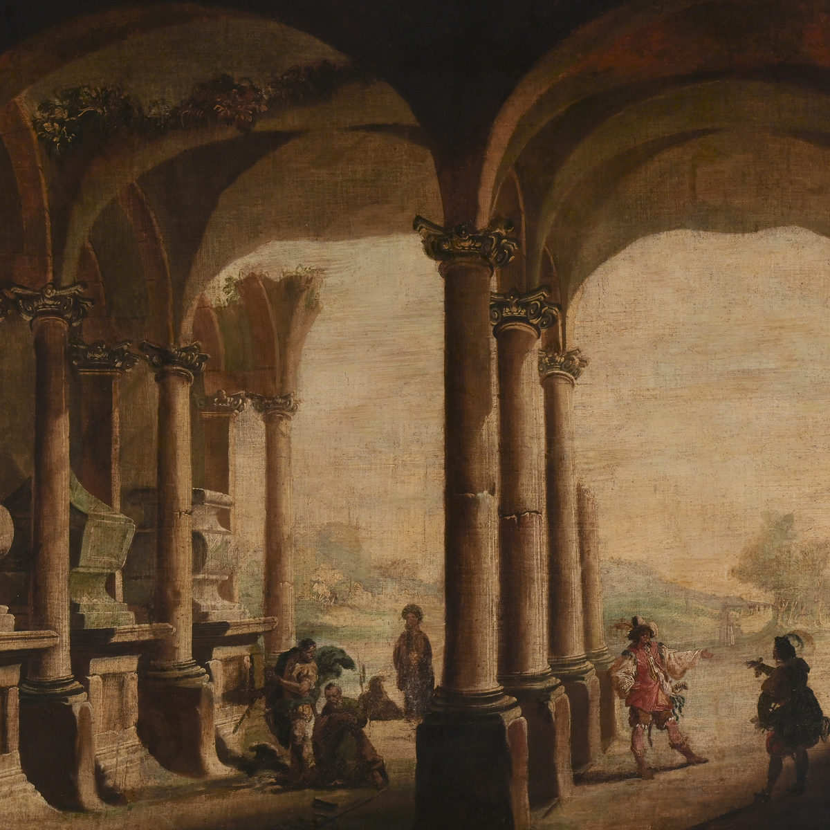 The work fits perfectly into the Roman painter's catalogue; it possesses all his characteristic features, from the heavy chiaroscuro and rigorous perspective to the figures and the hazy, misty landscape background. Comparative examples can be found in G. Sestieri, Il Capriccio architettonico in Italia nel XVII e XVIII secolo (Architectural Capriccio in Italy in the 17th and 18th Centuries), particularly in photo 24 on page 6 of volume II.