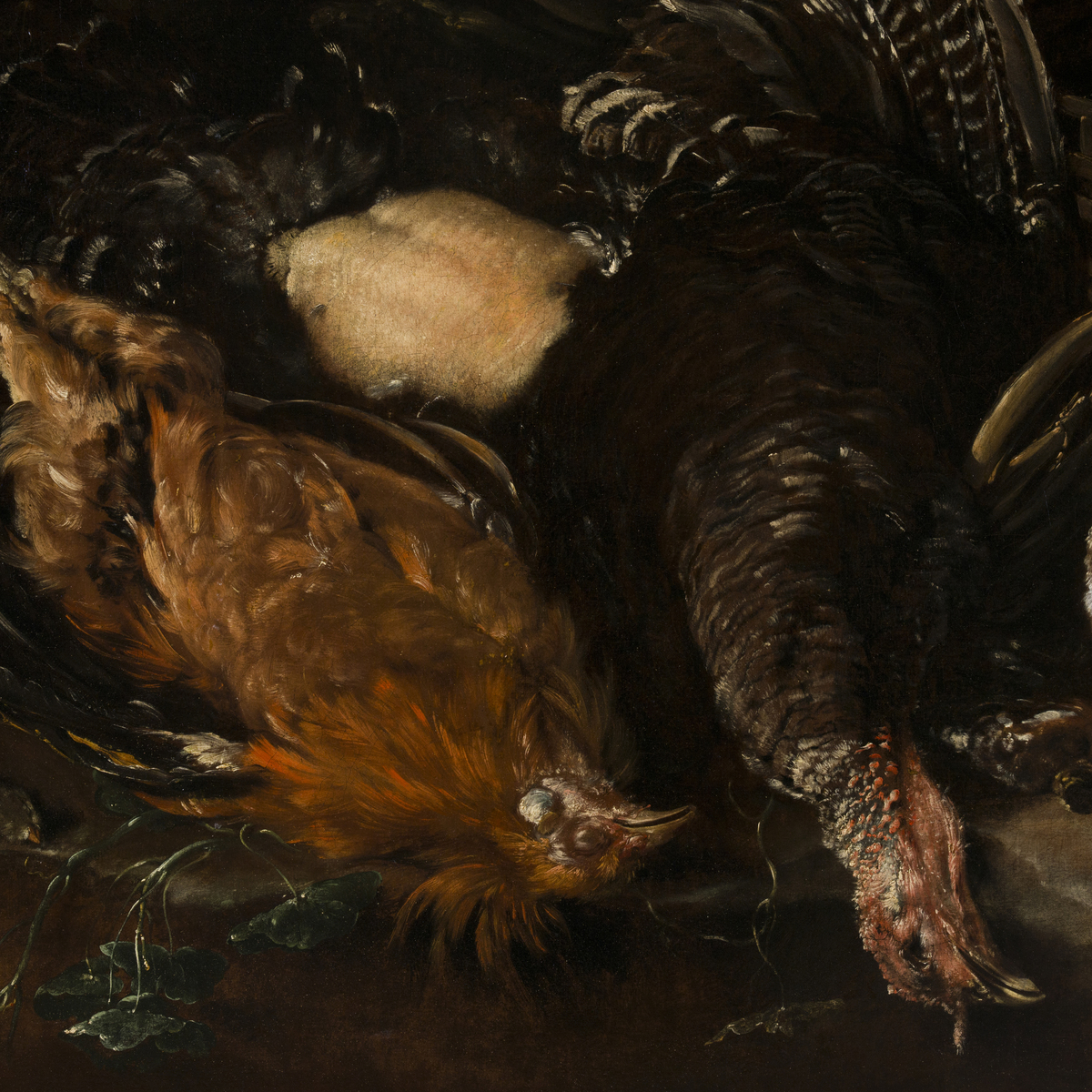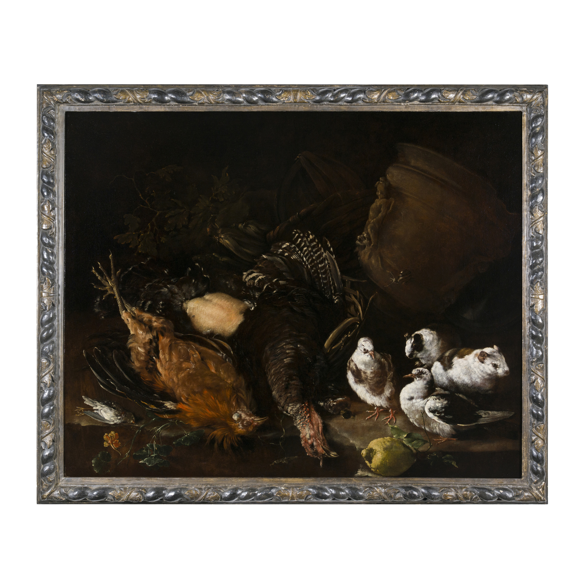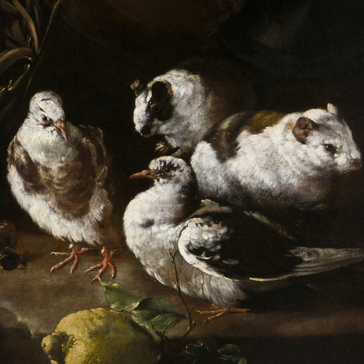 Historically attributed to Christoffel Puytlinck, the present work, upon closer inspection, reveals strong affinities with the paintings of F. W. Tamm: the composition unfolds along a diagonal descending to the right, with the animals arranged along the edge of a stone ledge; a lemon occupies the foreground, while guinea pigs and pigeons appear among the group, all enveloped in a warm light. Comparative examples are illustrated in M. Gregori, La natura morta italiana da Caravaggio al Settecento, pp. 406 - 409.