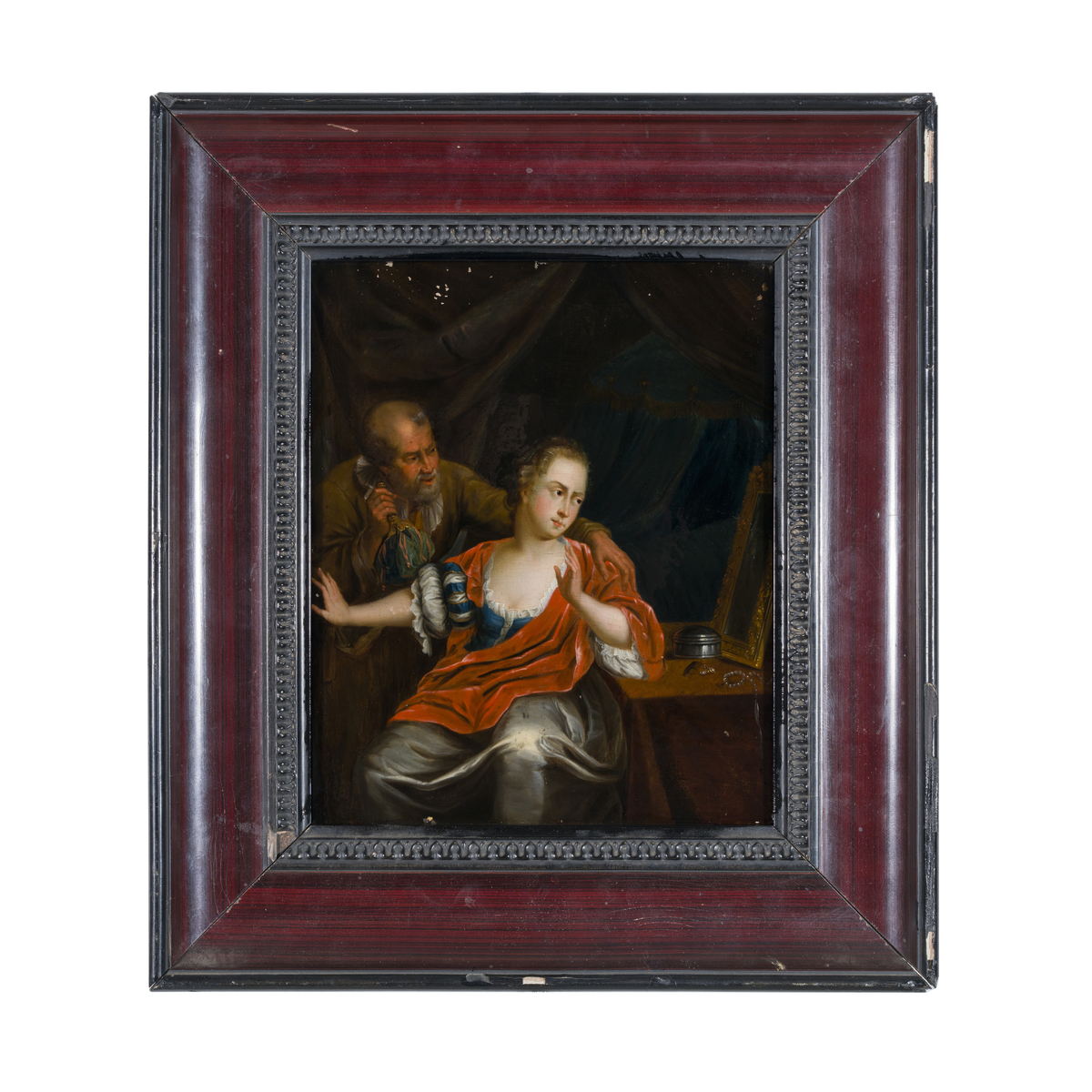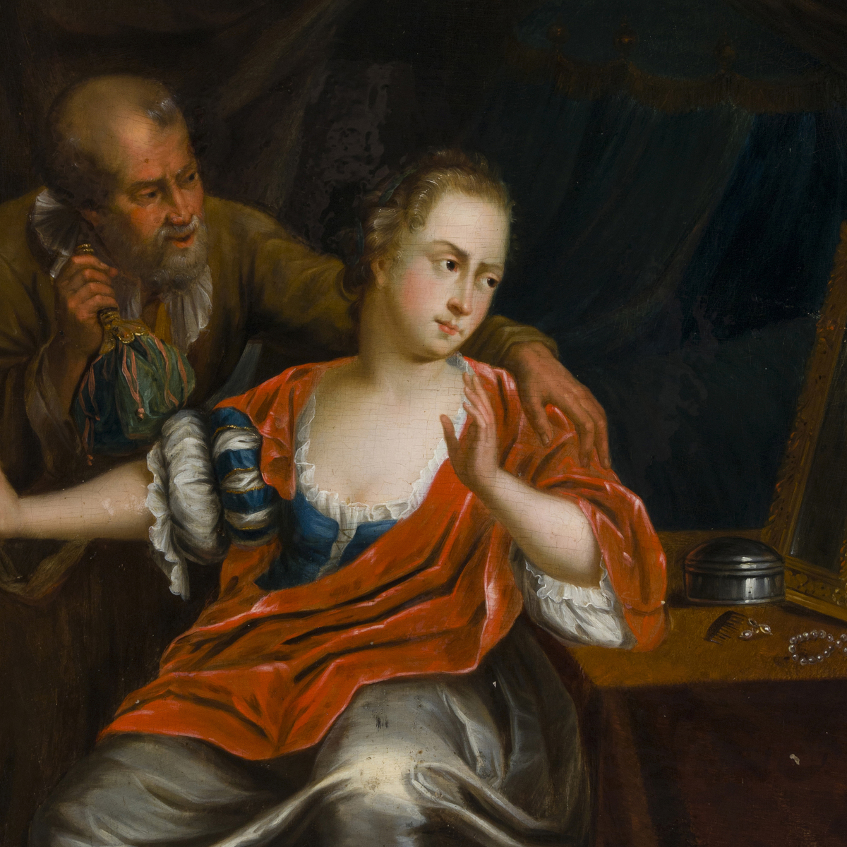 The work is based on a painting by Mieris the Elder that was once part of the collection of Count Heinrich von Brühl, Prime Minister to the King of Poland. Although the work was made public through an engraving by Élie Menil (Mesnil), copies of this subject are extremely rare.
