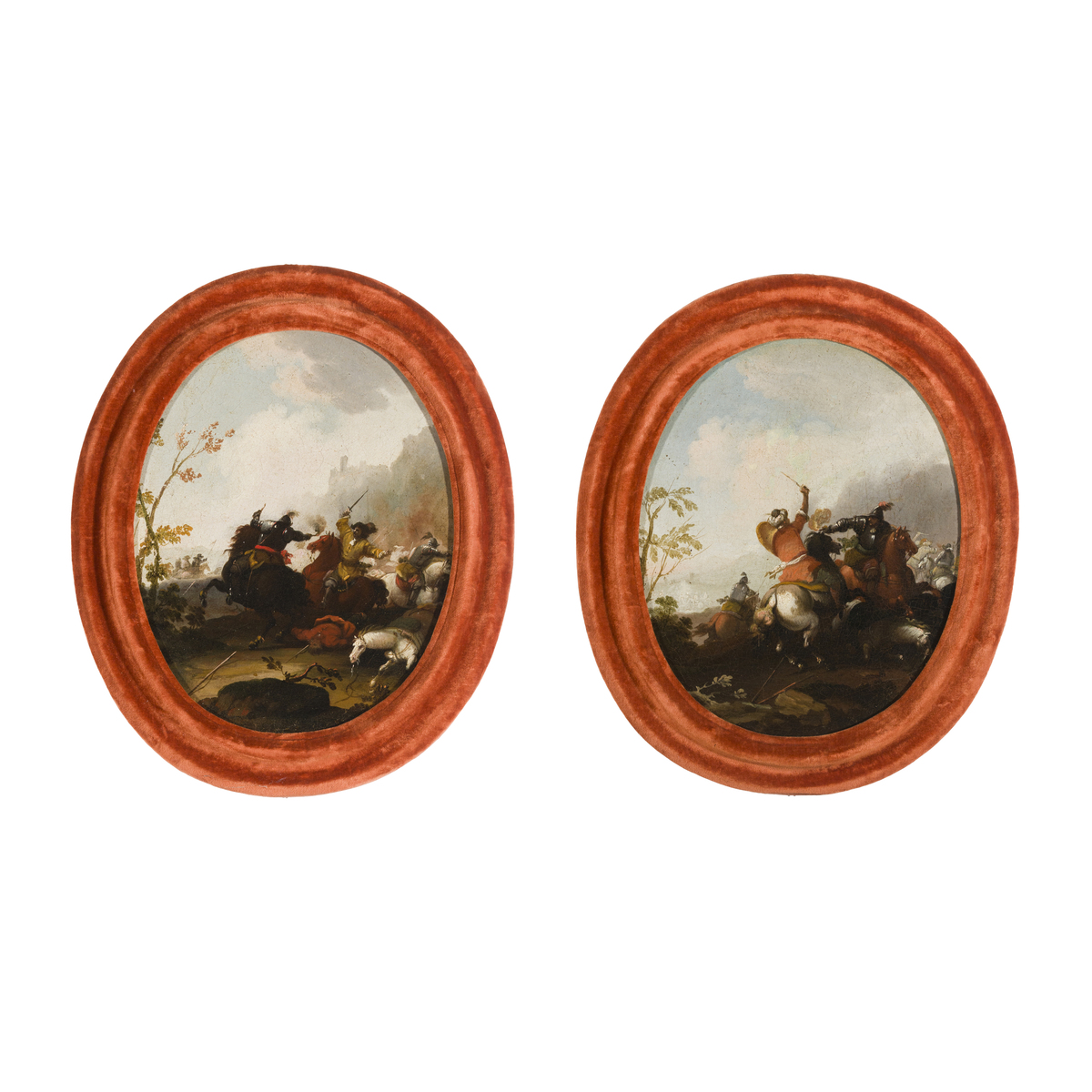 The perpendicular compositional scheme with the clash between two moving horsemen at the centre is peculiar to Masturzio's production, as is, in the small formats, the rarefied representation of the landscape, dominated by the omnipresent cloud of smoke bending in the wind. For an extensive and comprehensive comparison, you should see the book Pittori di battaglie (Painters of Battles) by Gianfranco Sestieri.