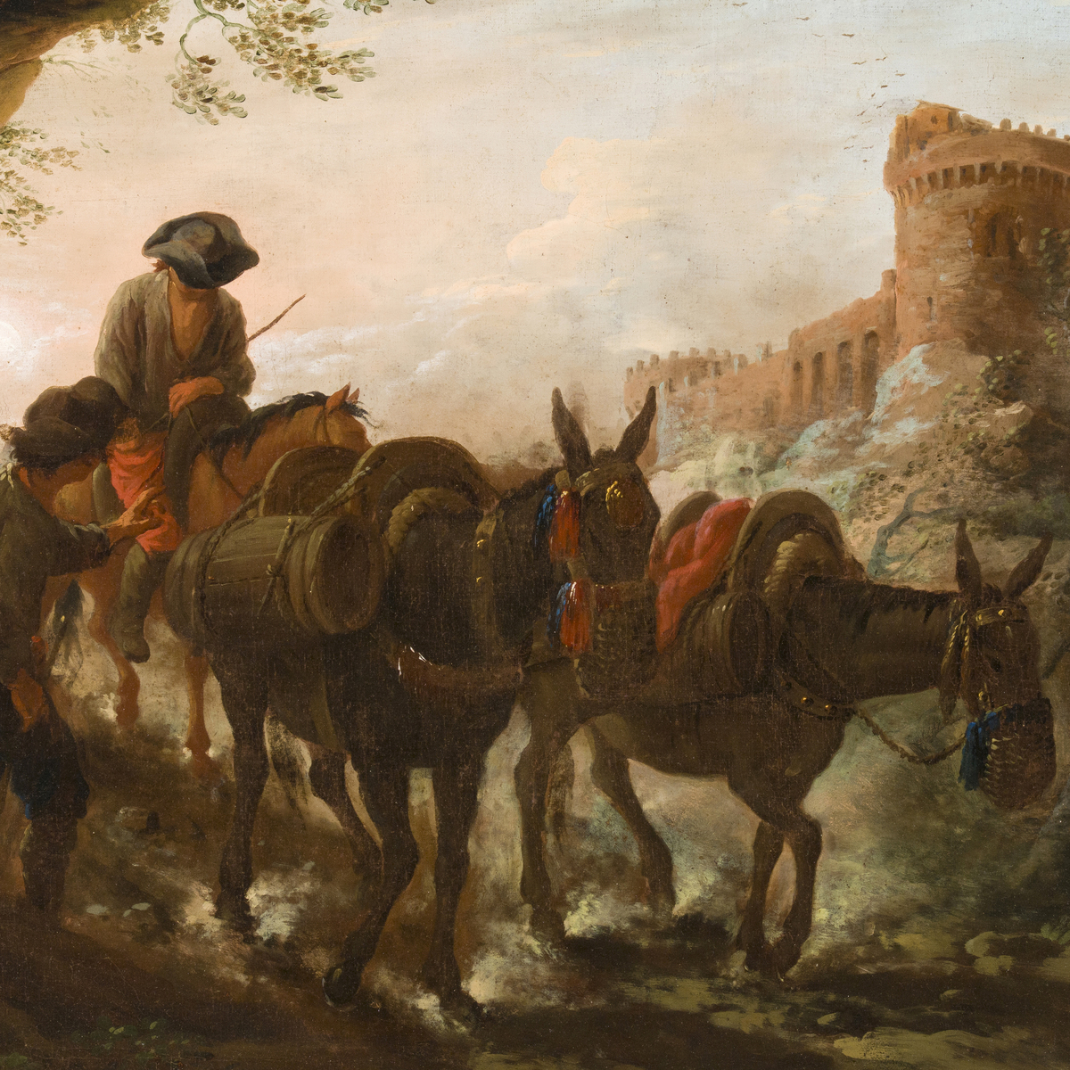 The setting of the scene recalls the Venetian painters, particularly Marco Ricci. The landscape, however, reveals the influence of François Boucher, where nature is imbued with a suffused atmosphere, an expression of rocaille elegance. Numerous museum references offer comparisons: "Landscape" and "Shepherd with a Cow near a Fountain" from the Lille Museum, various drawings of landscapes and everyday life in the Louvre, "Shepherds and Flocks at the Fountain" from the Albertina in Vienna, and the painting "Country Landscape" from the Palatinate Museum in Heidelberg, to name a few.