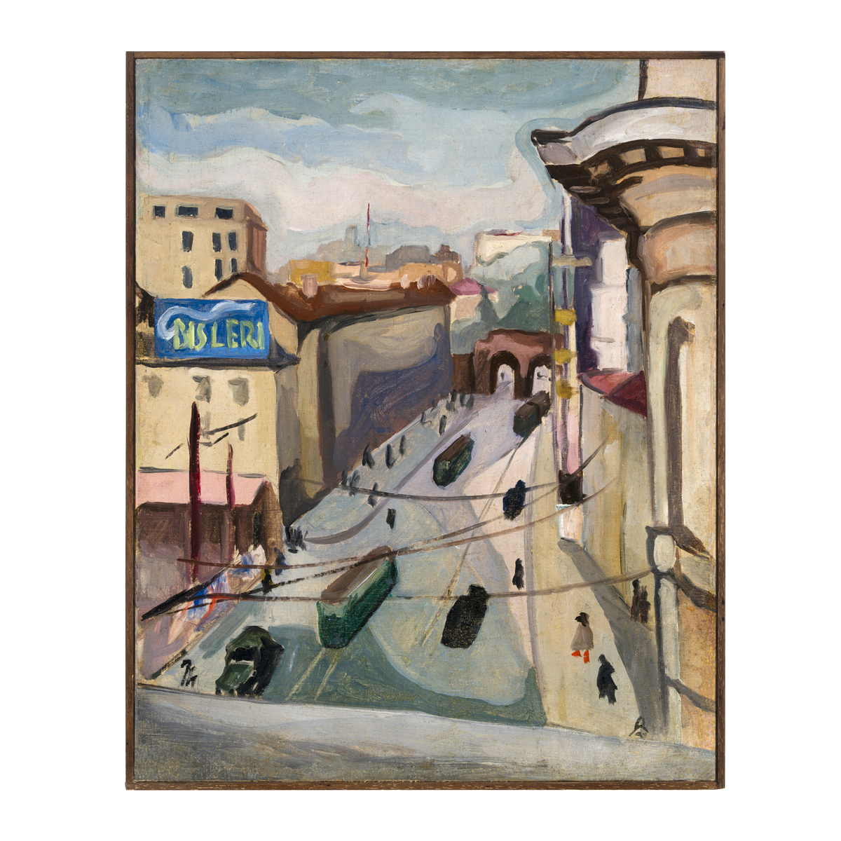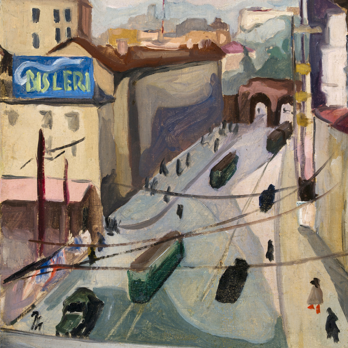 Veduta di via Manzoni con insegna pubblicitaria Bisleri