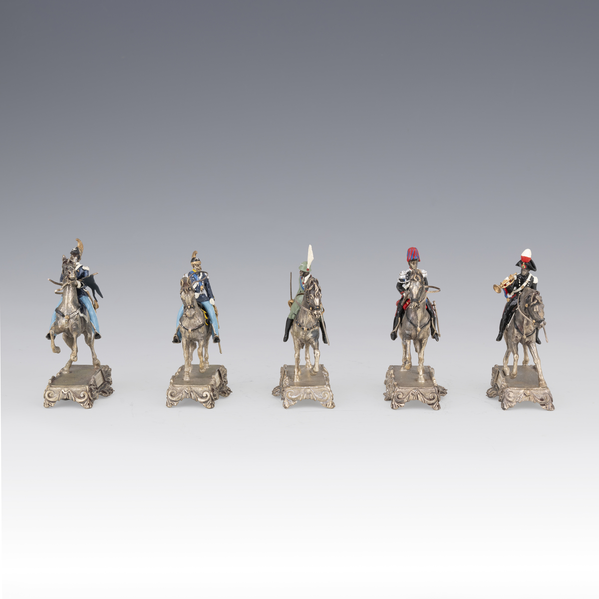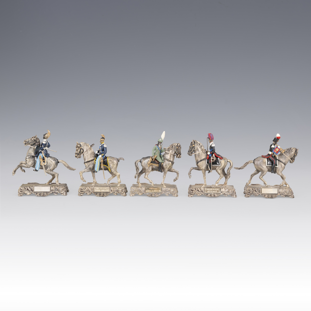 Cinque militari in divisa a cavallo in argento smalto