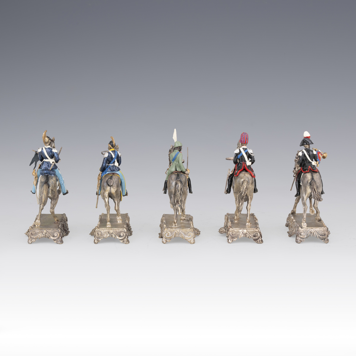 Five uniformed soldiers on horseback in enamelled silver