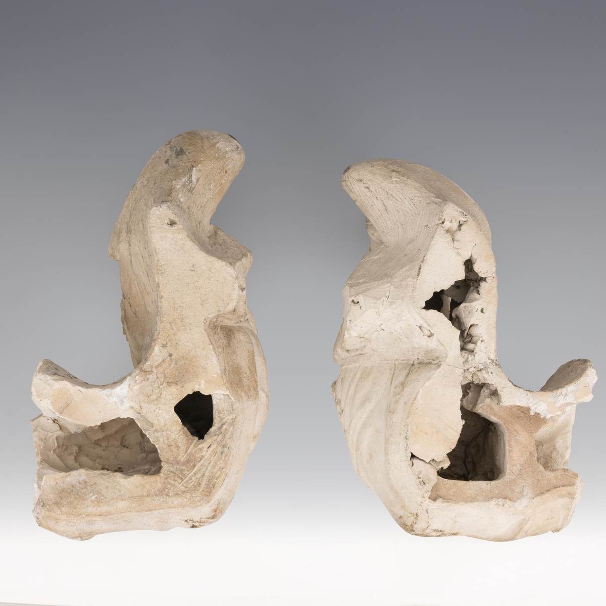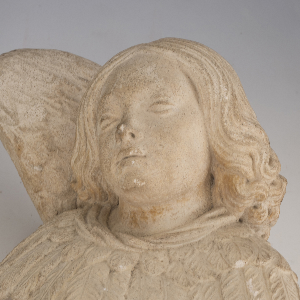 The two angels reflect the aesthetics of Lombard Renaissance models. However, their round, swollen faces and very neat hair reveal a northern accent, which we find, for example, in German sculpture. These features lead us to attribute them to the upper Lombardy area in the early 16th century, where artistic fusions between Lombard, Tyrolean, and Swiss cultures produced similar results. The absence of arms probably implies that they were intended to hold a crown or other attribute within a sculptural complex that we can easily imagine to have been of the highest quality.