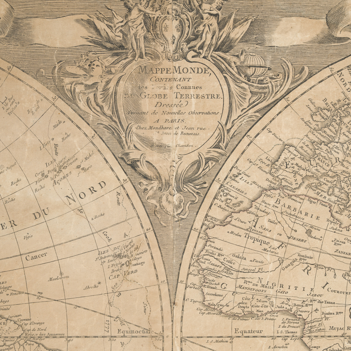 Published "Chez Mondhare et Jean de Beauvais" in Paris, as indicated in the decorative cartouche.